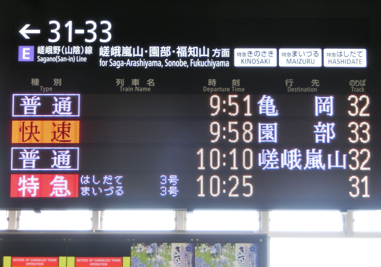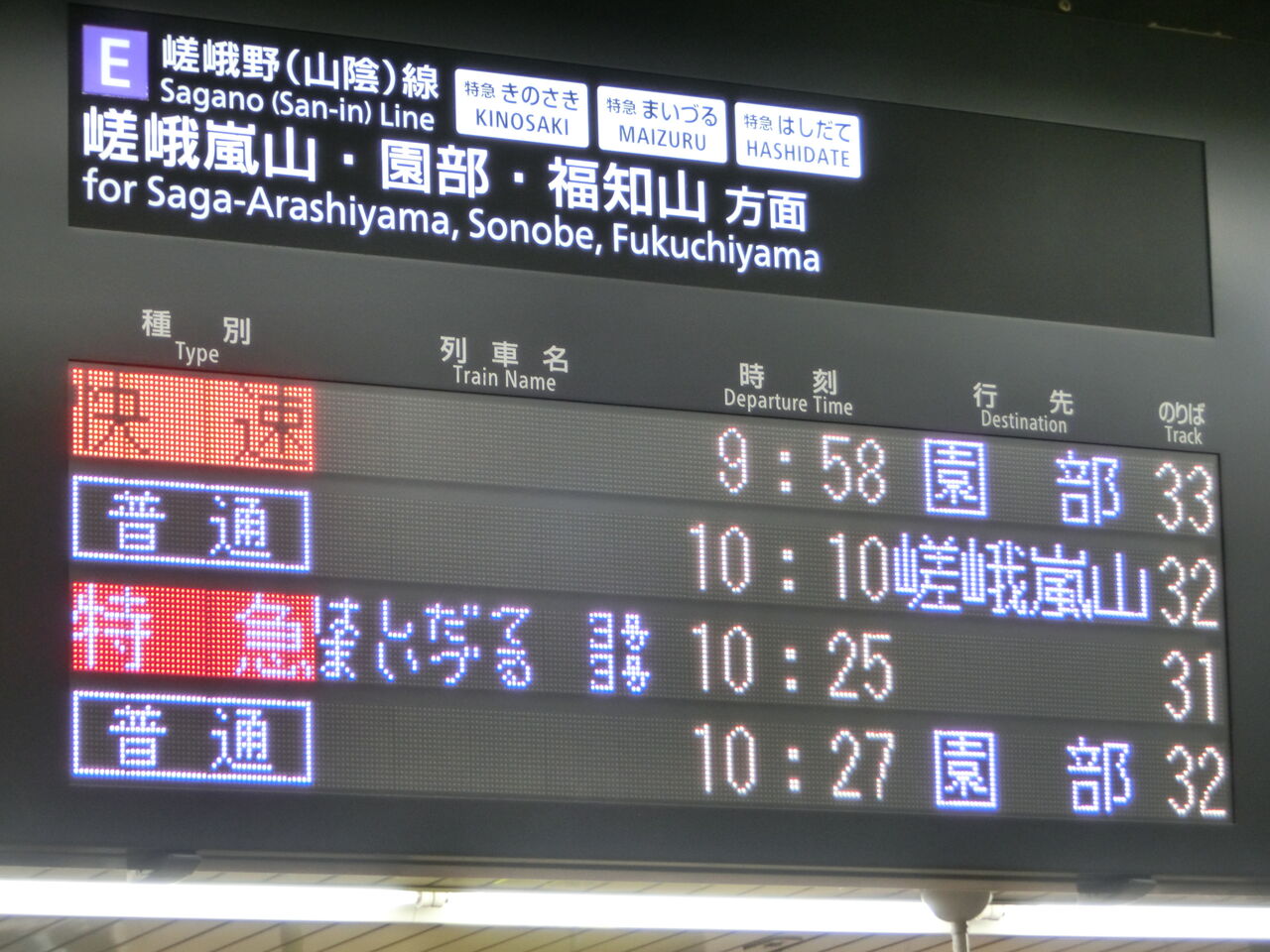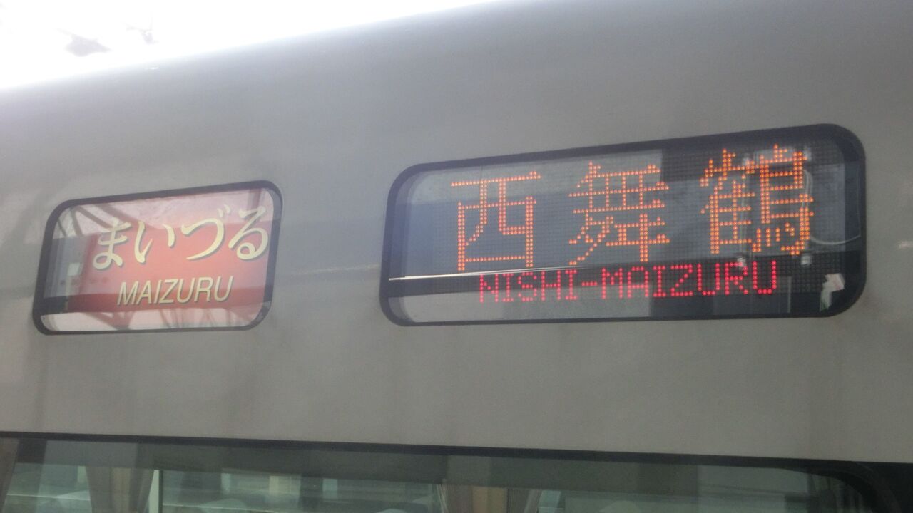 行き先は無表示ですが、一番下の段に流れるスクロール表示には 「福知山・西舞鶴行き」と表示されていました。