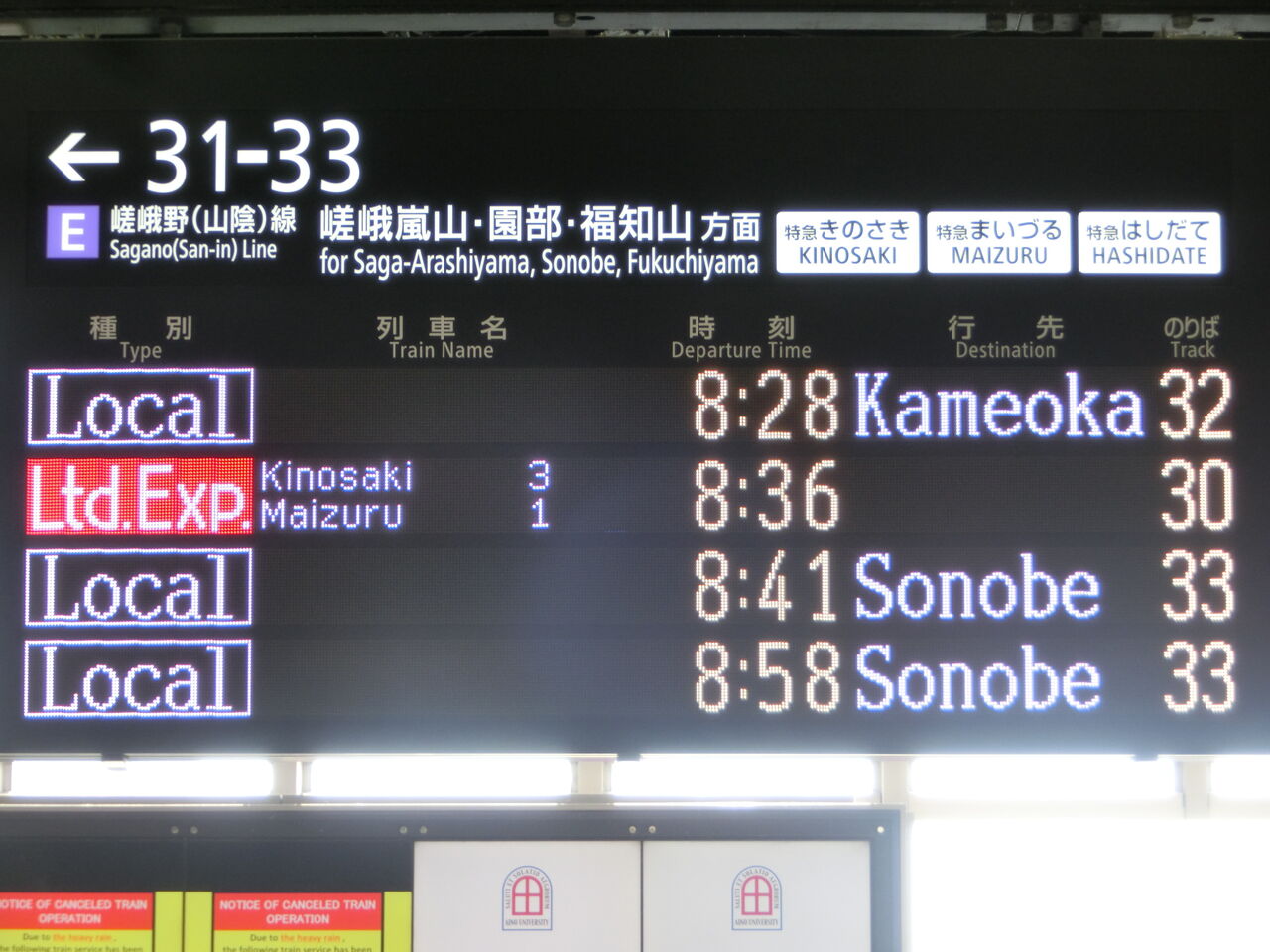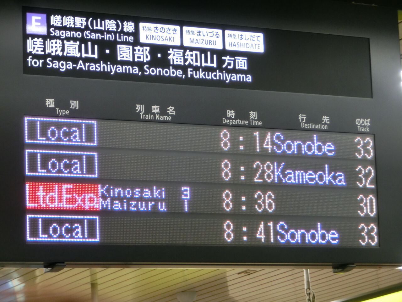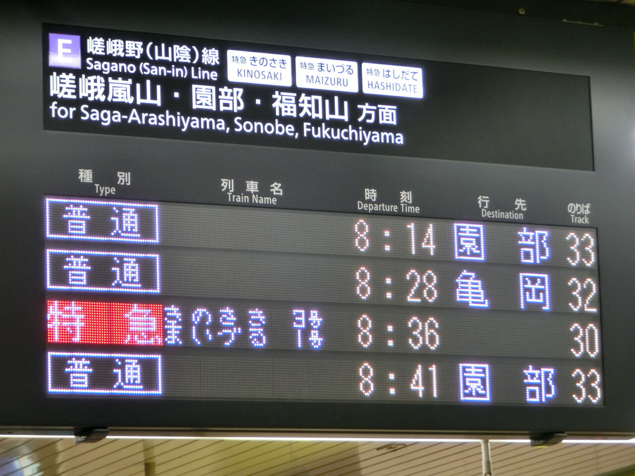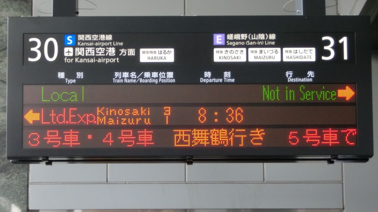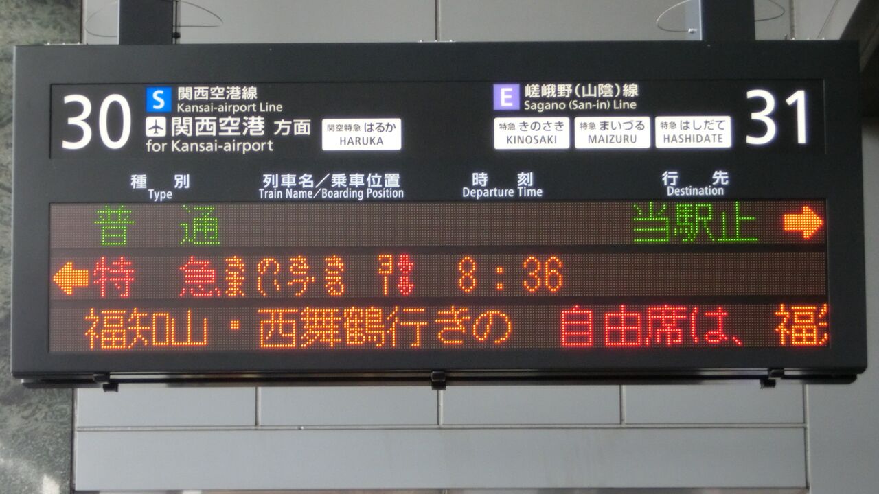 8:36発の列車は、福知山行きの 特急 「きのさき」 と併結運転しており、通常なら 行き先欄に 「福知山・東舞鶴」 と表示されます。
