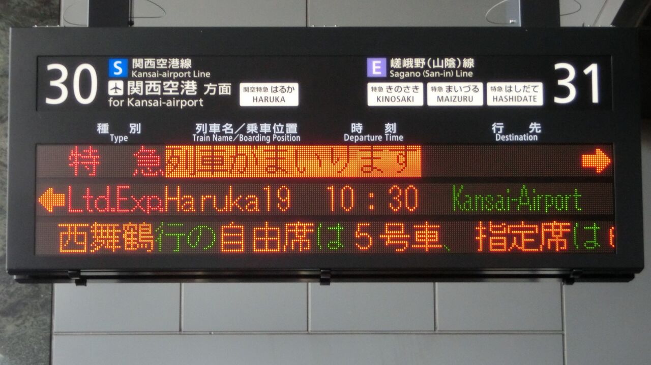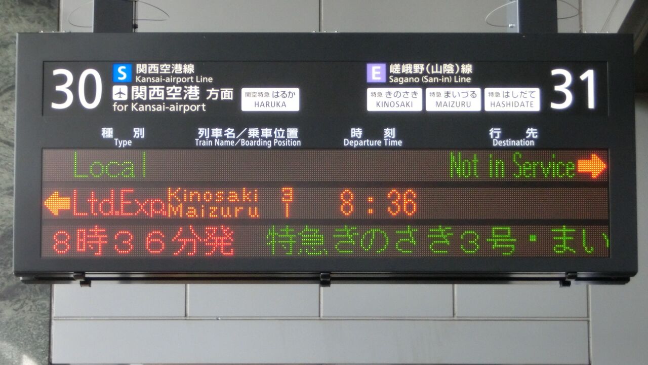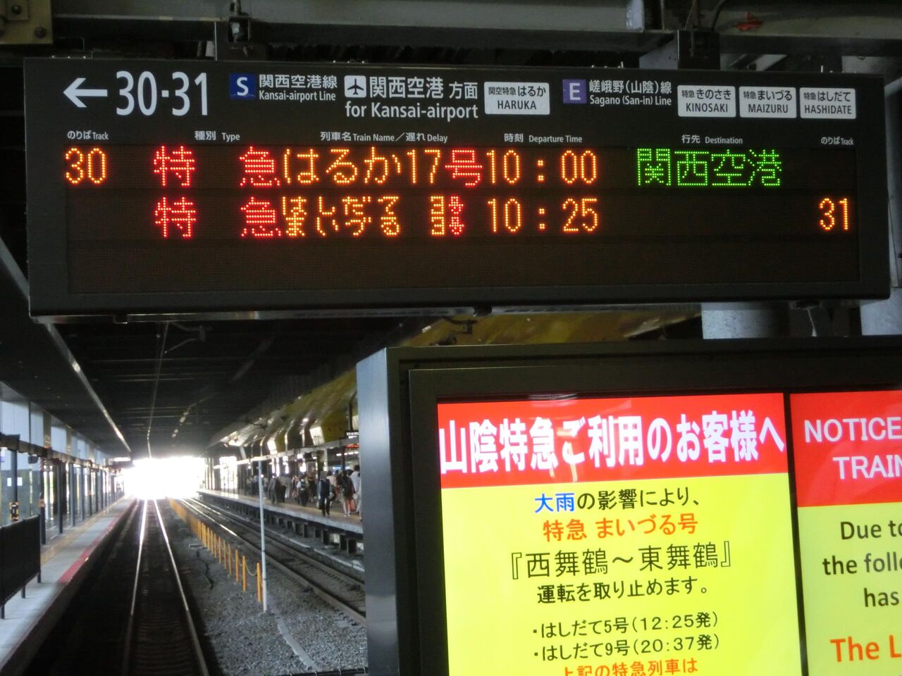 山陰本線の特急は 基本的に31番のりばから発車しますが、8:36発の列車は 関空特急 「はるか」のホームである30番のりばから発車していました。