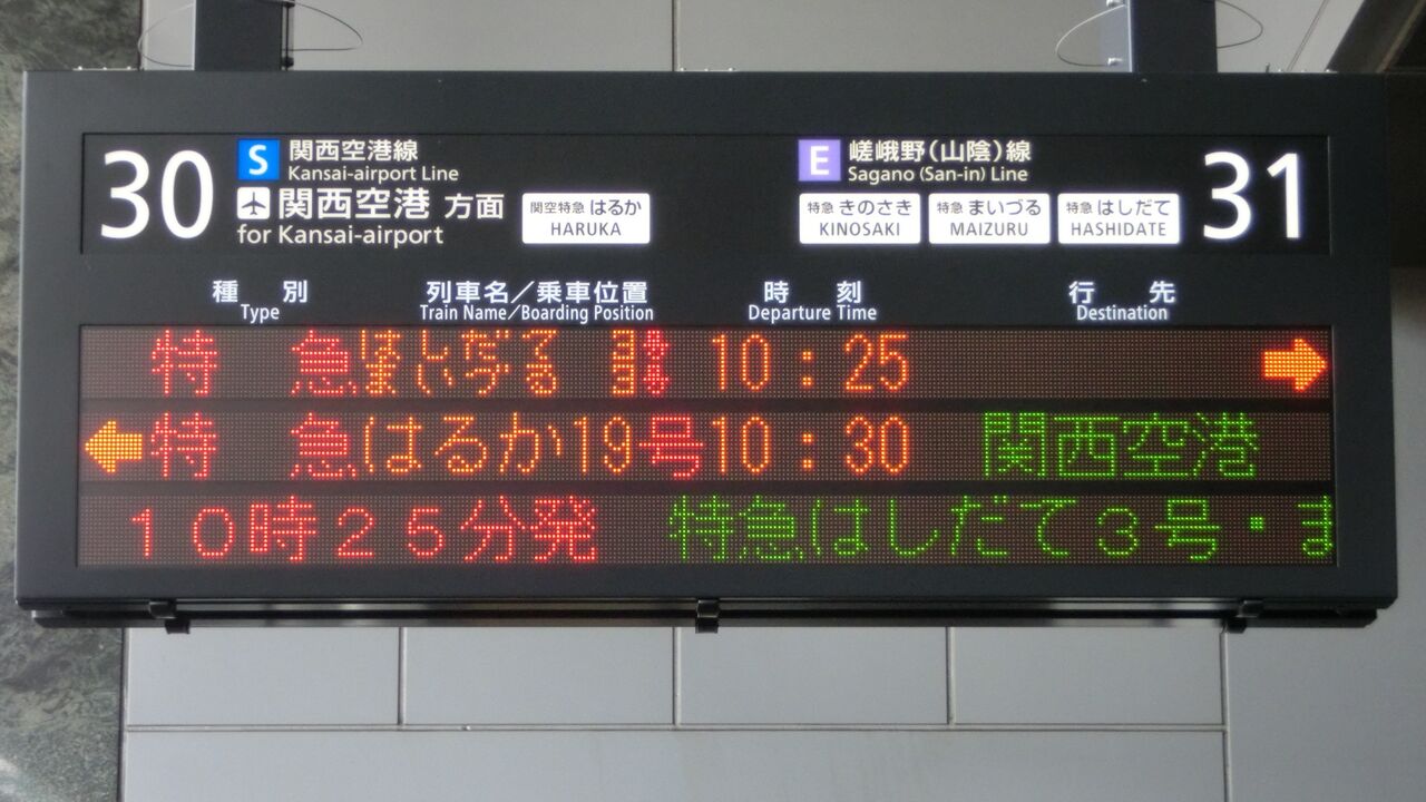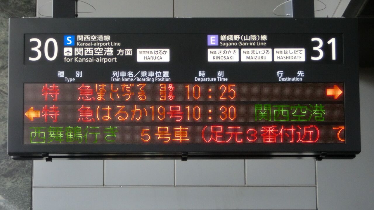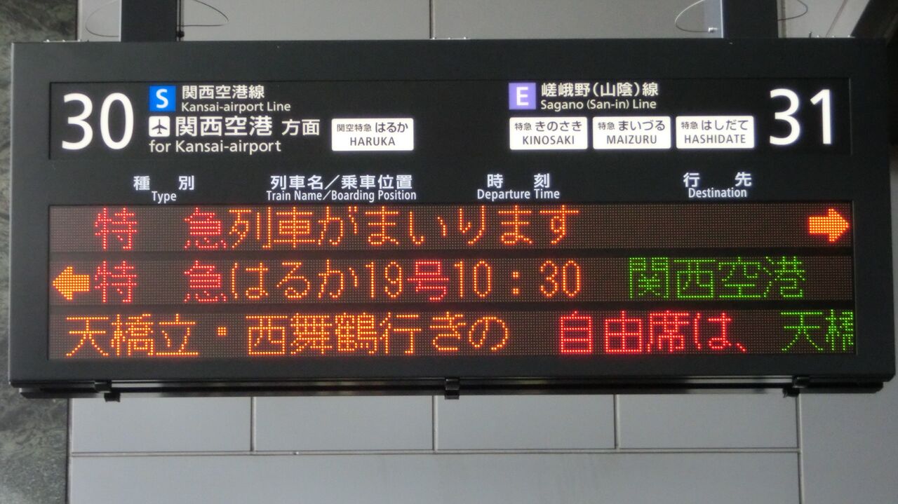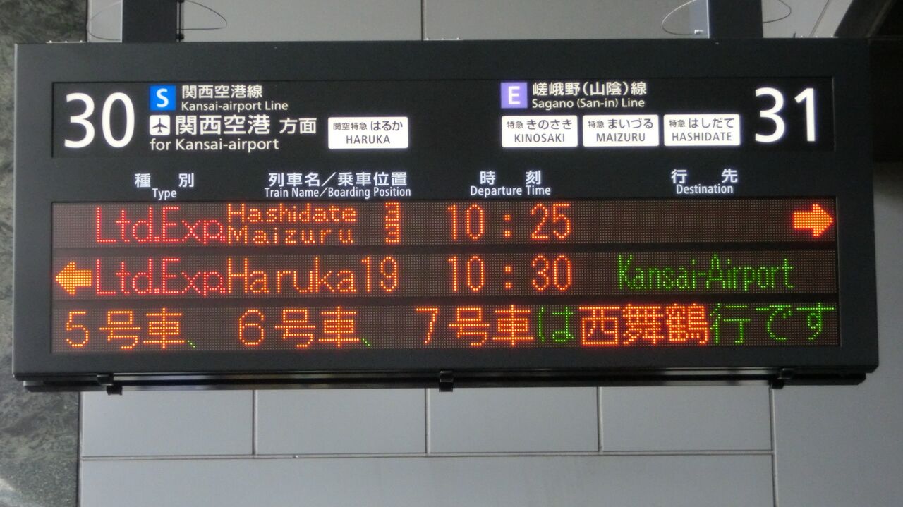 山陰本線の特急は 基本的に31番のりばから発車しますが、8:36発の列車は 関空特急 「はるか」のホームである30番のりばから発車していました。