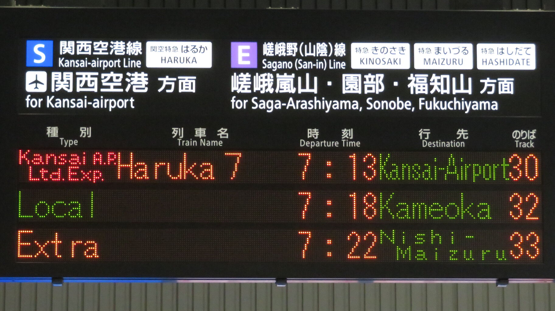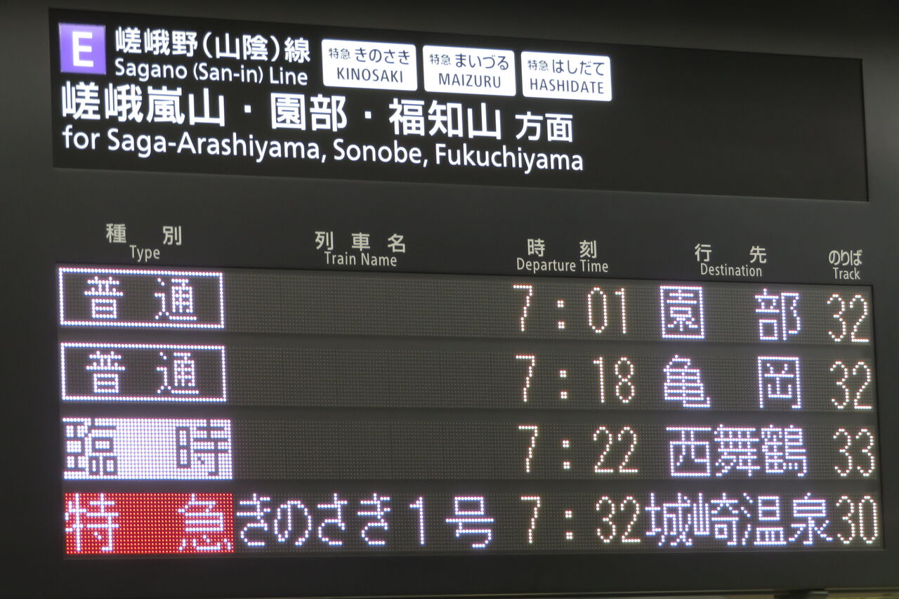 6時37分発の普通 園部行きが発車すると、一番下の段に特急 「きのさき1号」 城崎温泉行きが表示されました。