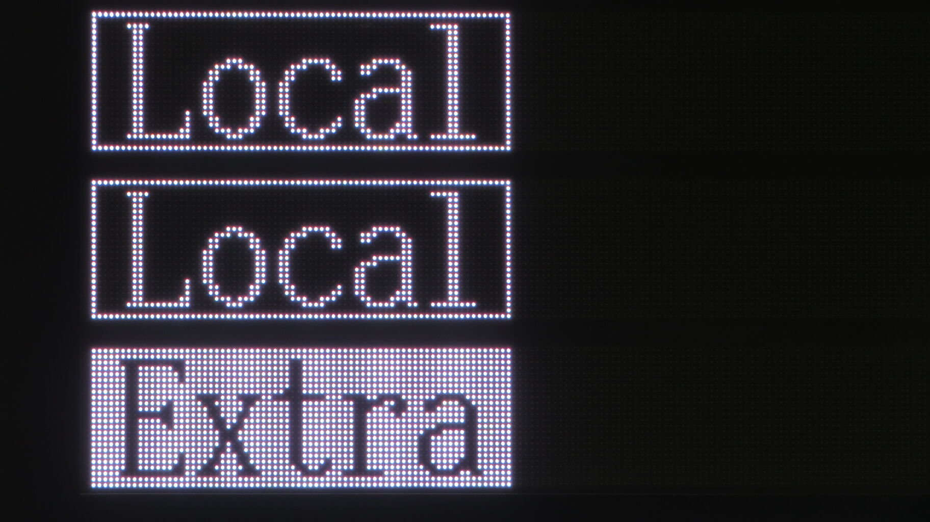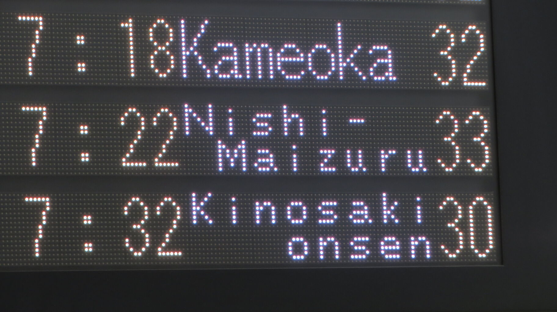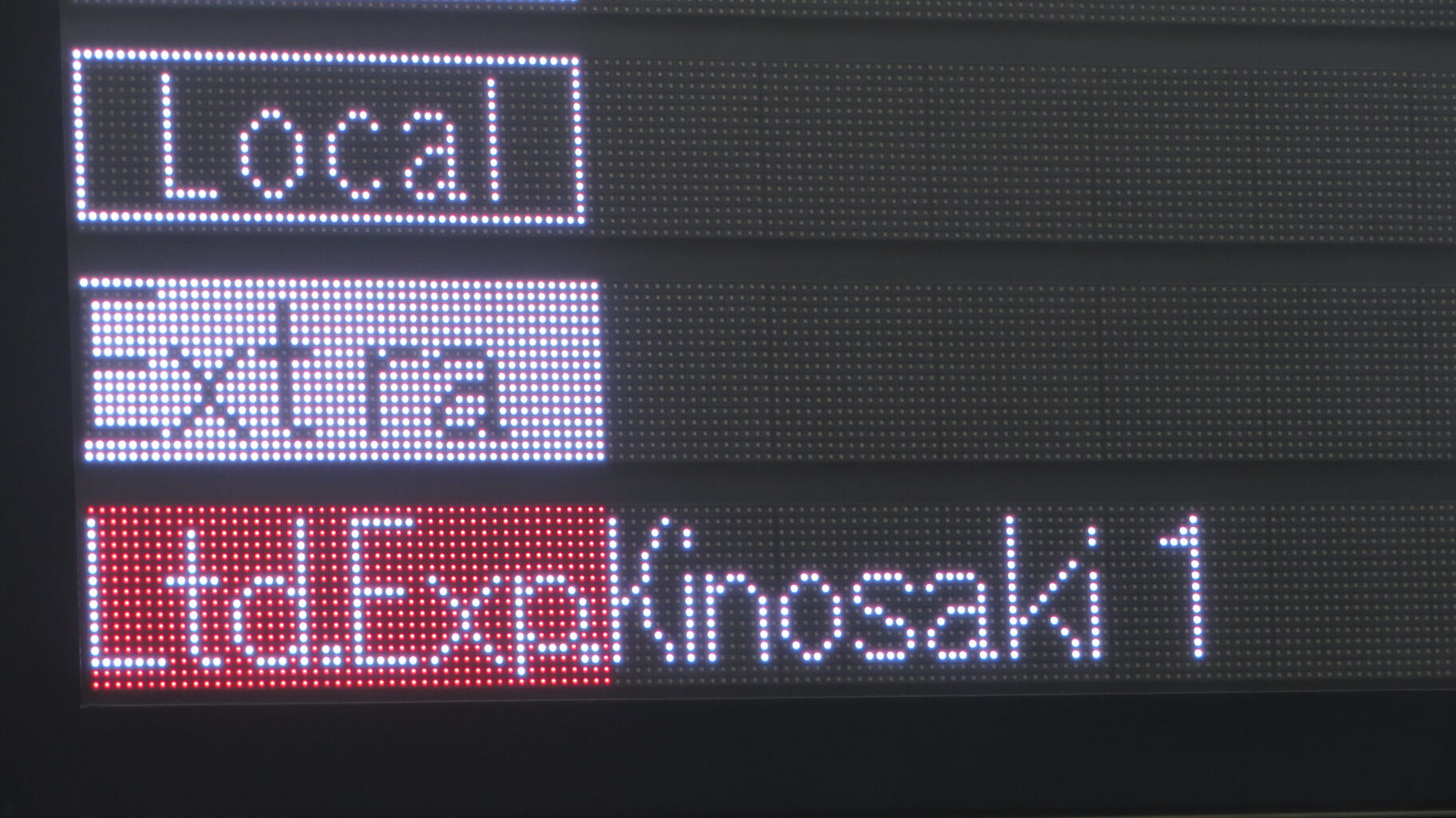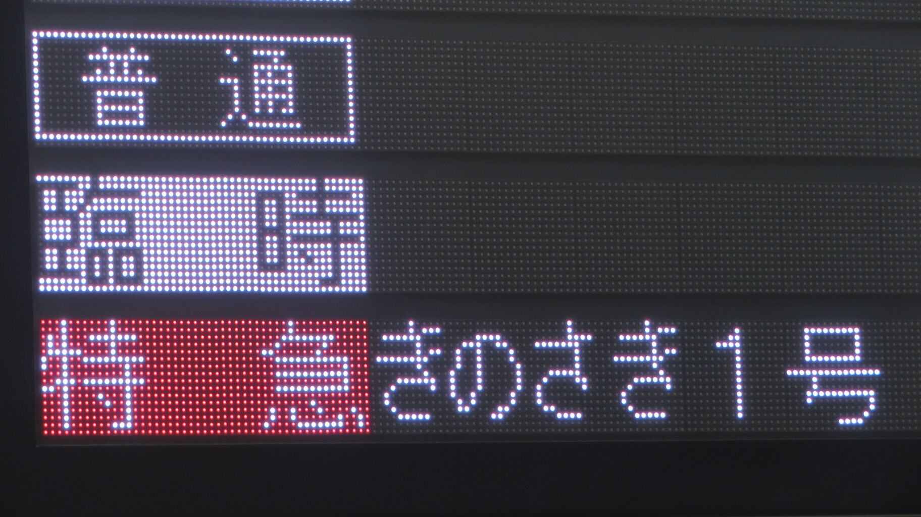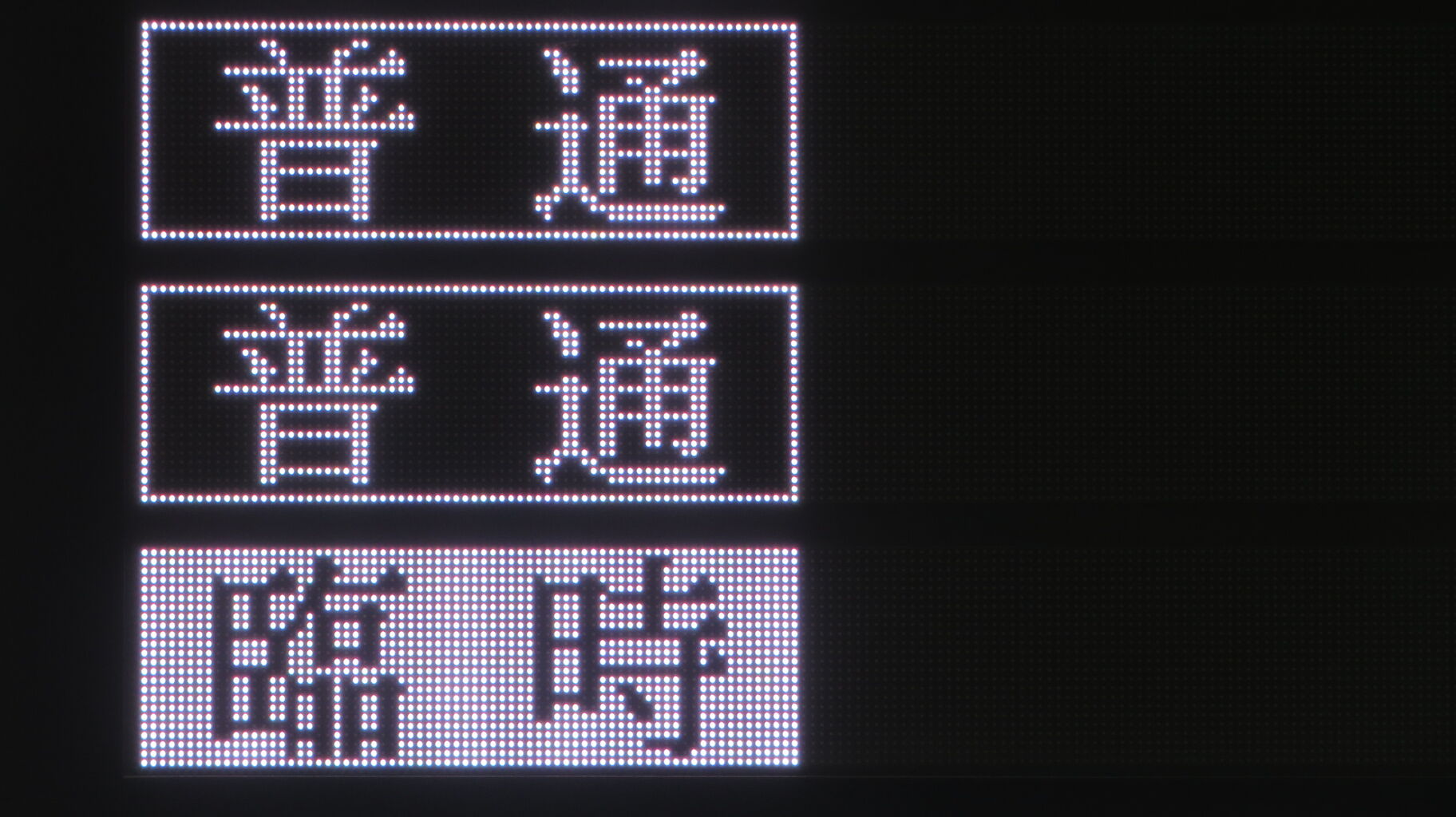 先ほどのフルカラーLED発車標と異なり、表示される文字のフォントが 3色LEDの発車標と同じです。