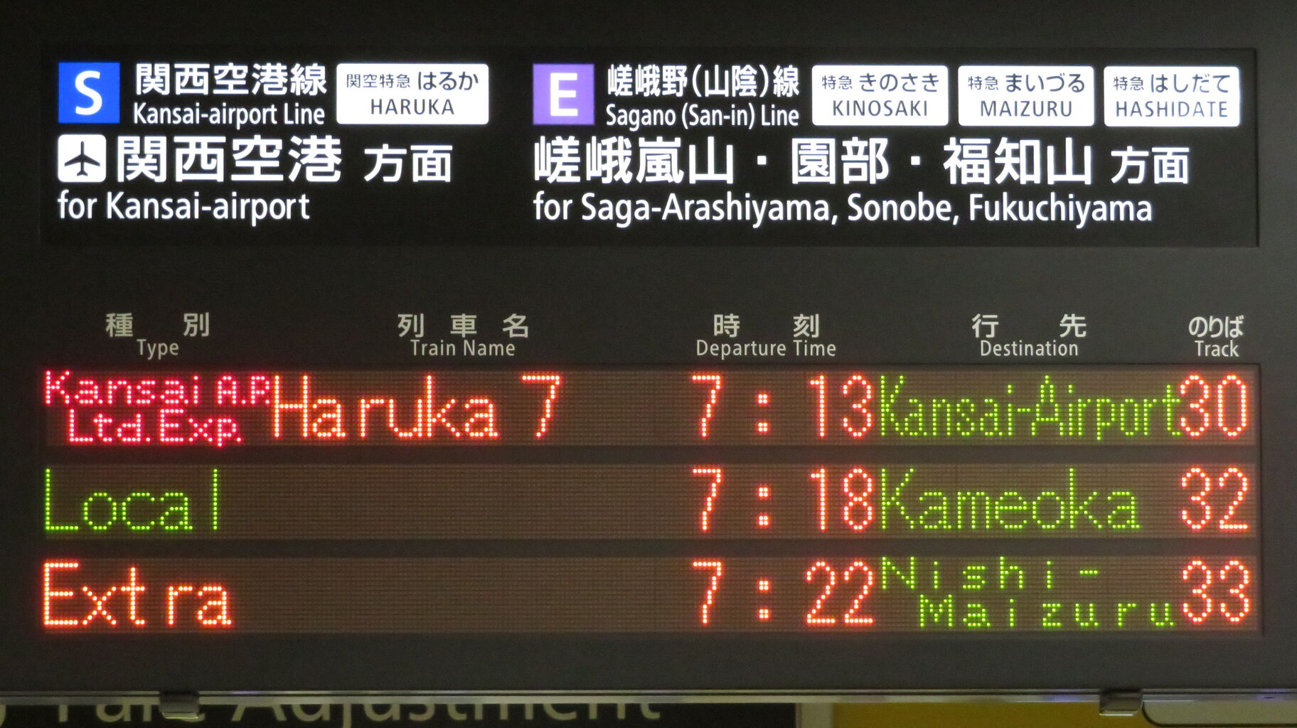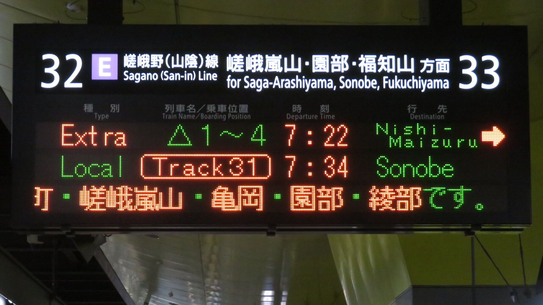 真ん中の段には、隣のホーム 31番のりばから発車する普通 園部行きが表示されています。