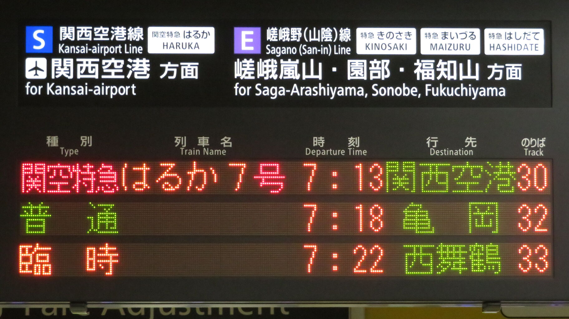 フルカラーLED発車標では、「臨時」 が 白地に黒文字で表示されていました。
