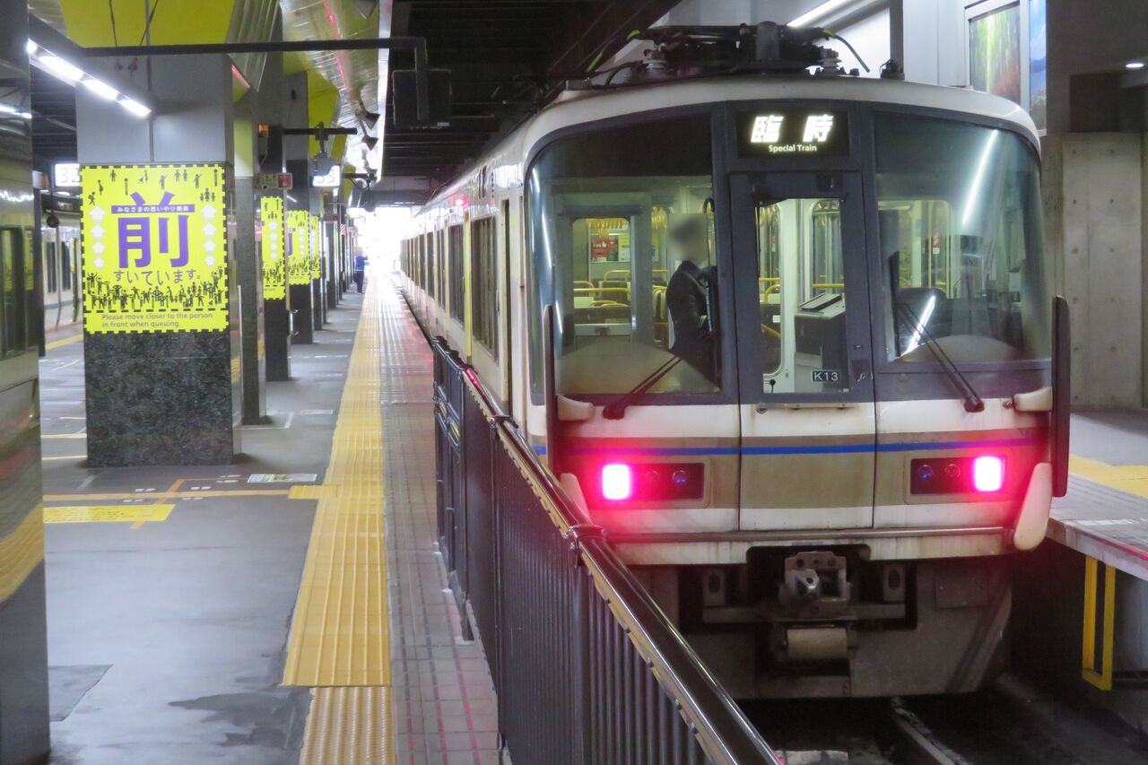 臨時快速は、途中の嵯峨嵐山駅で 後続のきのさき1号に追い抜かれます。