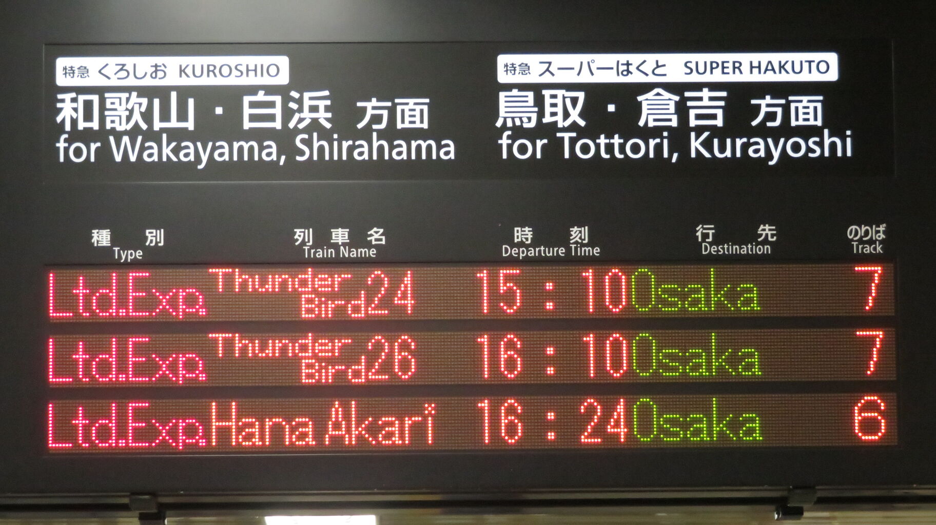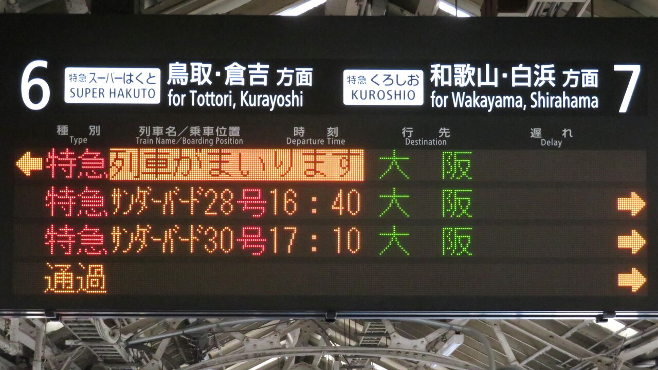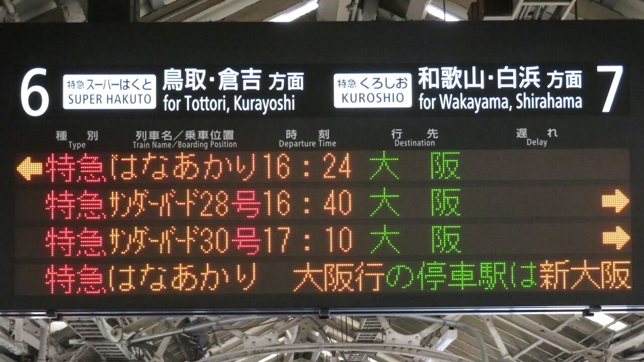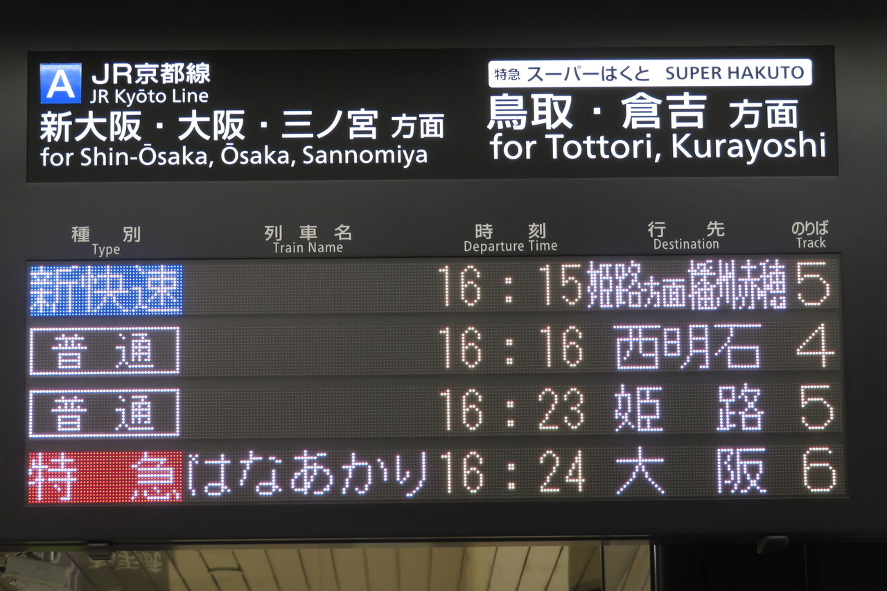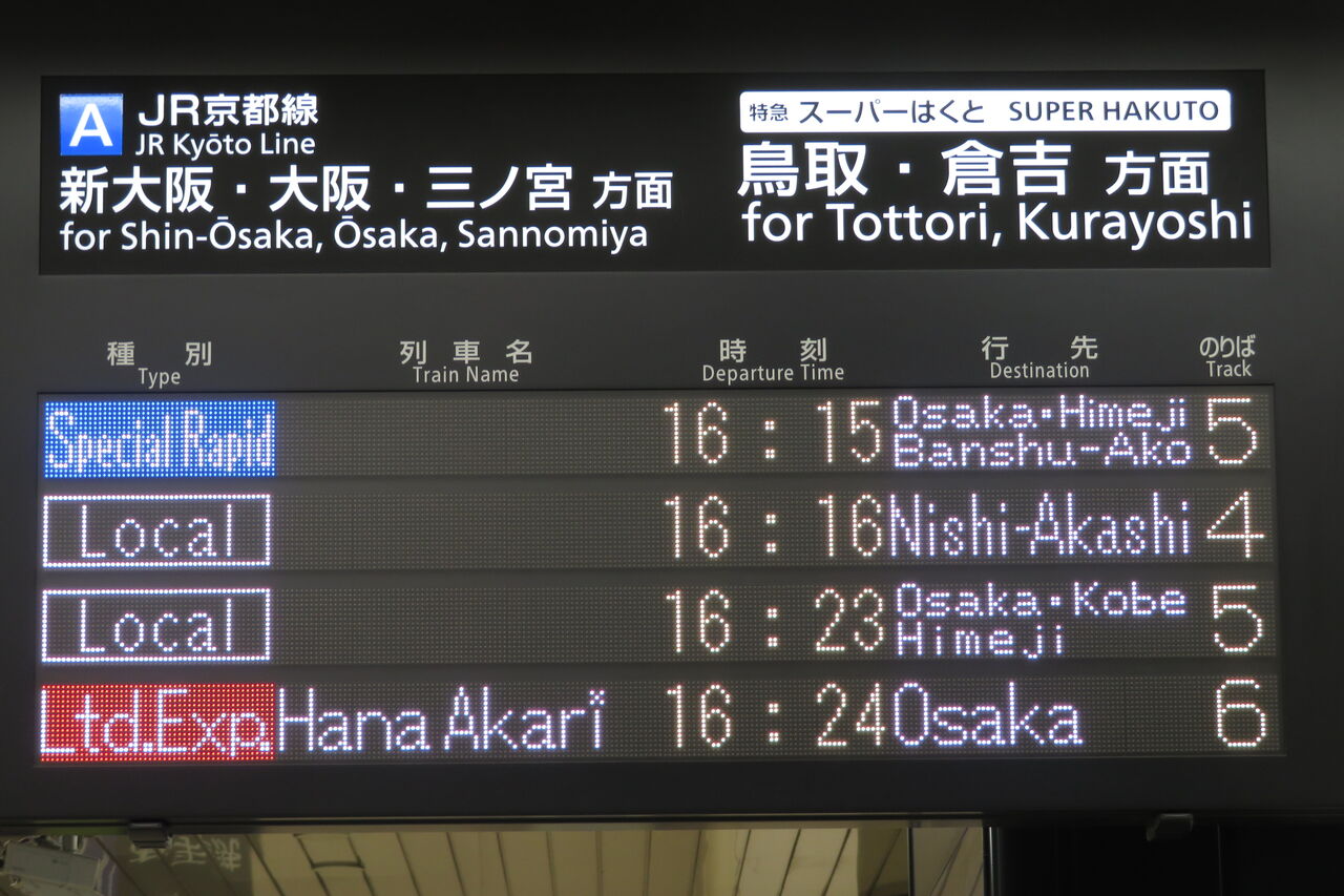 そのため、14時台の時点で、発車標に 16時24分発の 「はなあかり」 大阪行きが表示されていました。