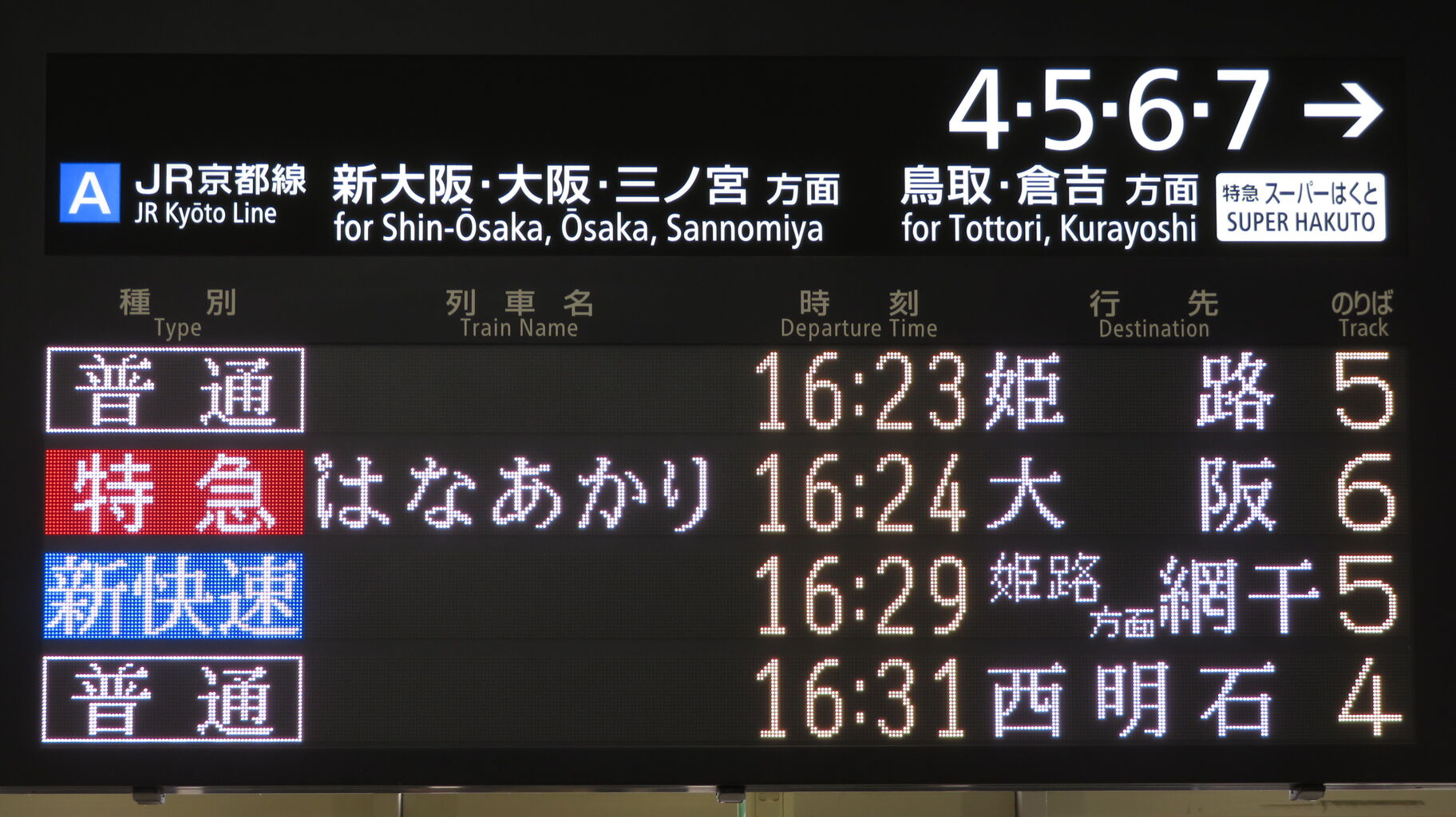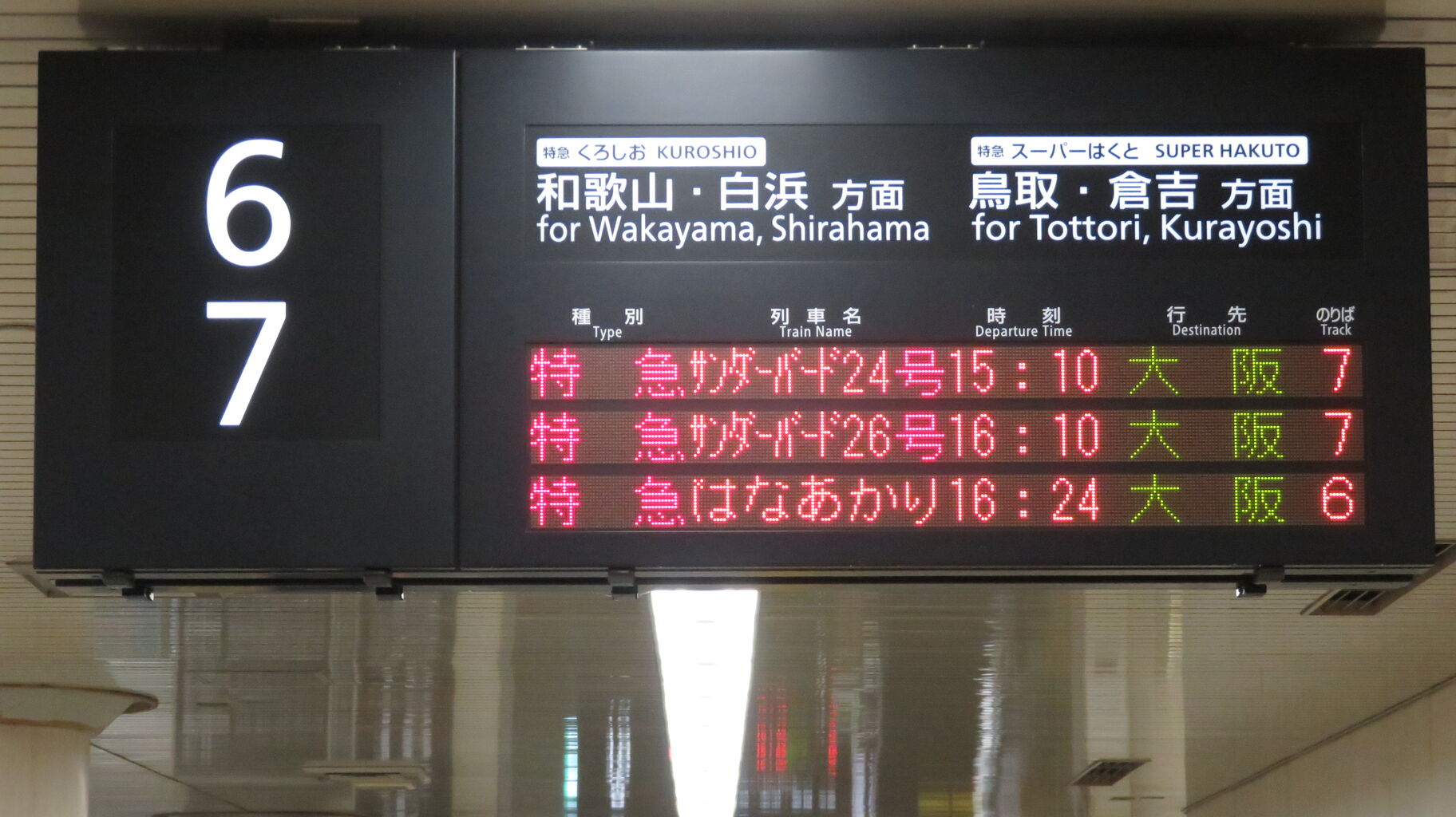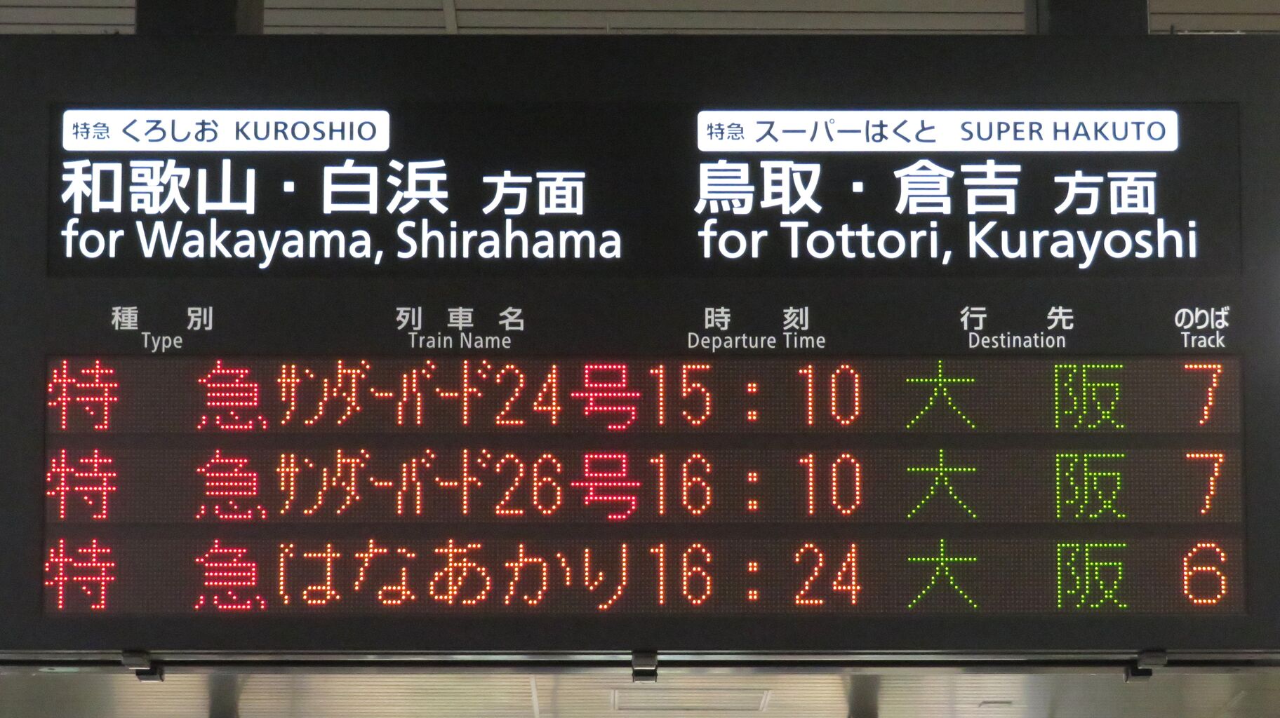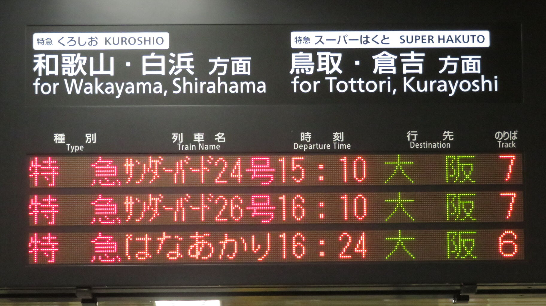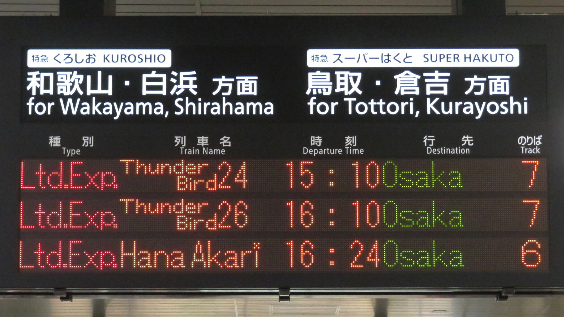 そのため、14時台の時点で、発車標に 16時24分発の 「はなあかり」 大阪行きが表示されていました。