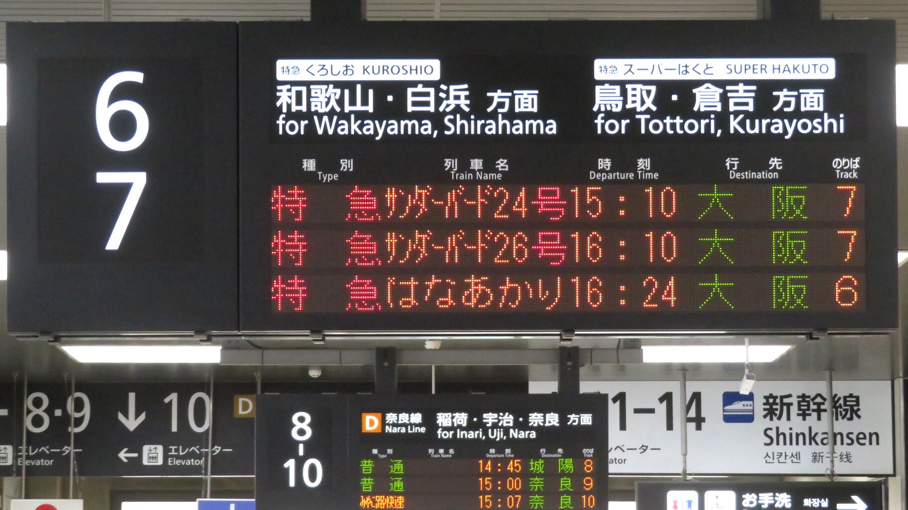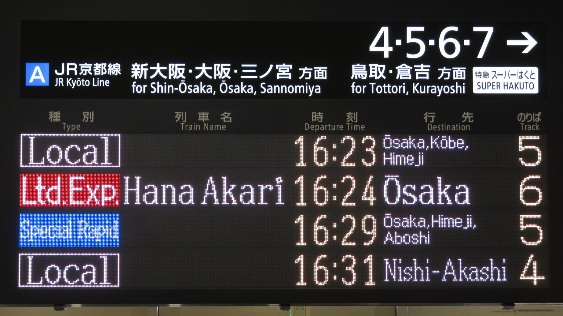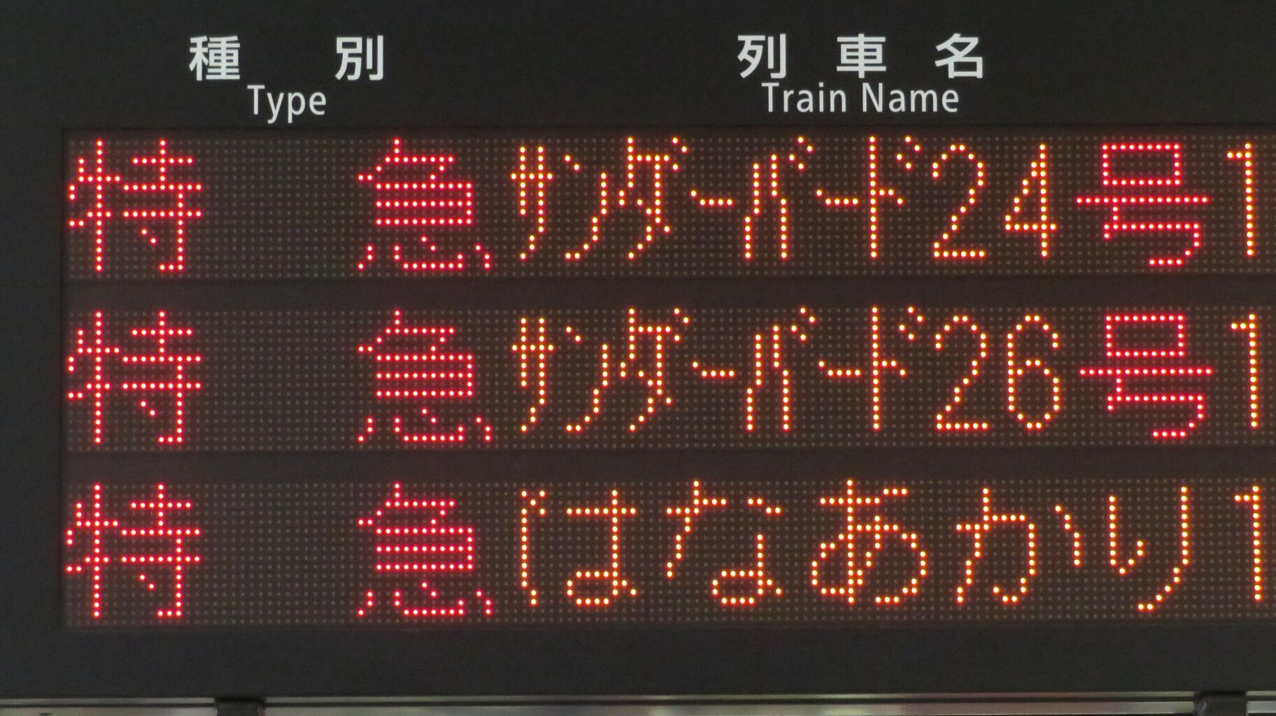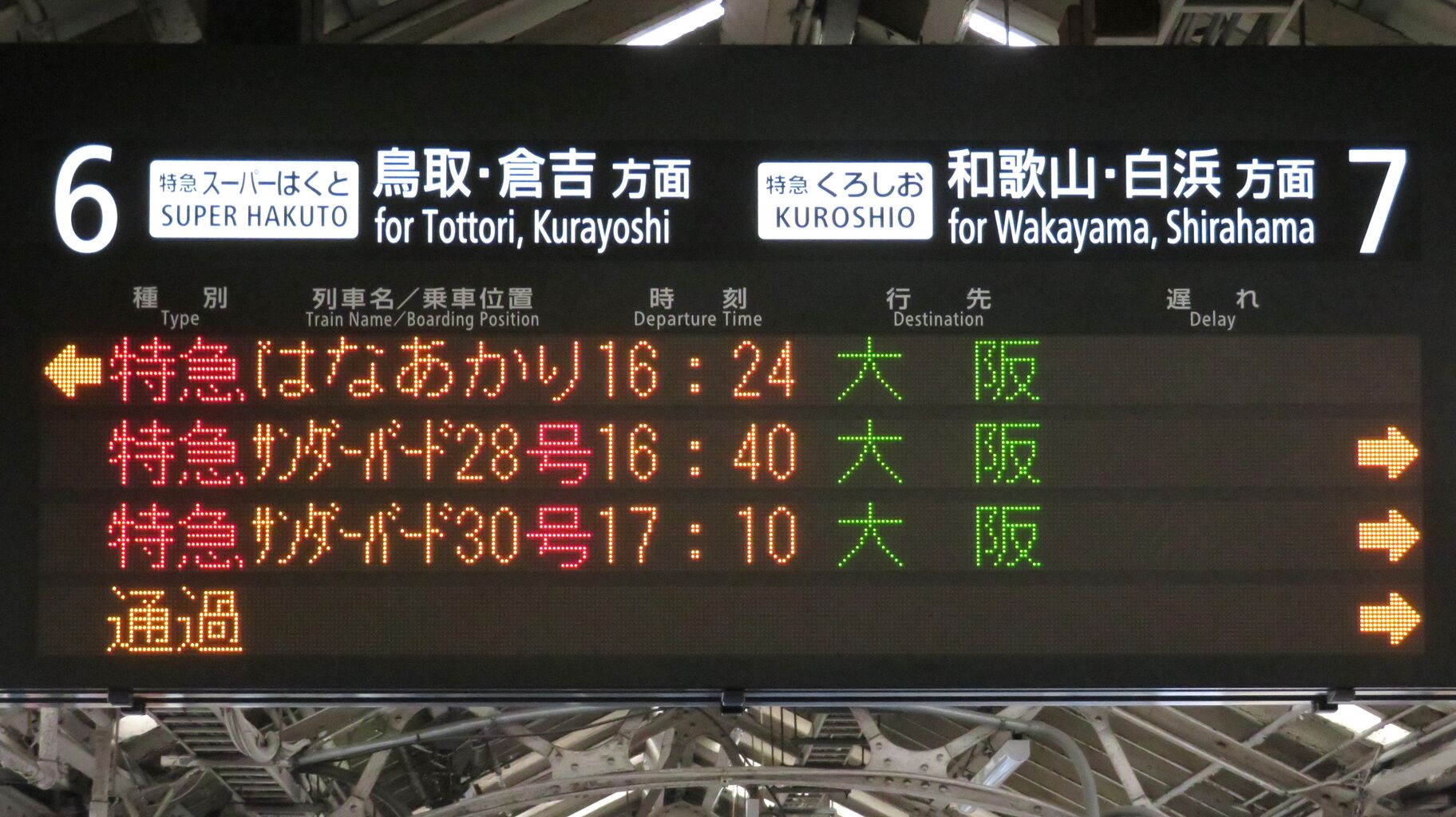 そのため、14時台の時点で、発車標に 16時24分発の 「はなあかり」 大阪行きが表示されていました。