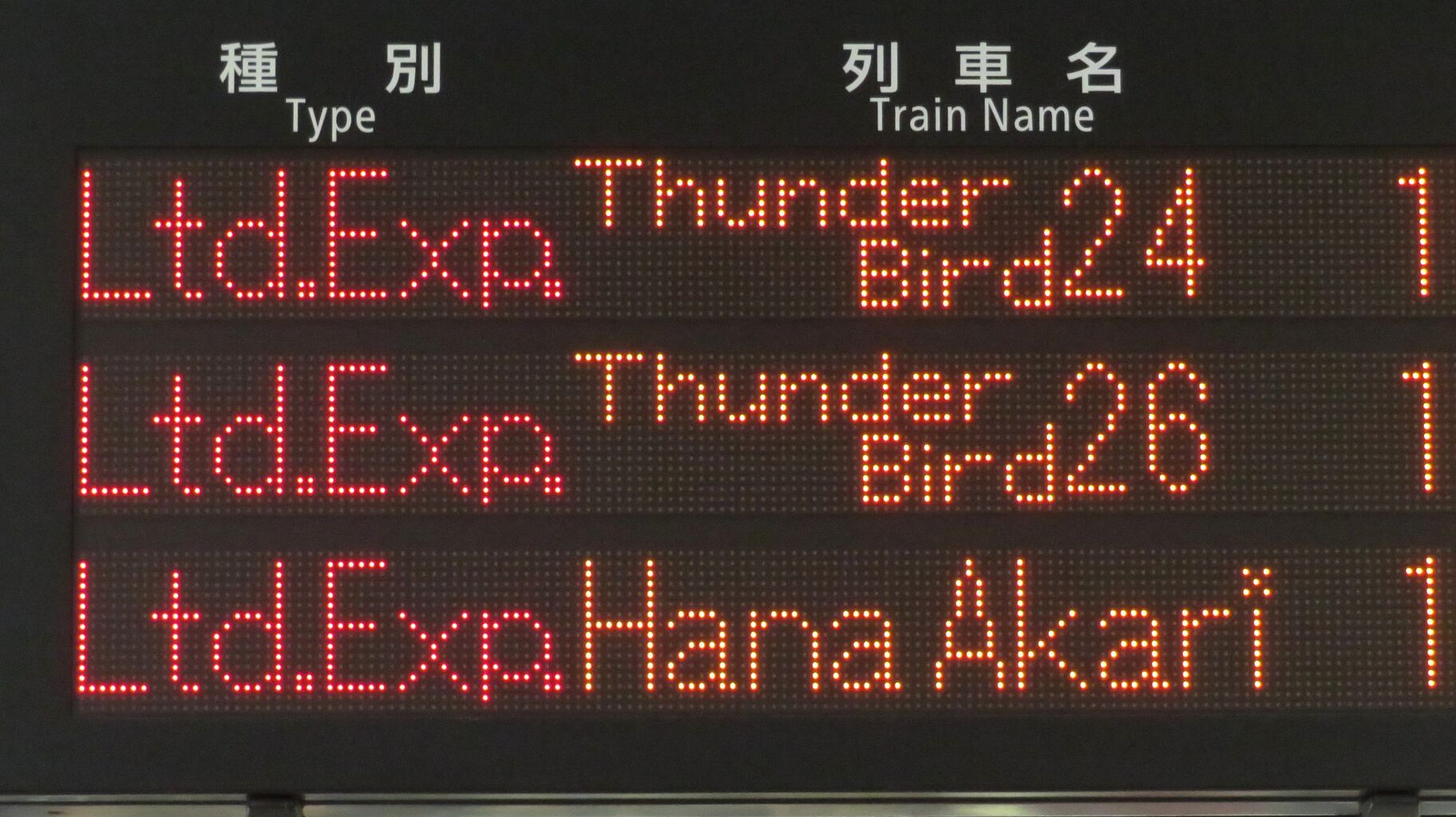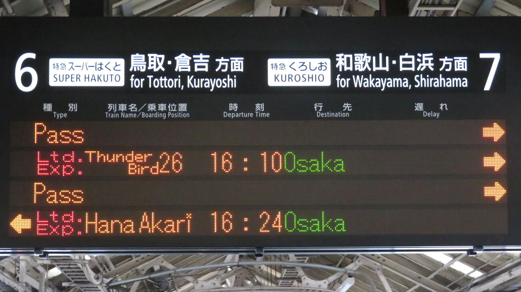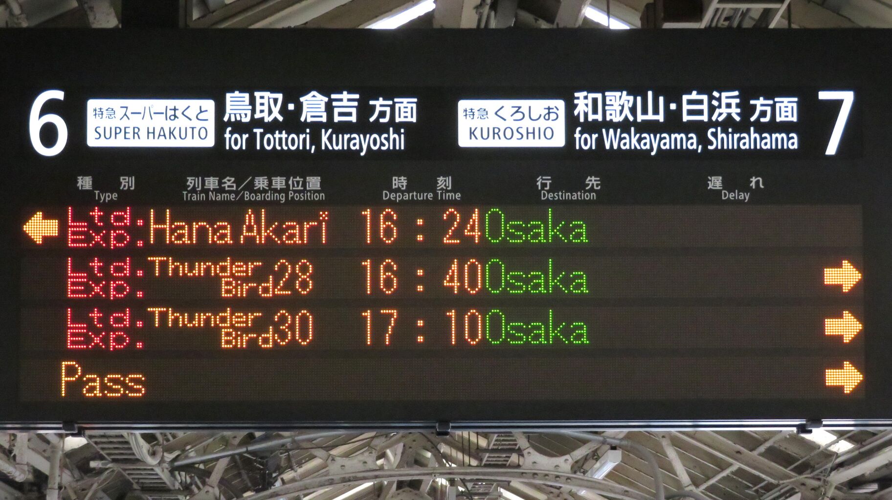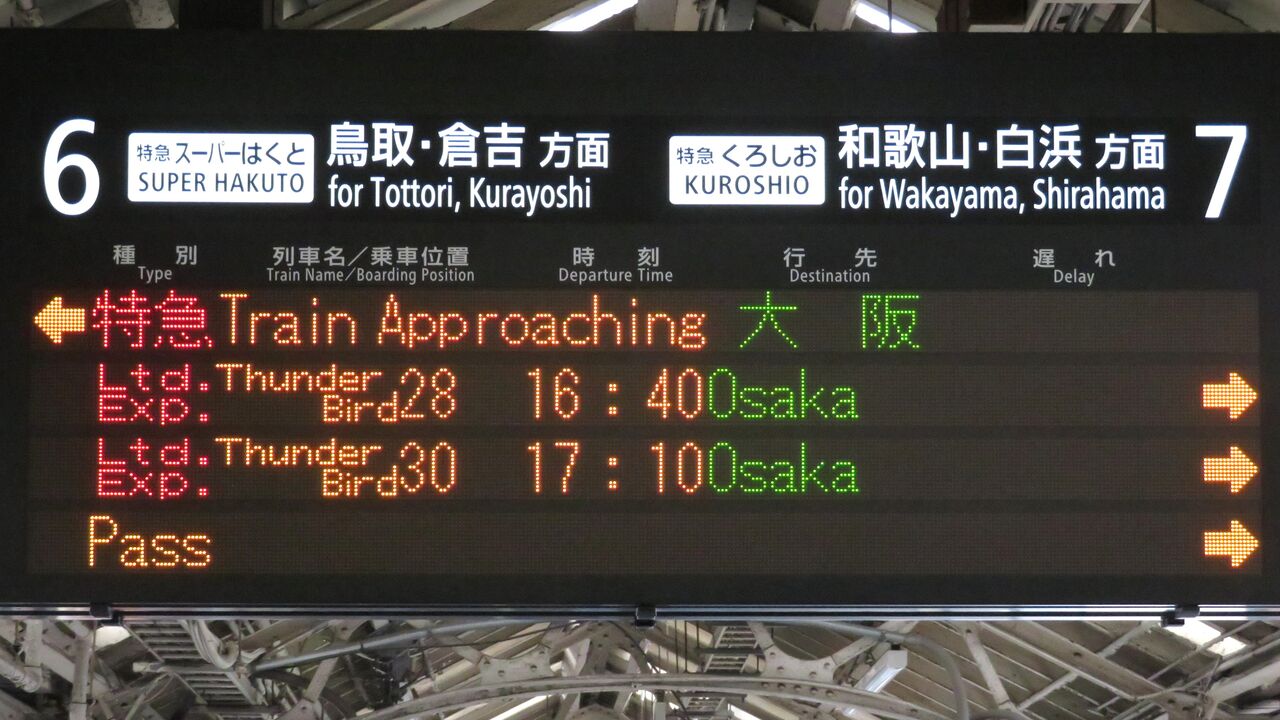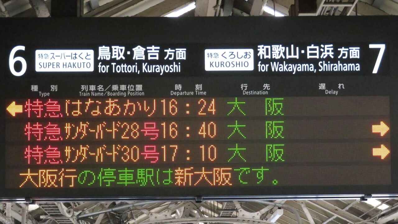 「特急はなあかり 大阪行の停車駅は新大阪です。」 とスクロール表示が流れました。