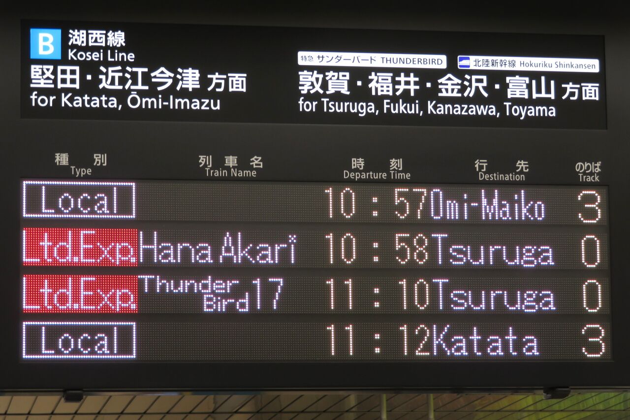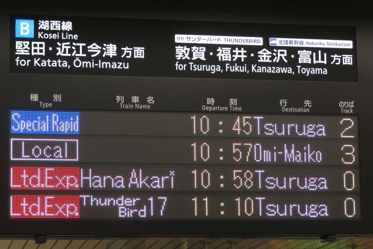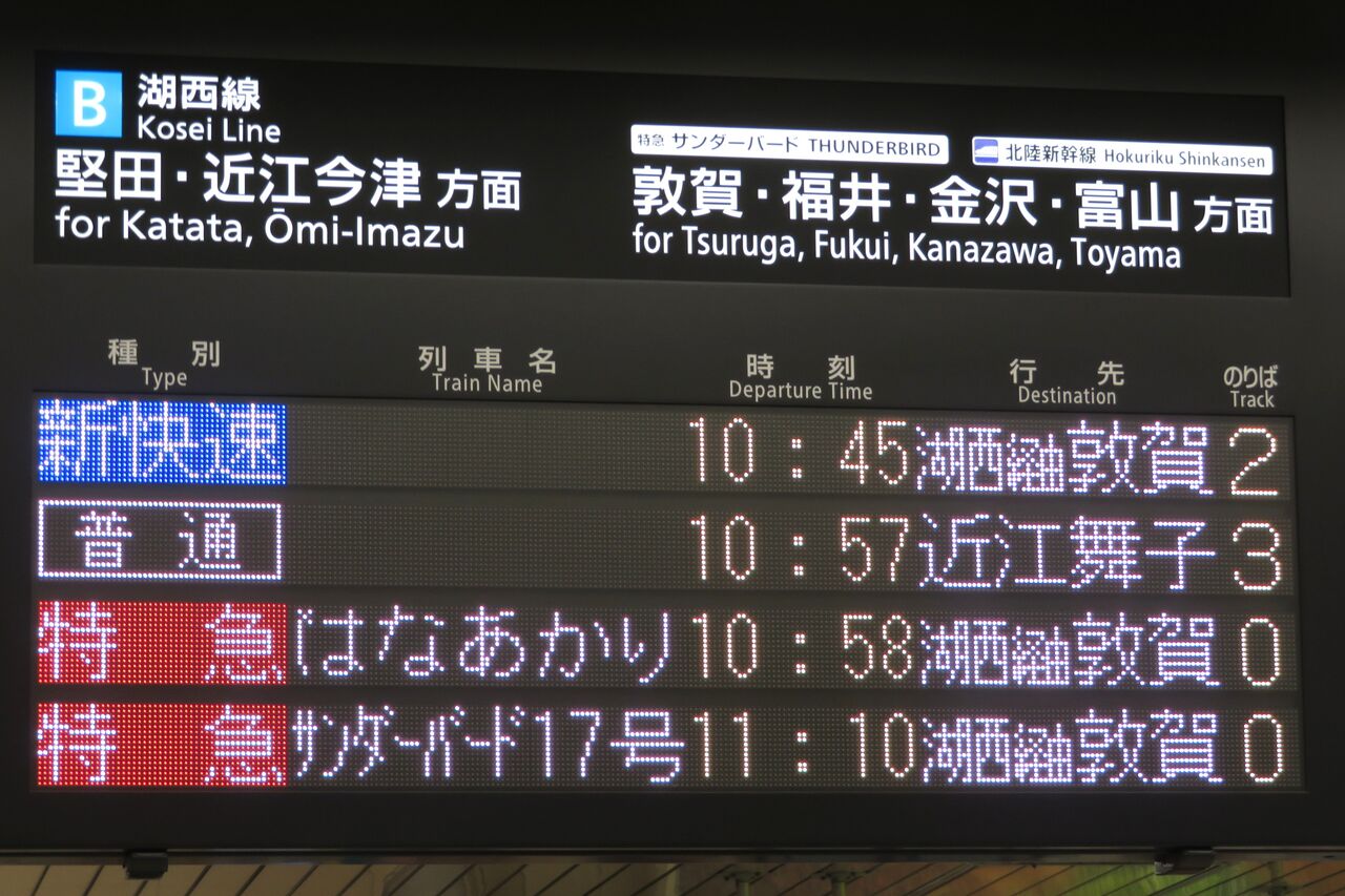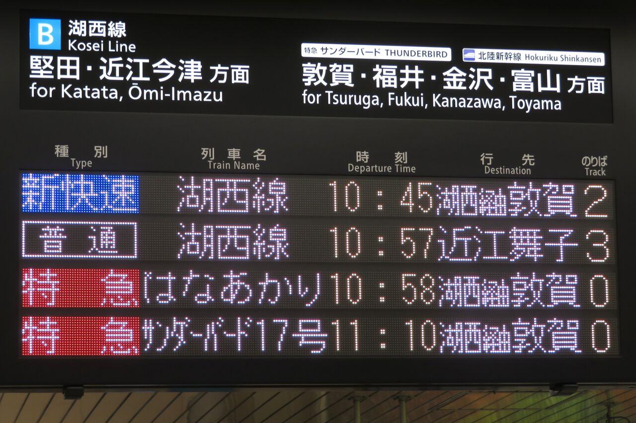 ちなみに、特急 「サンダーバード」 が金沢駅や富山駅まで直通していた時、金沢行きや富山行きでは 「湖西線」 の表示が出ませんでした。