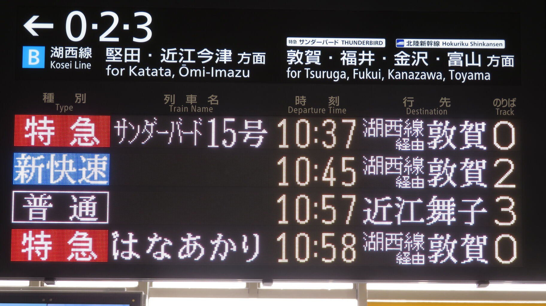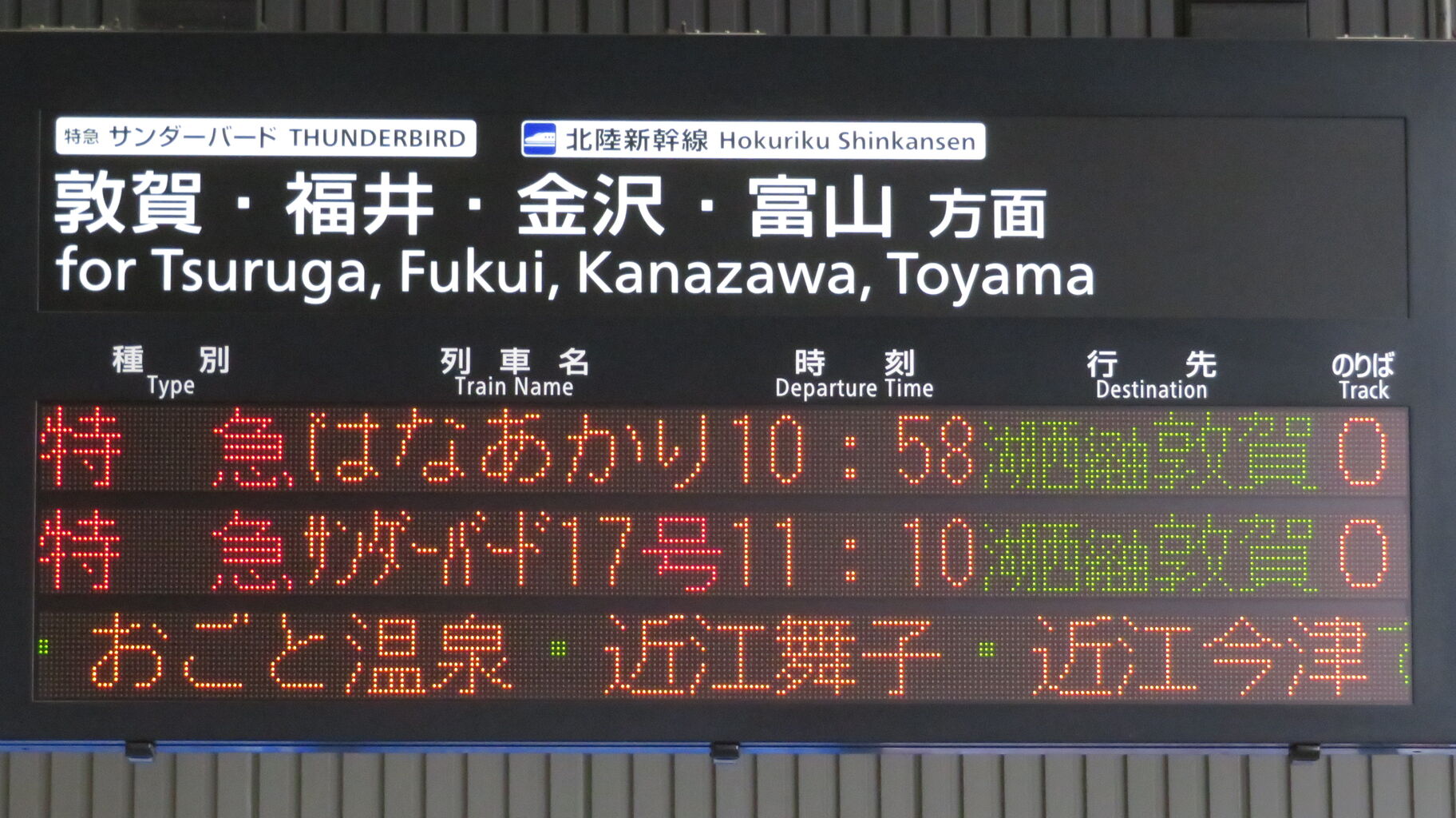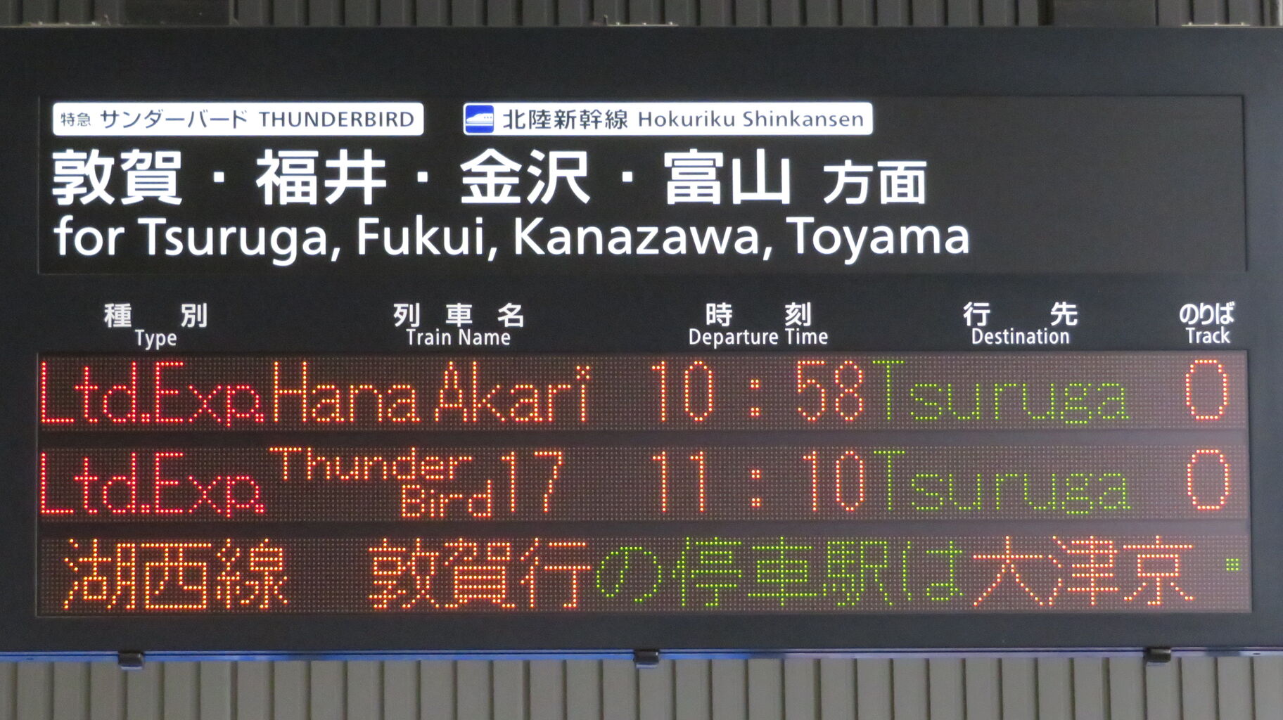 ちなみに、特急 「サンダーバード」 が金沢駅や富山駅まで直通していた時、金沢行きや富山行きでは 「湖西線」 の表示が出ませんでした。