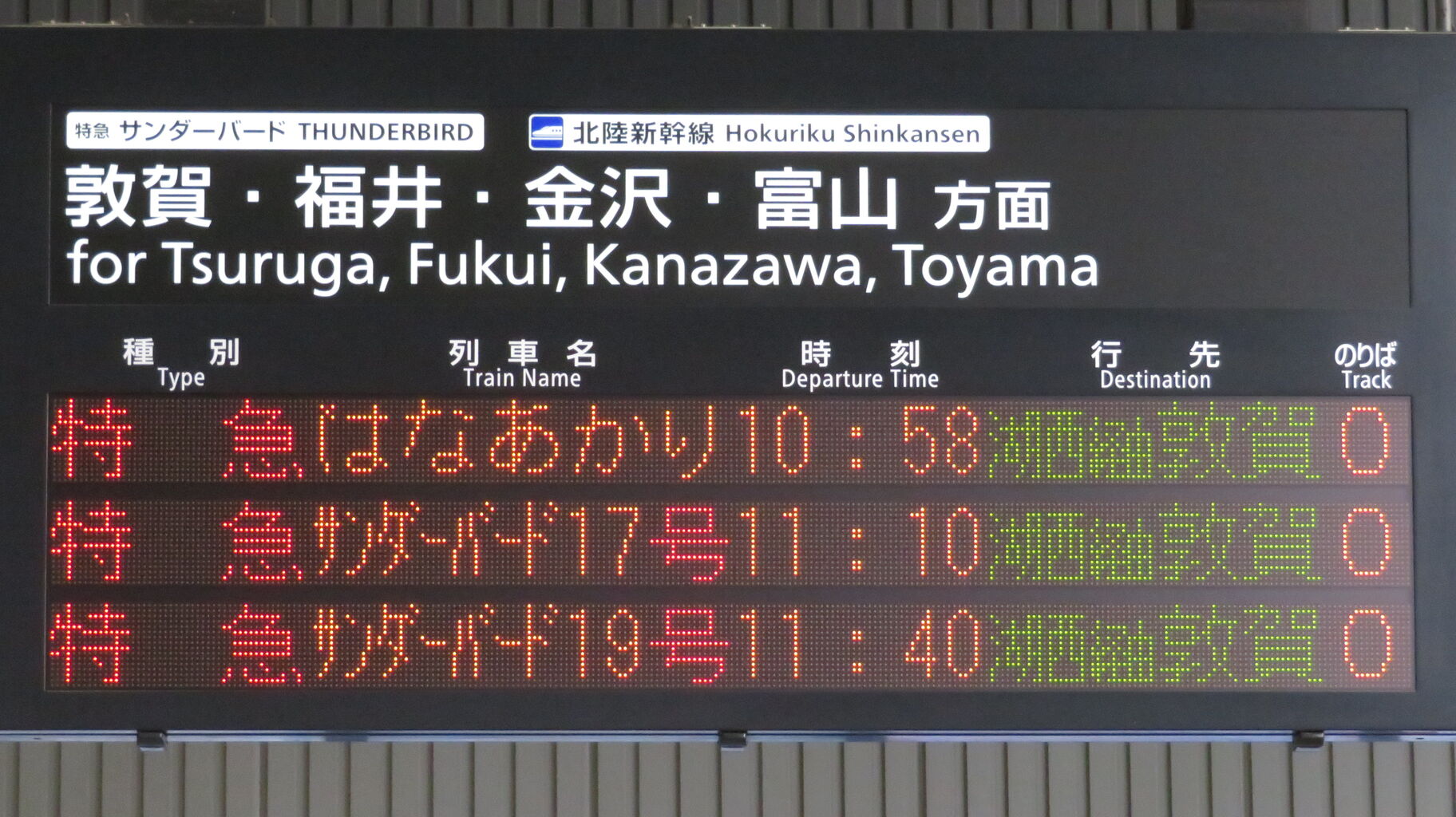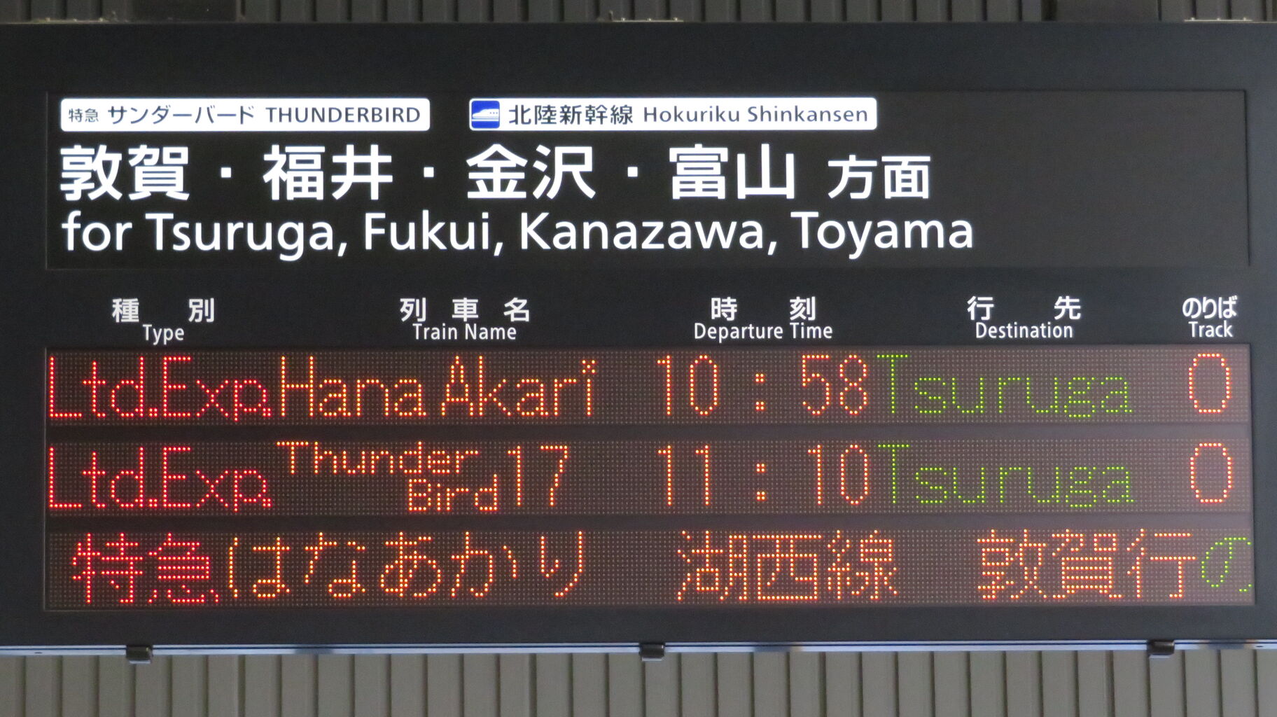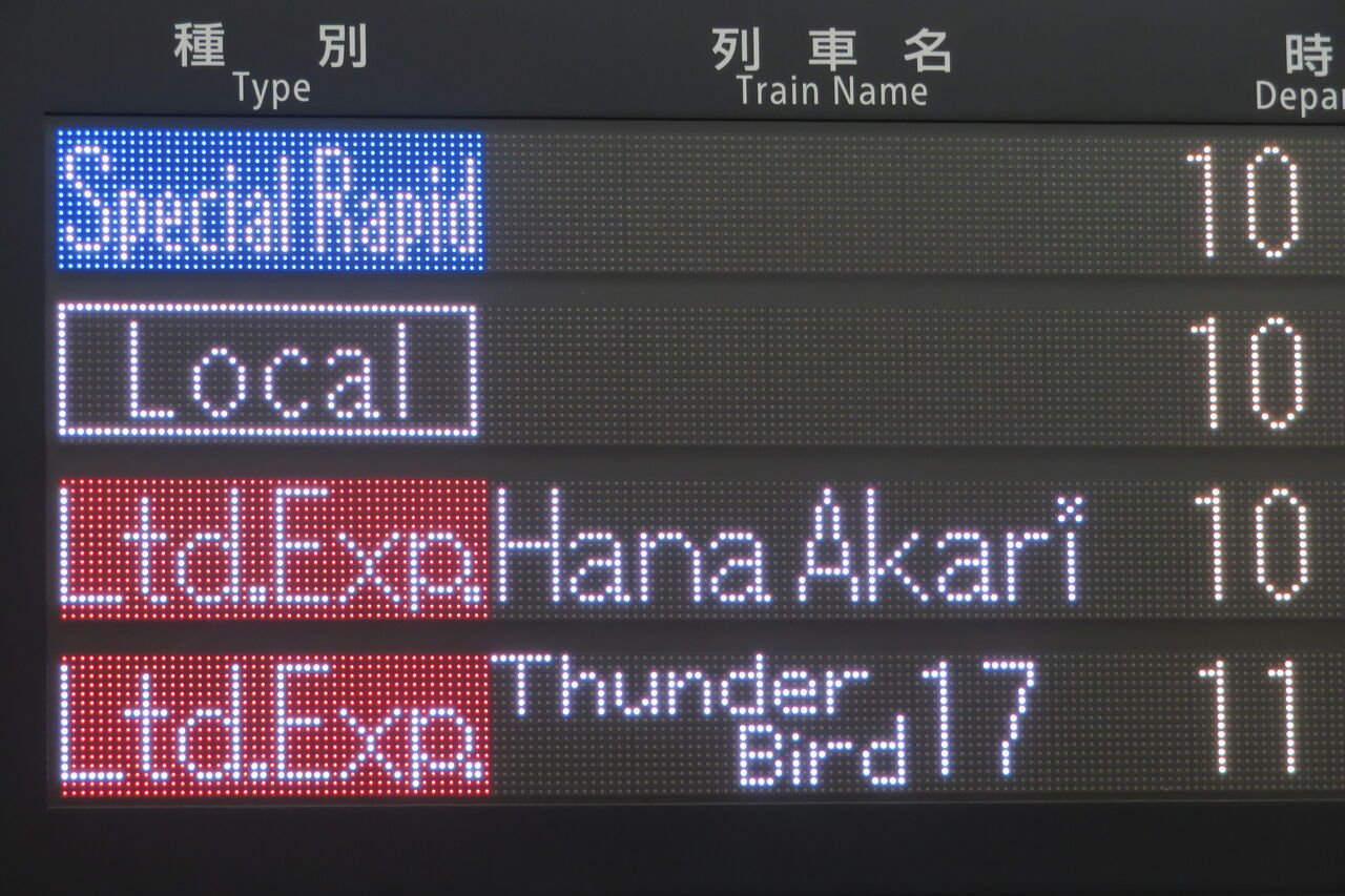 9時42分発の特急サンダーバード11号が発車すると、一番下の段に、「はなあかり」 敦賀行きの表示が出ました。
