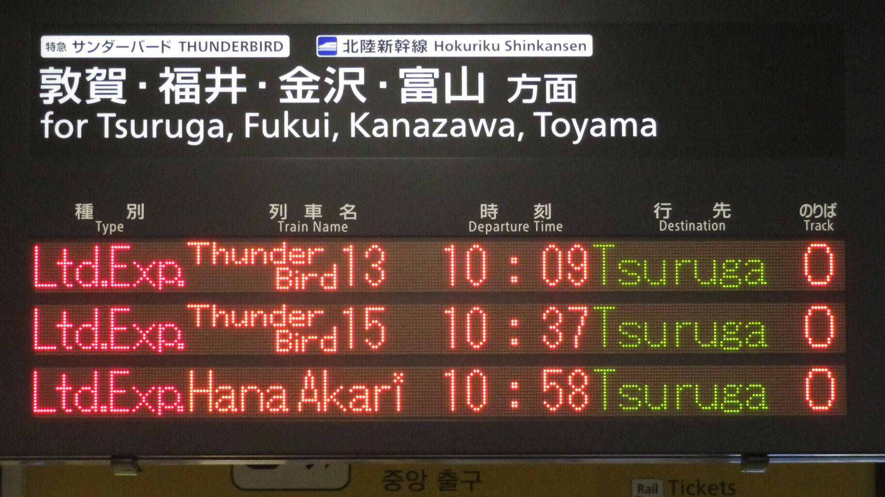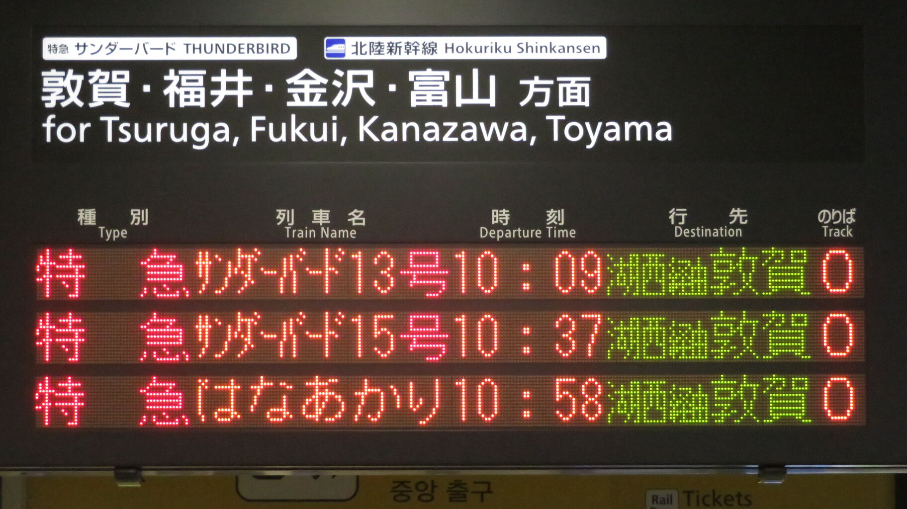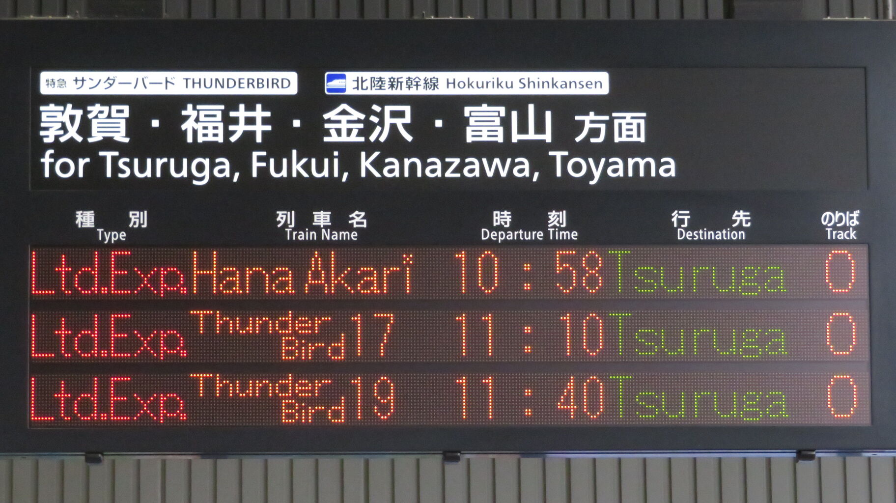9時42分発の特急サンダーバード11号が発車すると、一番下の段に、「はなあかり」 敦賀行きの表示が出ました。