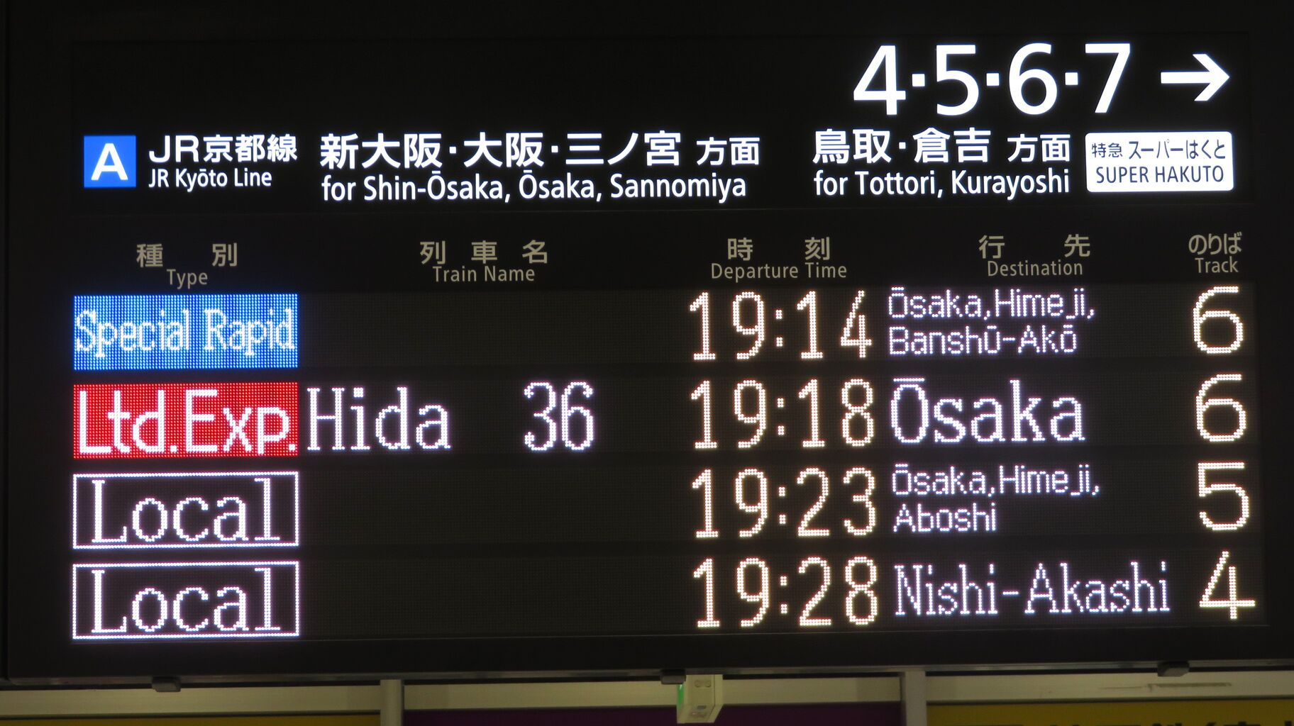 このタイプのフルカラーLED発車標が設置されているのは、京都駅だけです。
