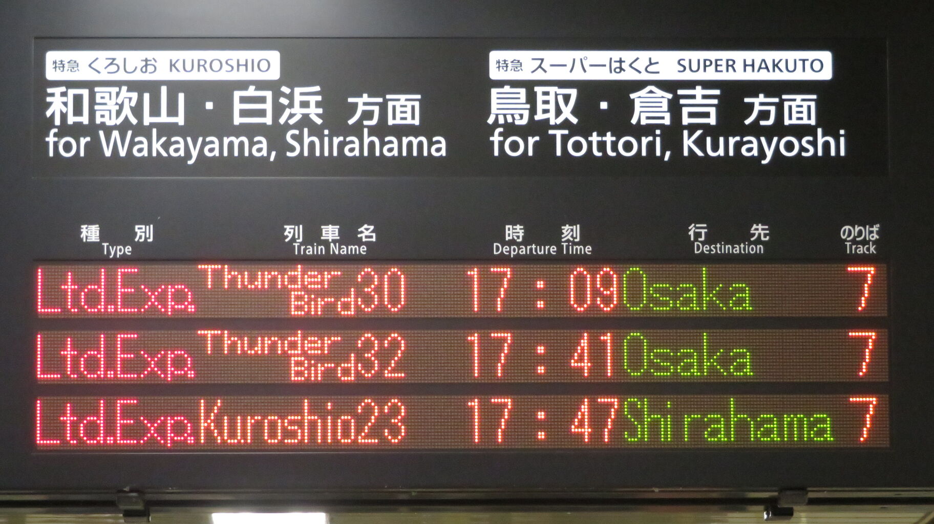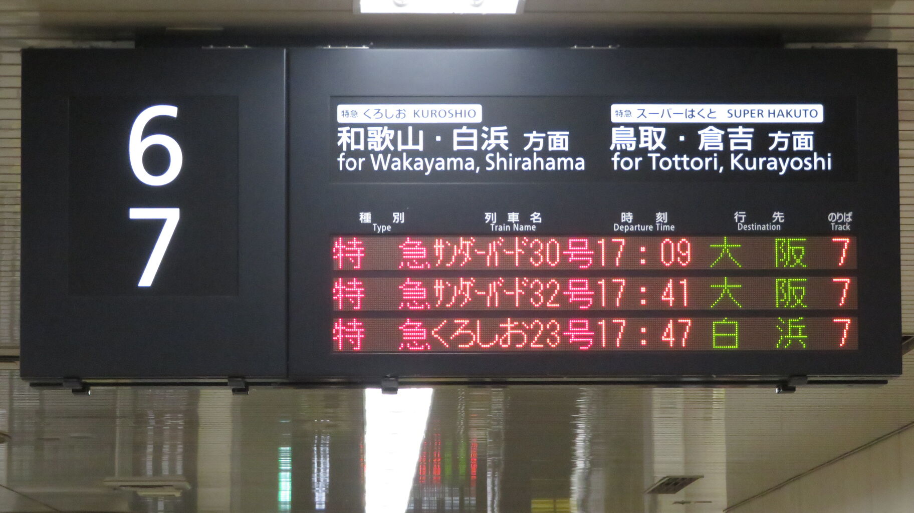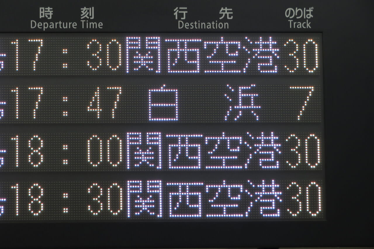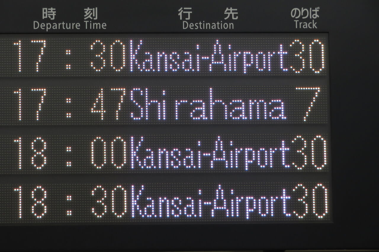 くろしおの発車案内は、JR京都線 大阪方面の発車標ではなく、関空特急はるかの発車標に表示されます。