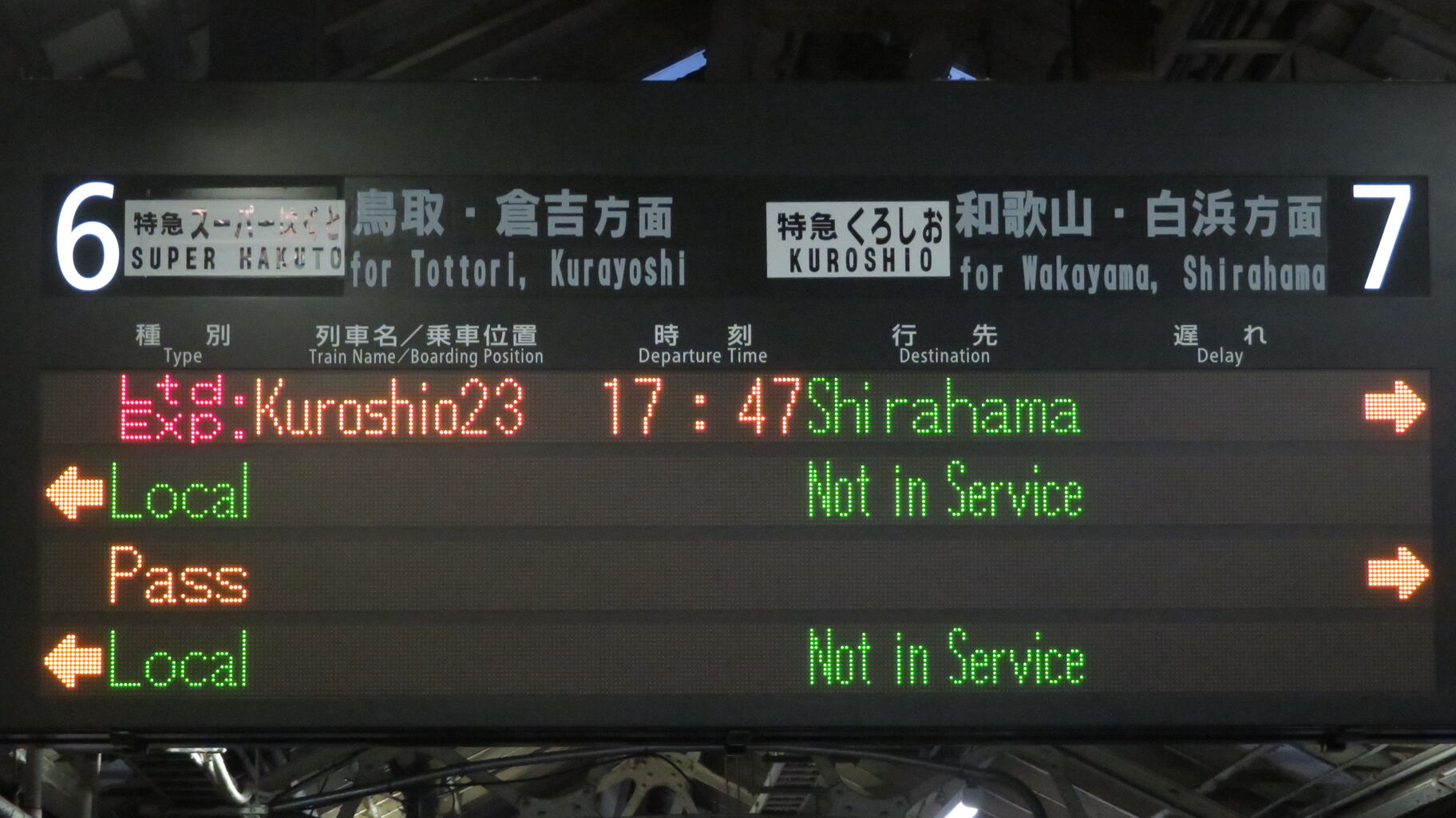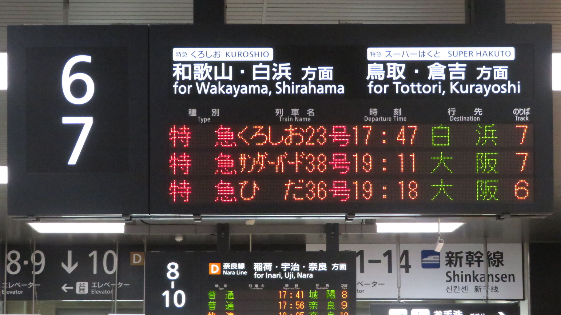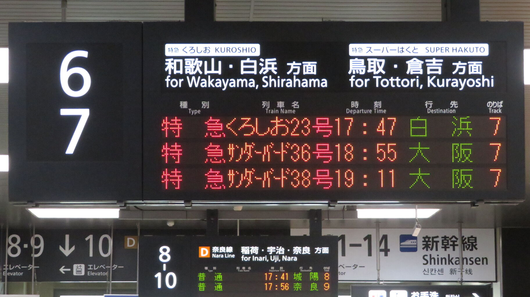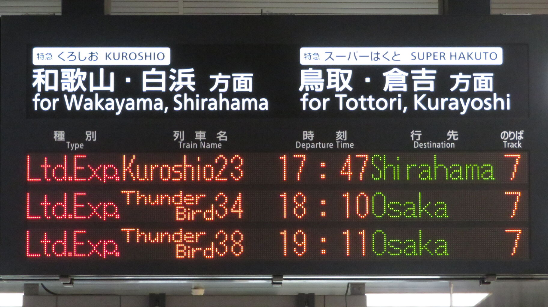くろしおの発車案内は、JR京都線 大阪方面の発車標ではなく、関空特急はるかの発車標に表示されます。