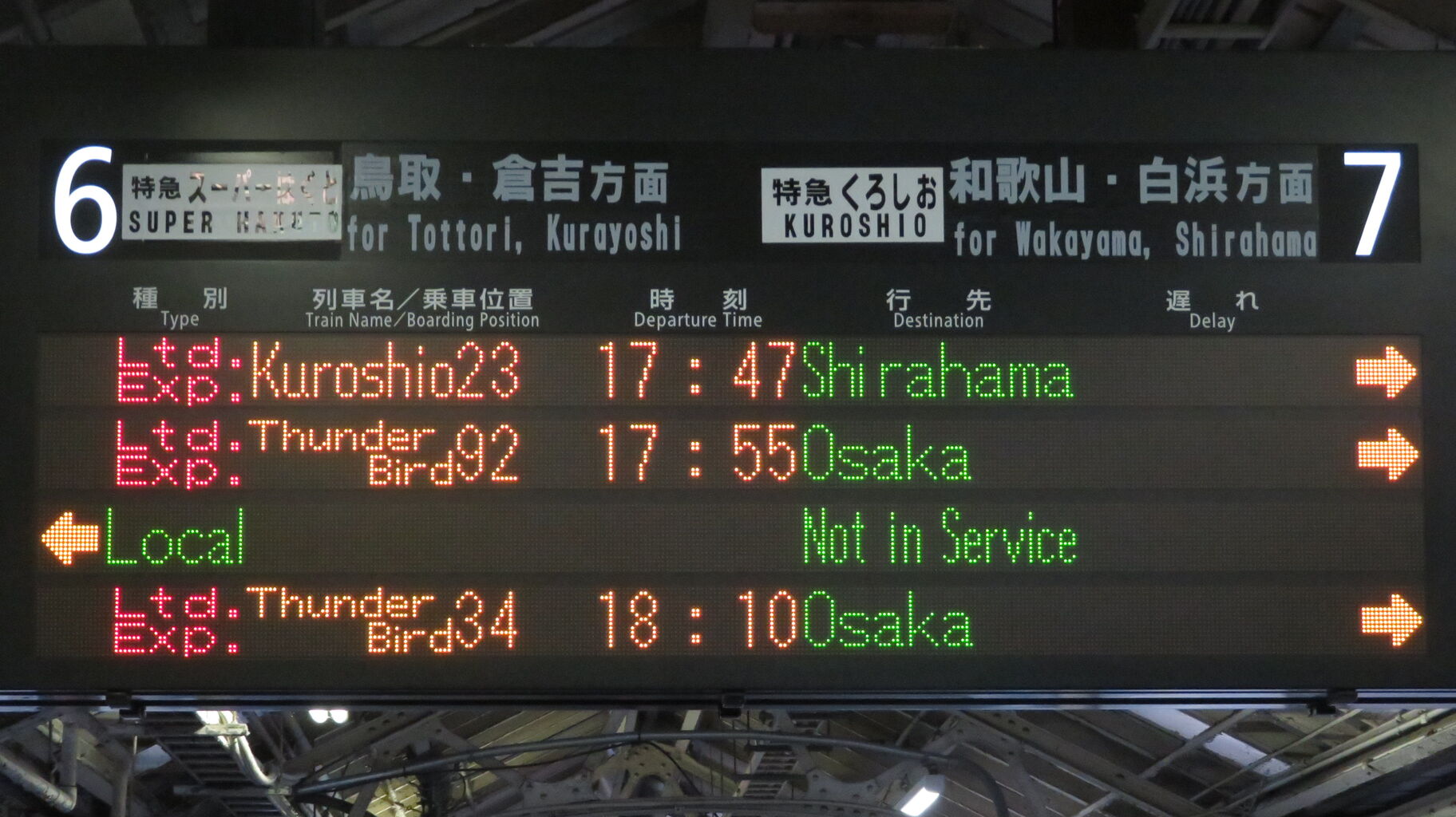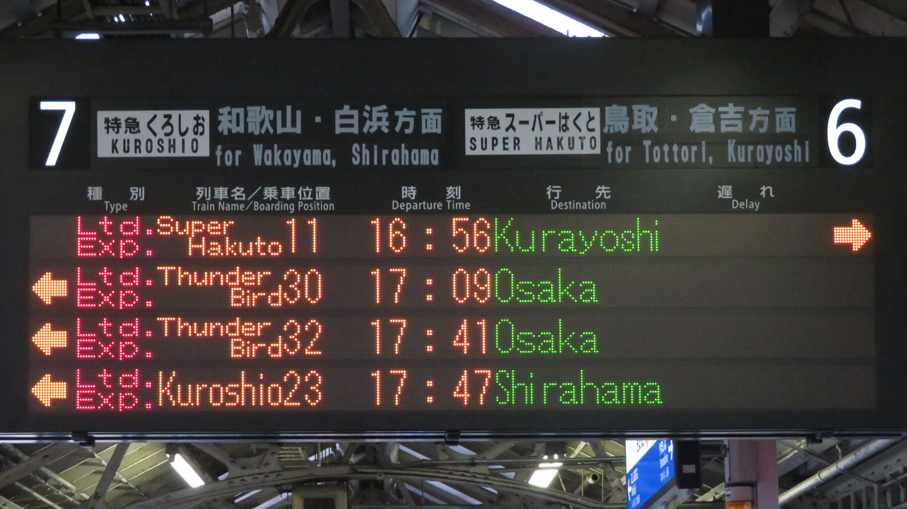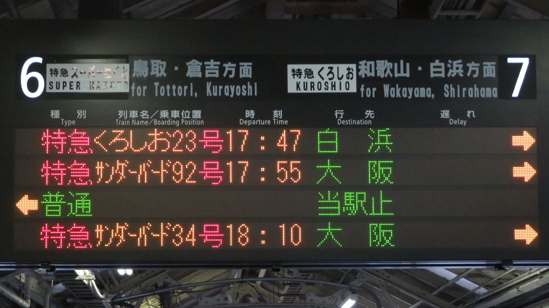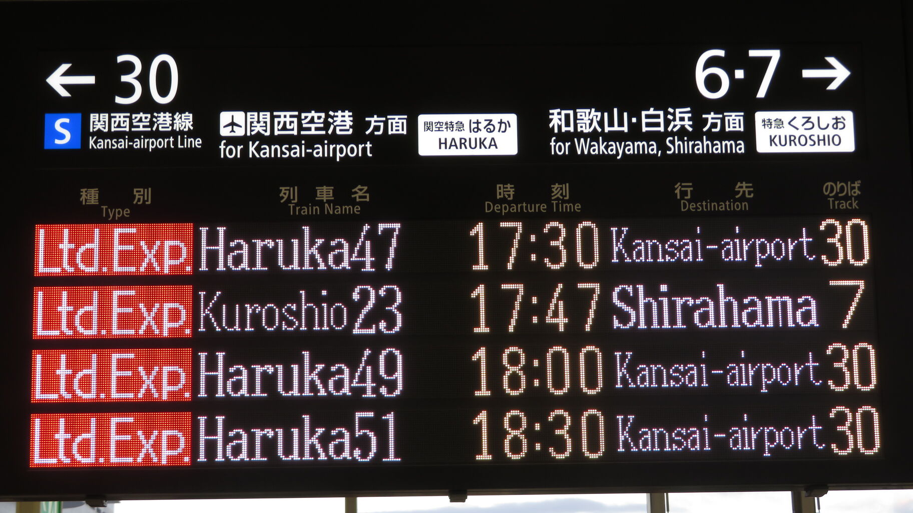 くろしおの発車案内は、JR京都線 大阪方面の発車標ではなく、関空特急はるかの発車標に表示されます。