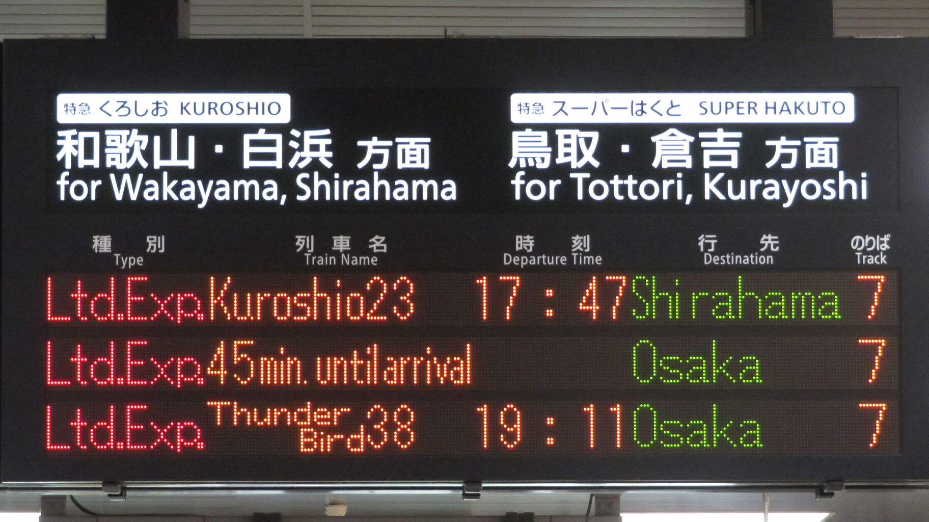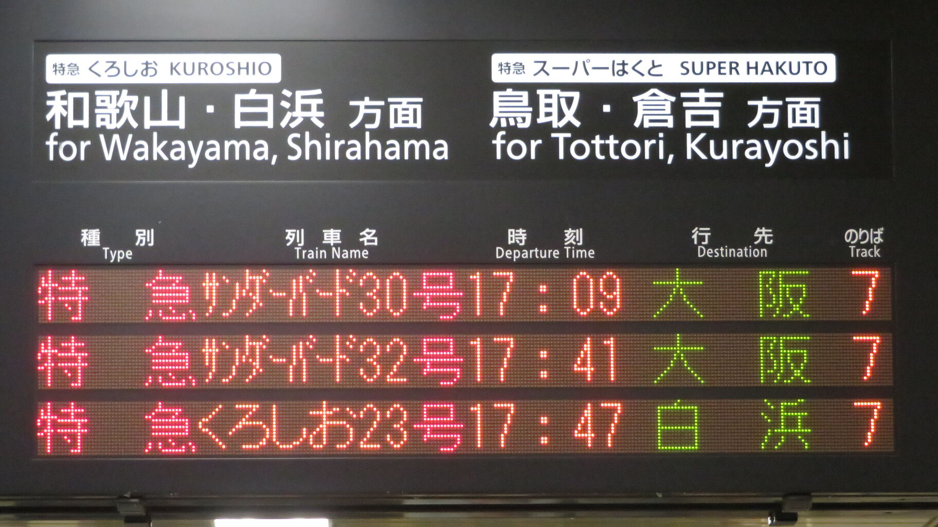 一番上の段には、特急スーパーはくと11号 倉吉行きが表示されています。