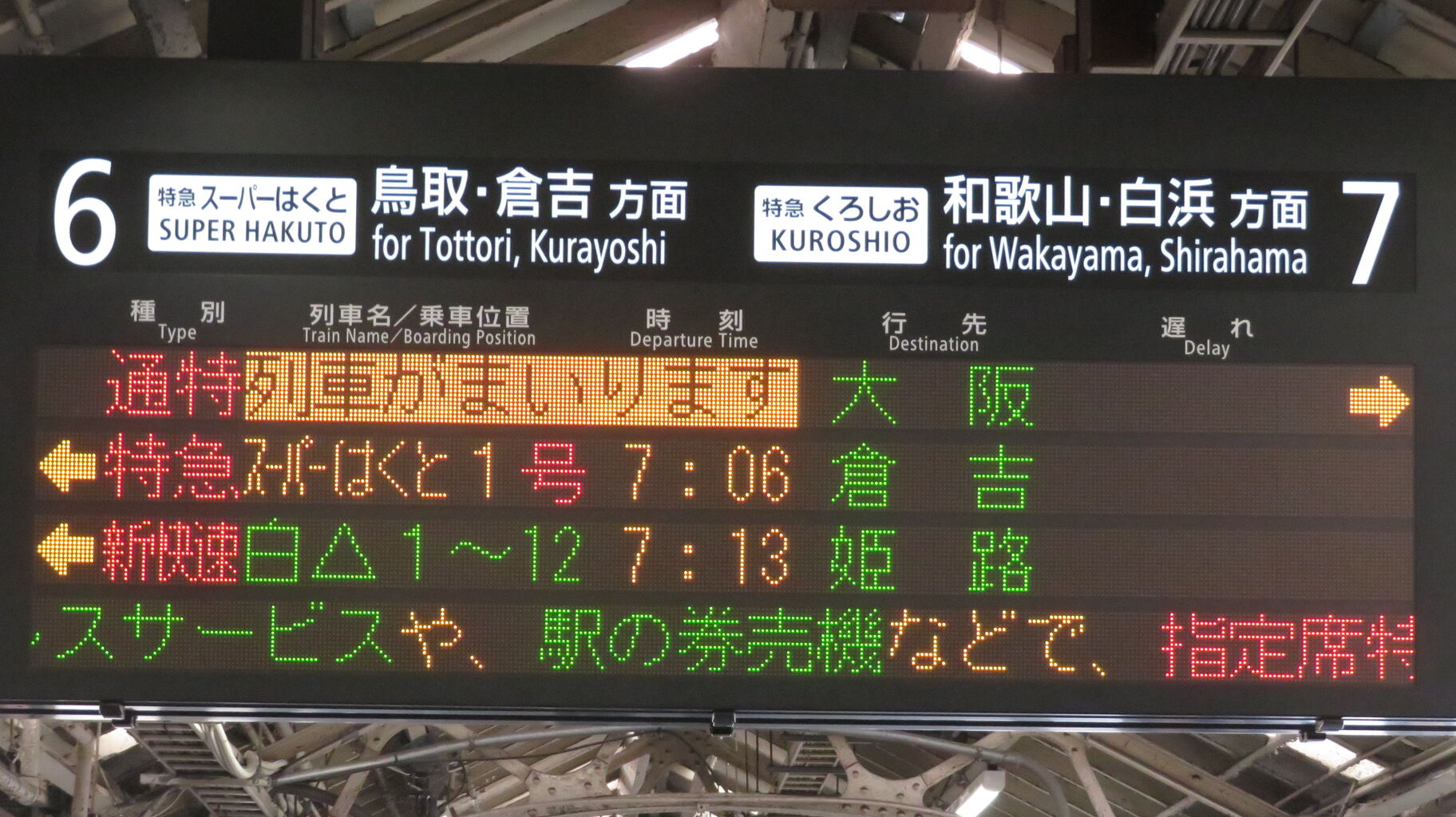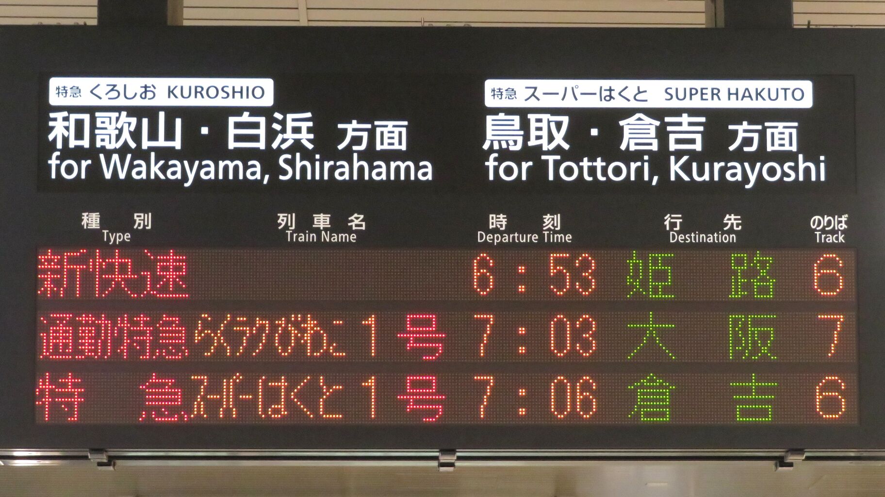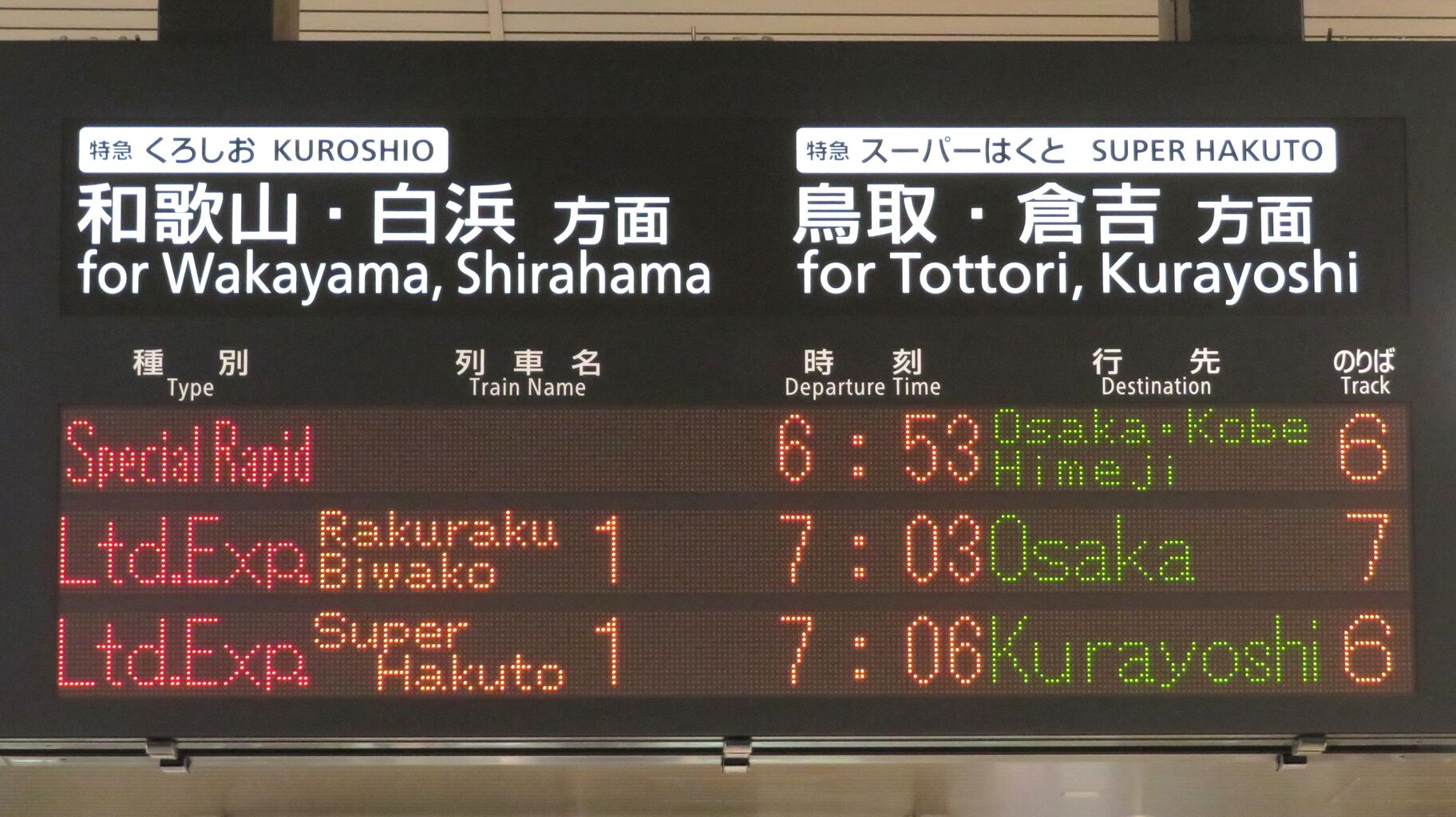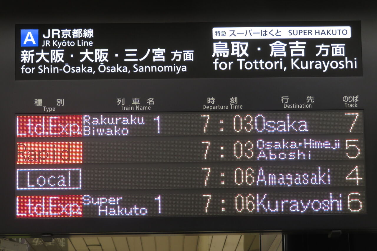 JR西日本管内で ここにしか設置されていない独自のタイプで、表示される文字のフォントが3色LED発車標と同じなのが特徴的です。