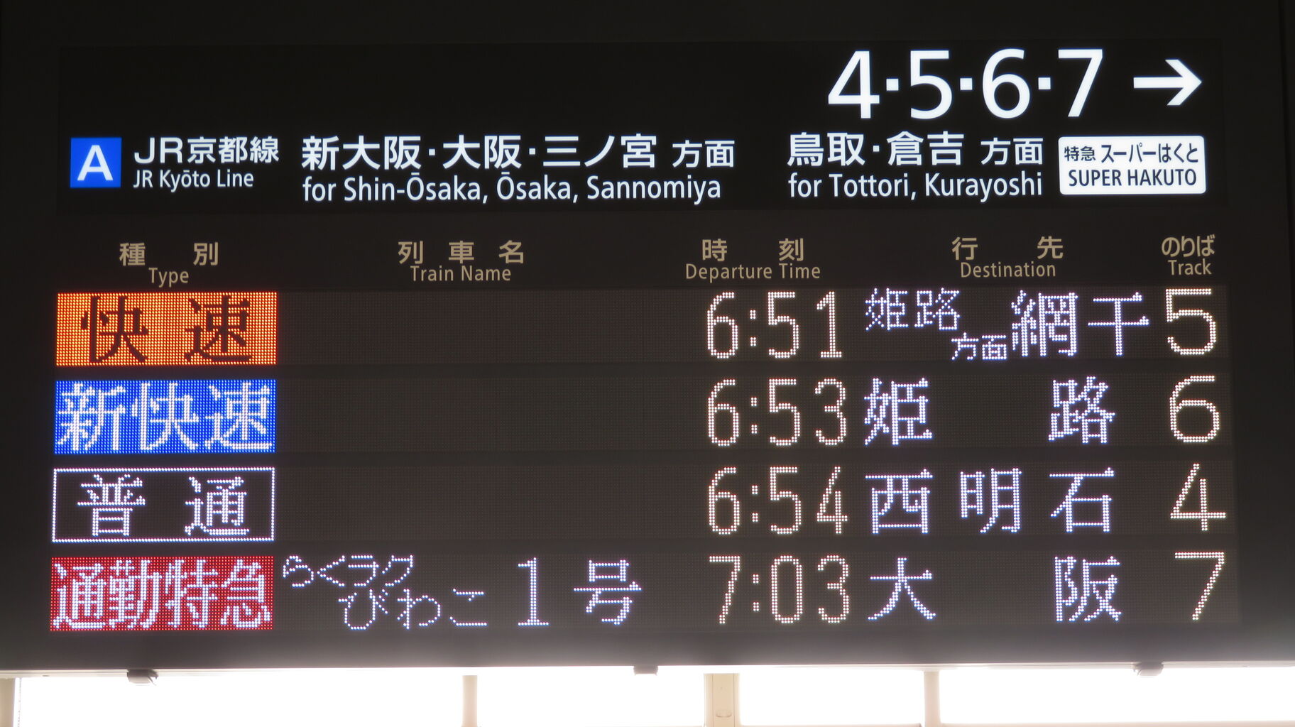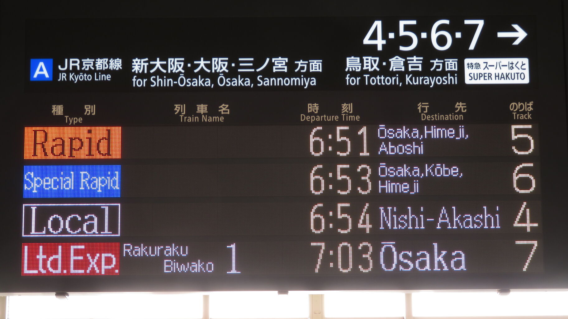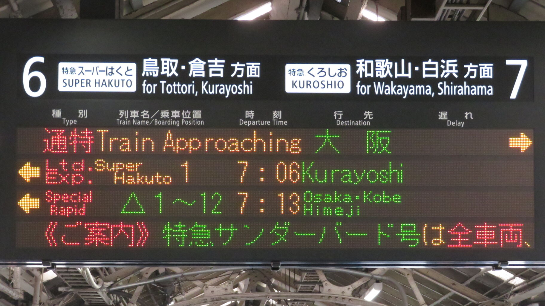JR西日本管内で ここにしか設置されていない独自のタイプで、表示される文字のフォントが3色LED発車標と同じなのが特徴的です。
