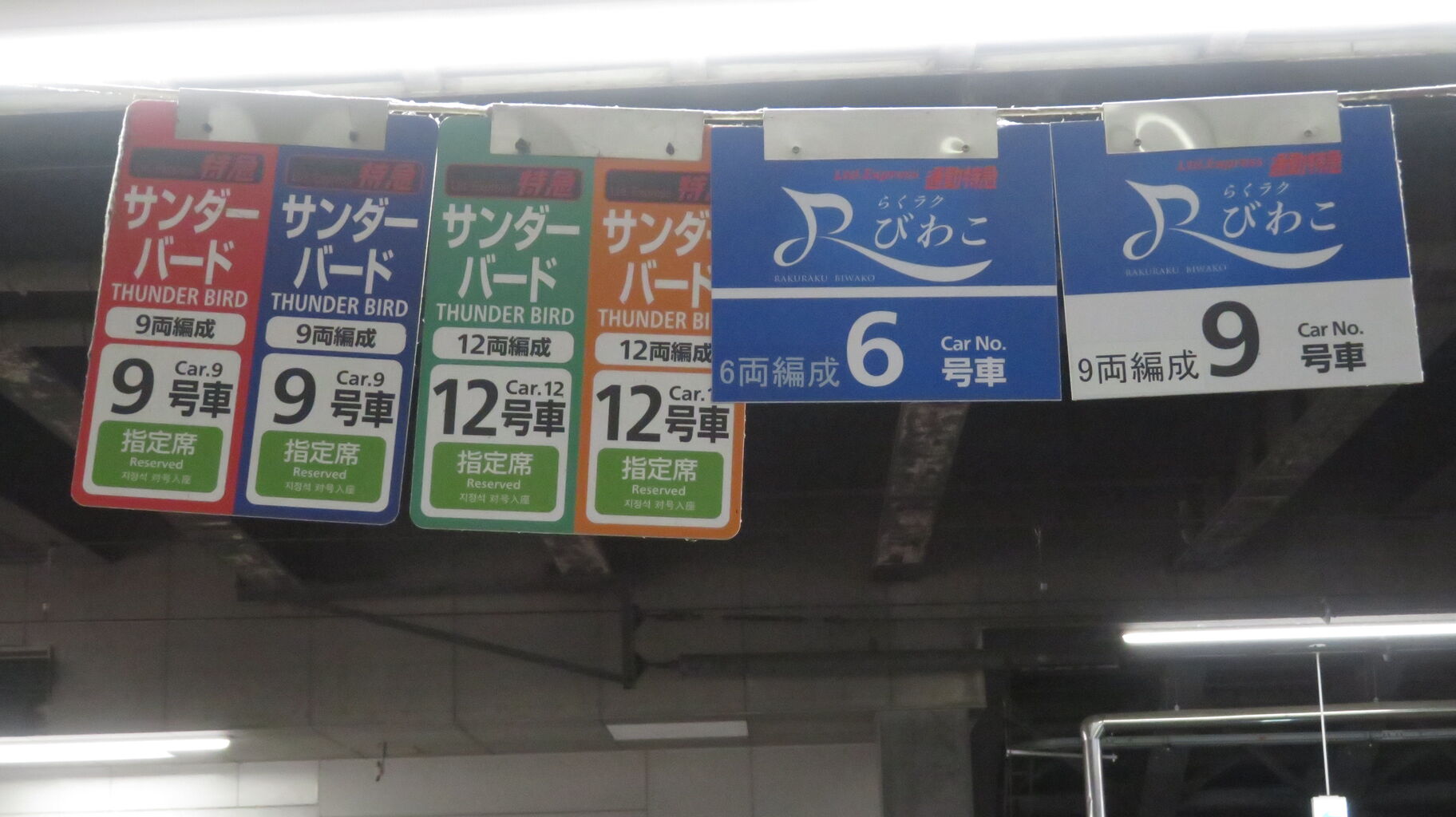 7番のりばでは、特急列車の乗車位置が吊り下げ札で案内されています。