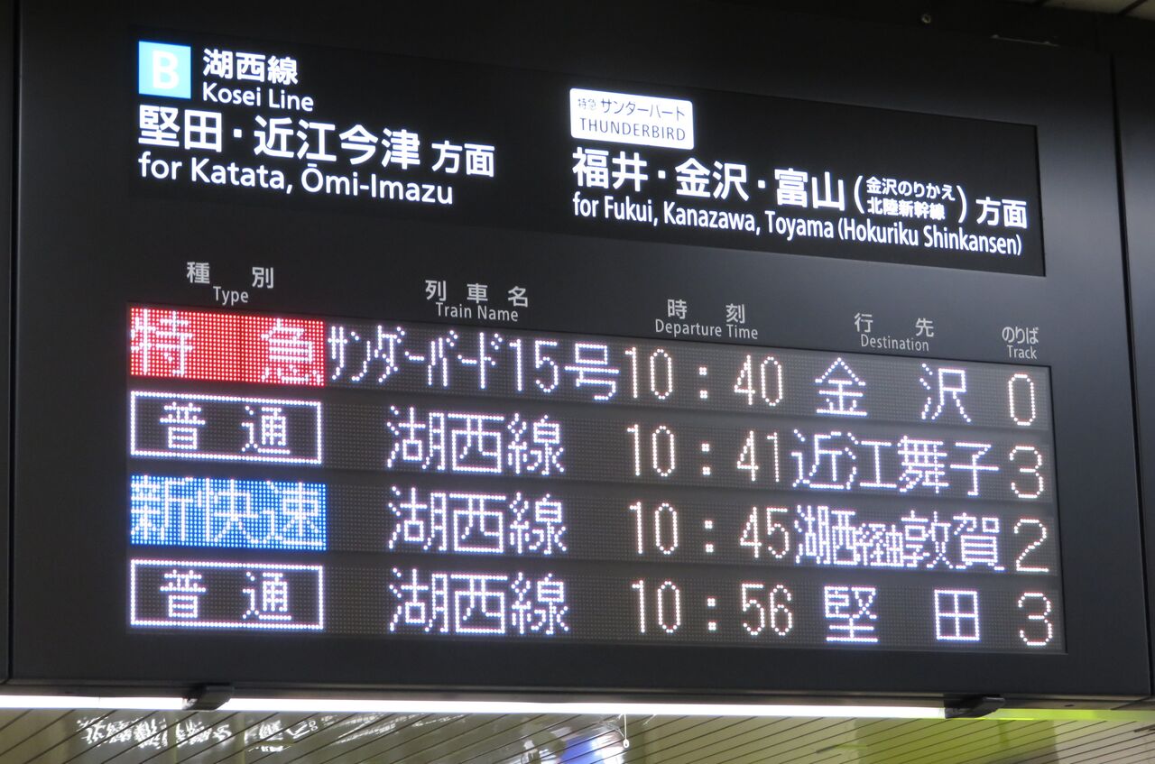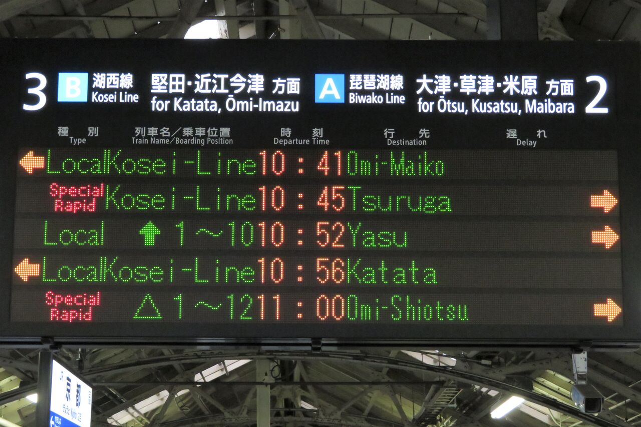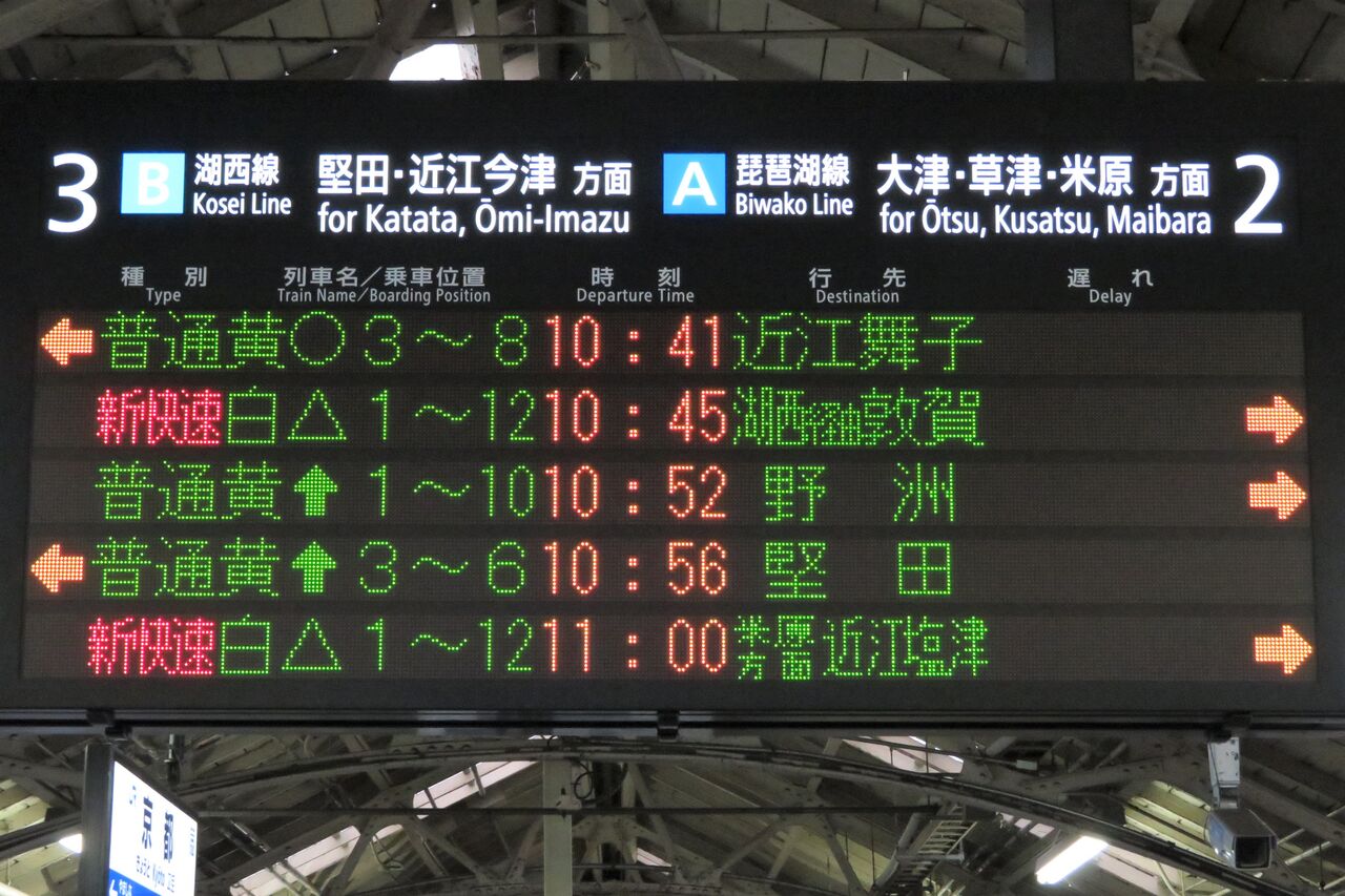 こちらは、2・3番のりば(琵琶湖線・湖西線ホーム)の発車標です。