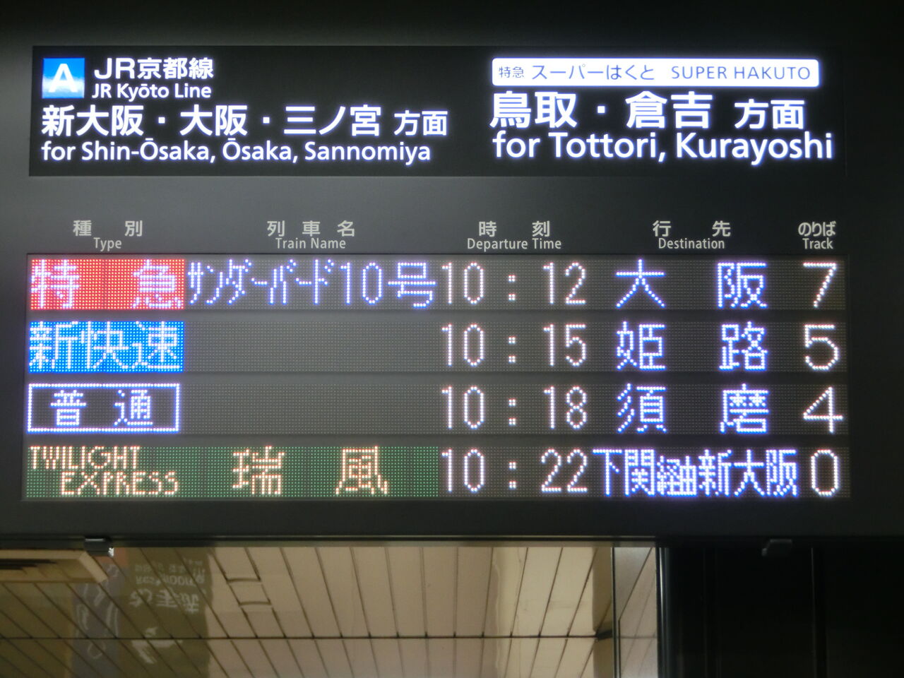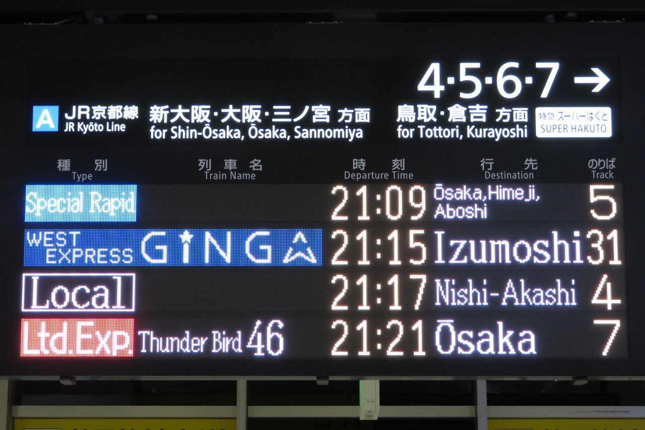 隣のホーム 4・5番のりば(JR京都線ホーム)の発車標は、こんな感じ。