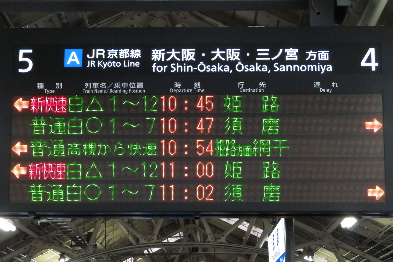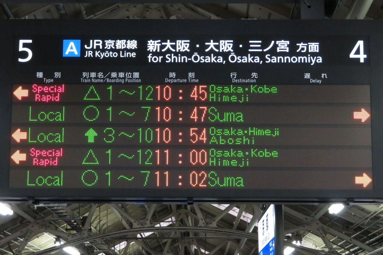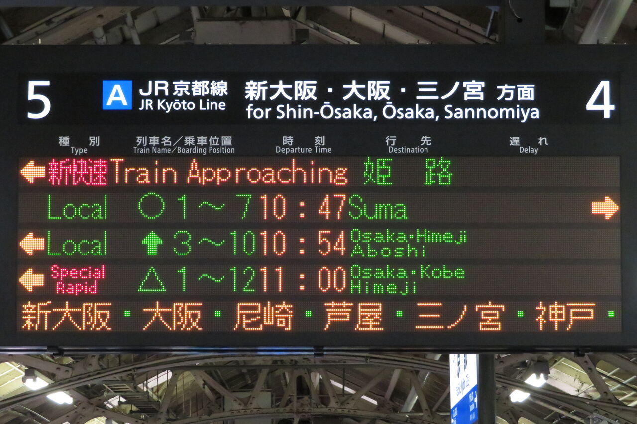 2020年3月、琵琶湖線・JR京都線・JR神戸線で、各駅の発車標に表示される 新快速の英語表示が 「S.Rapid」 から 「Special Rapid」 に変更されました。
