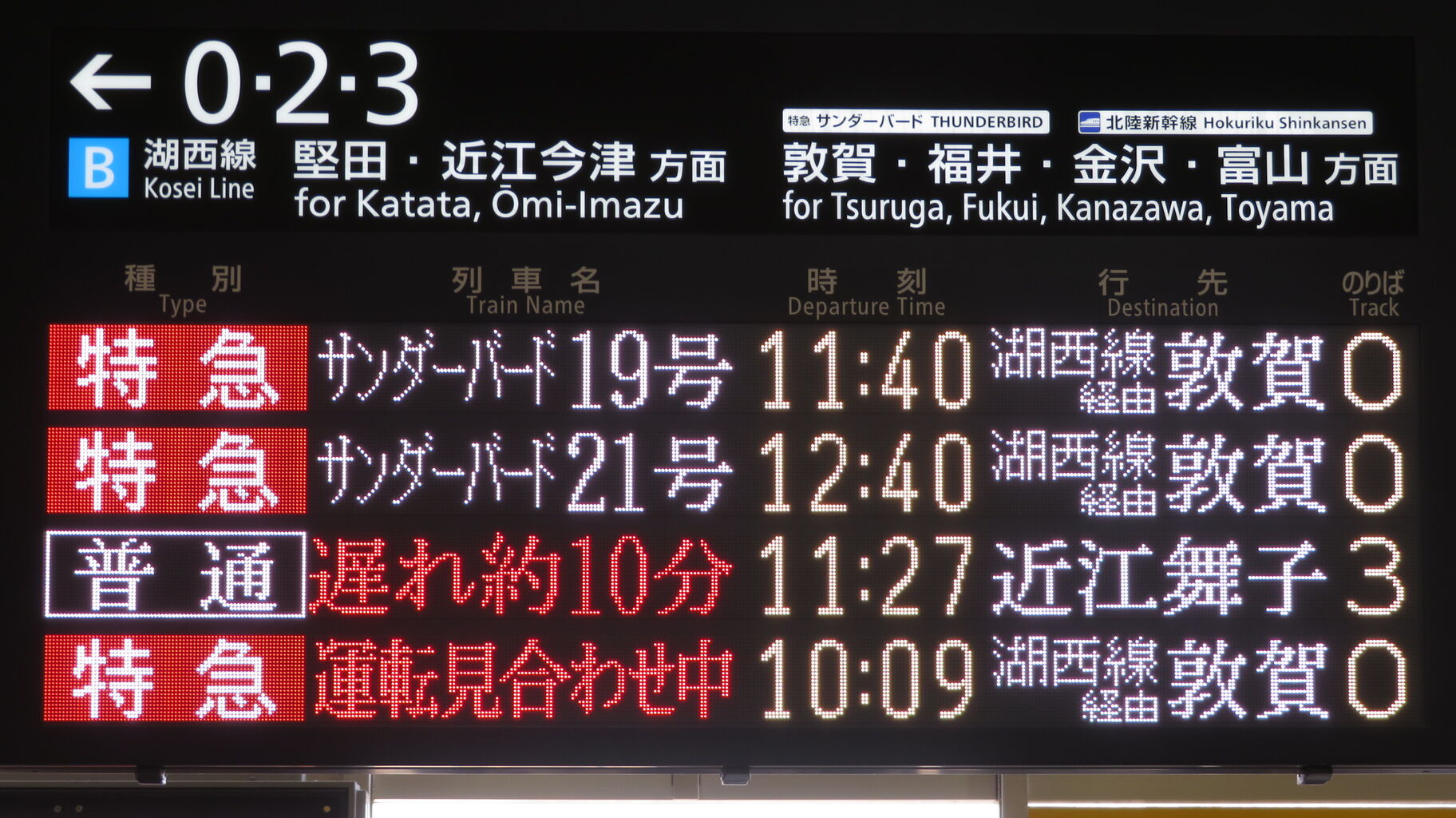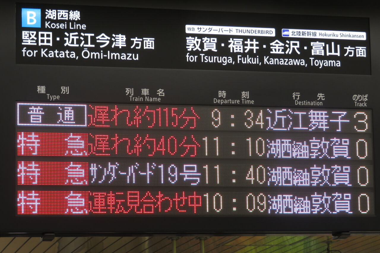 115分遅れの普通 近江舞子行きが発車すると、湖西線の発車標が4段全てサンダーバードで占められました。