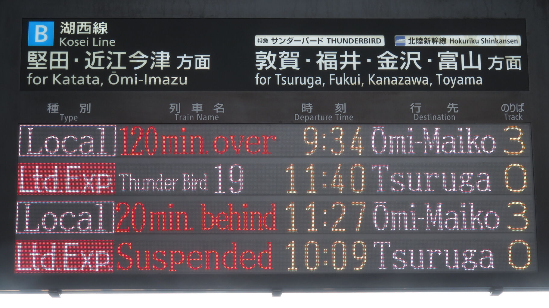 以上、京都駅で撮影した 「運転見合わせ中」 表示を紹介しました。