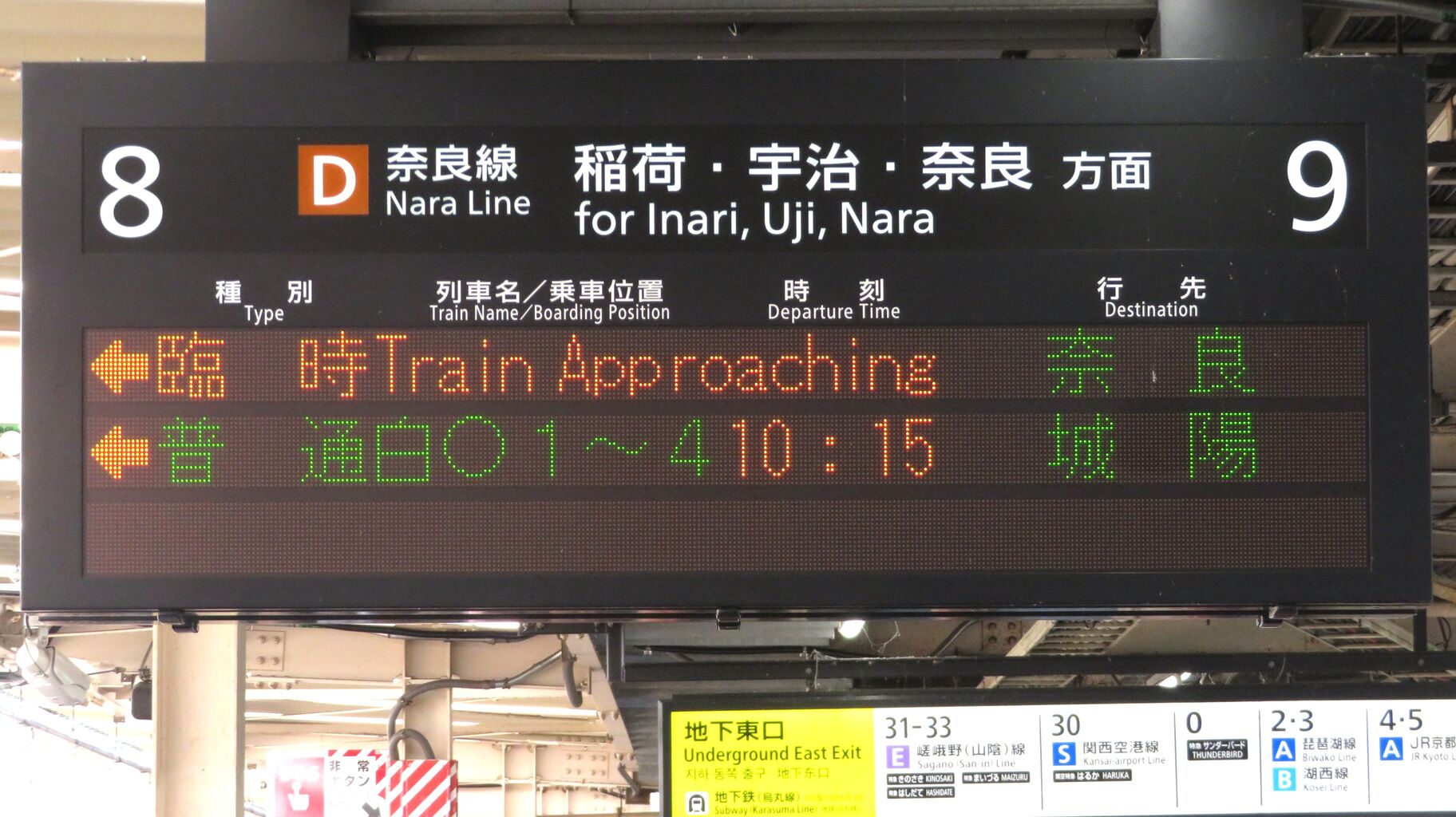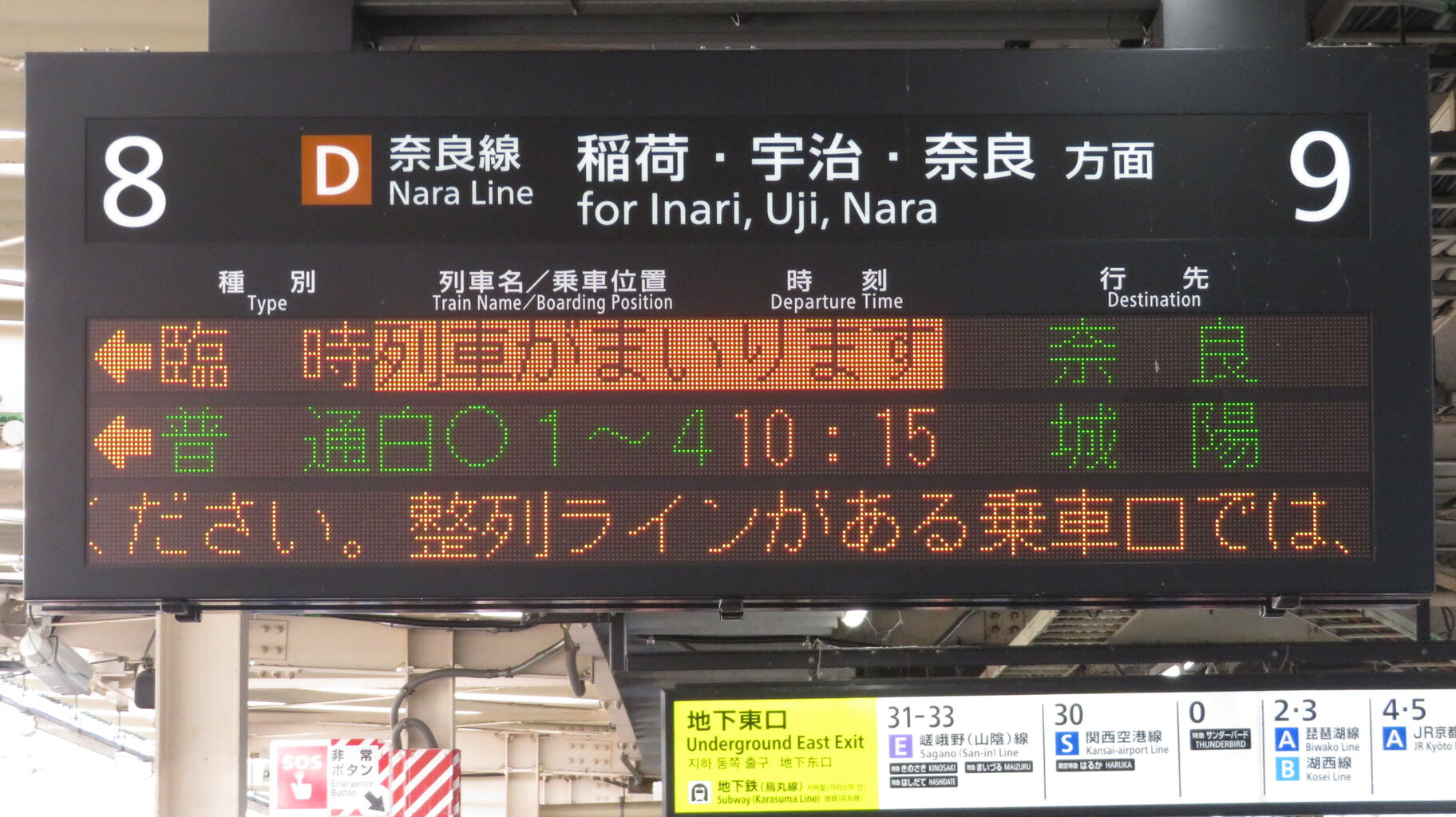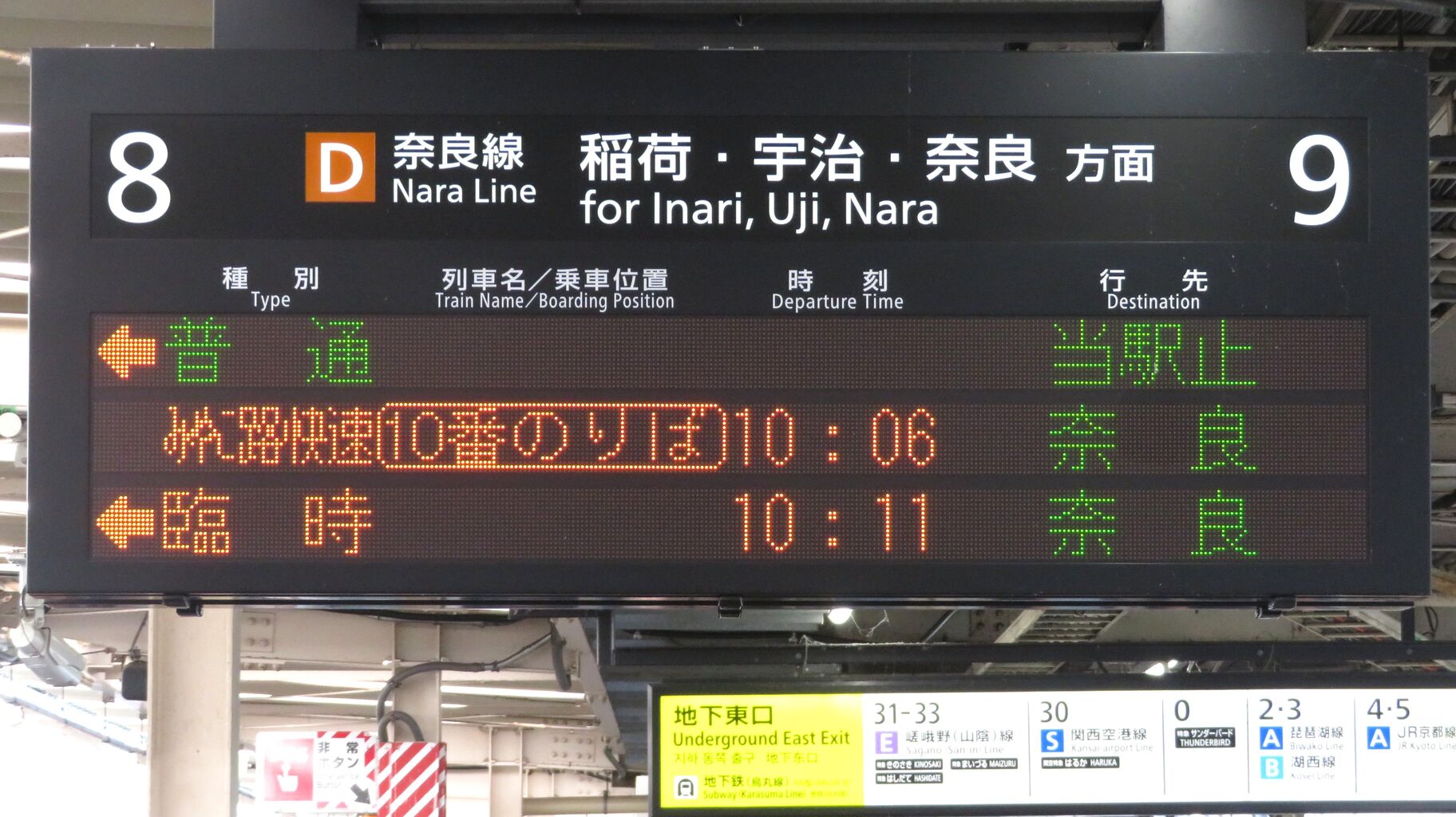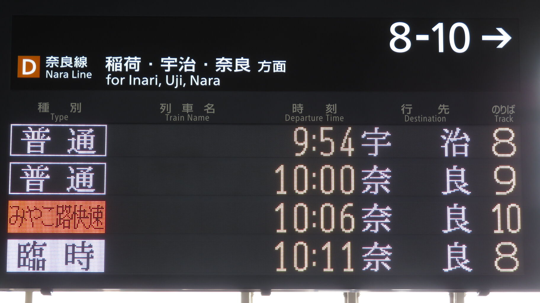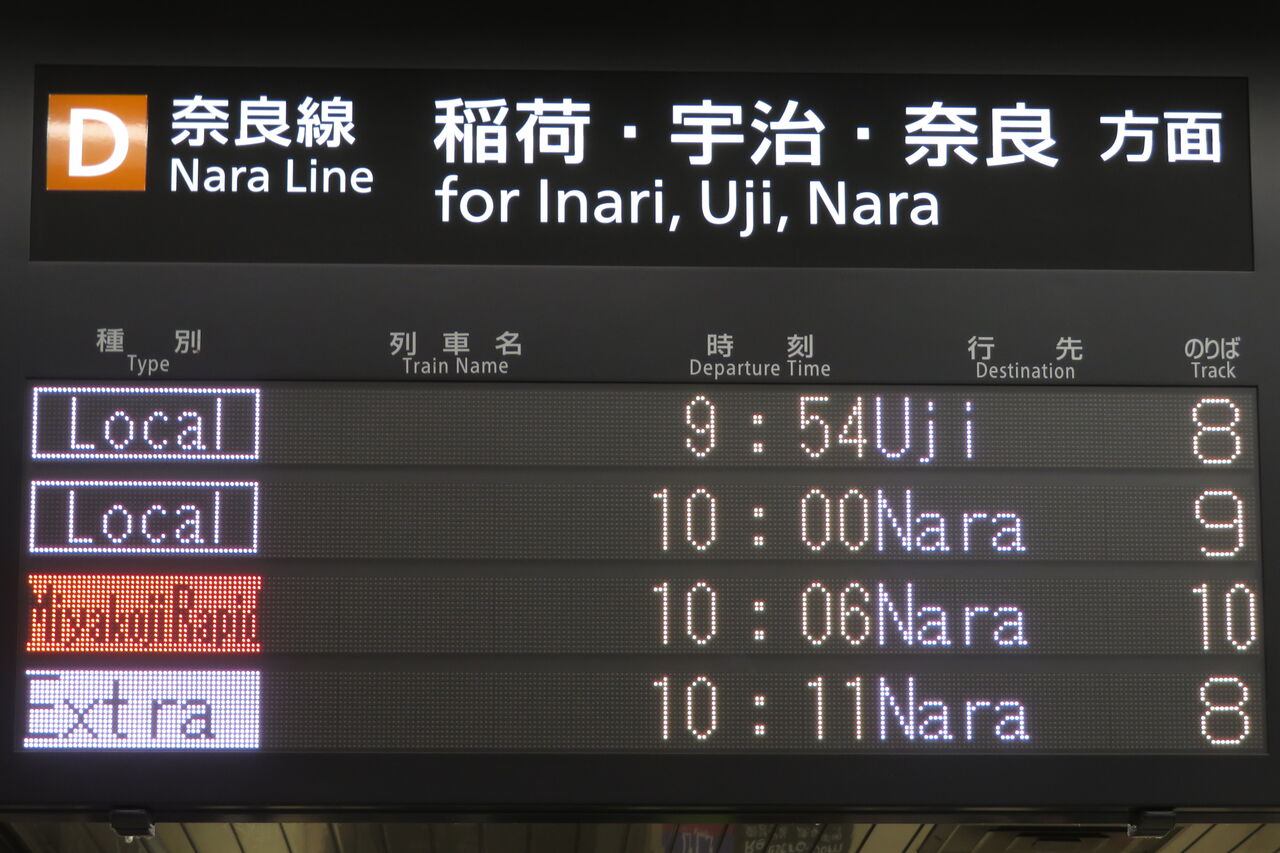 8・9番のりばに設置されている発車標に、「臨時 奈良行き」 が表示されました。