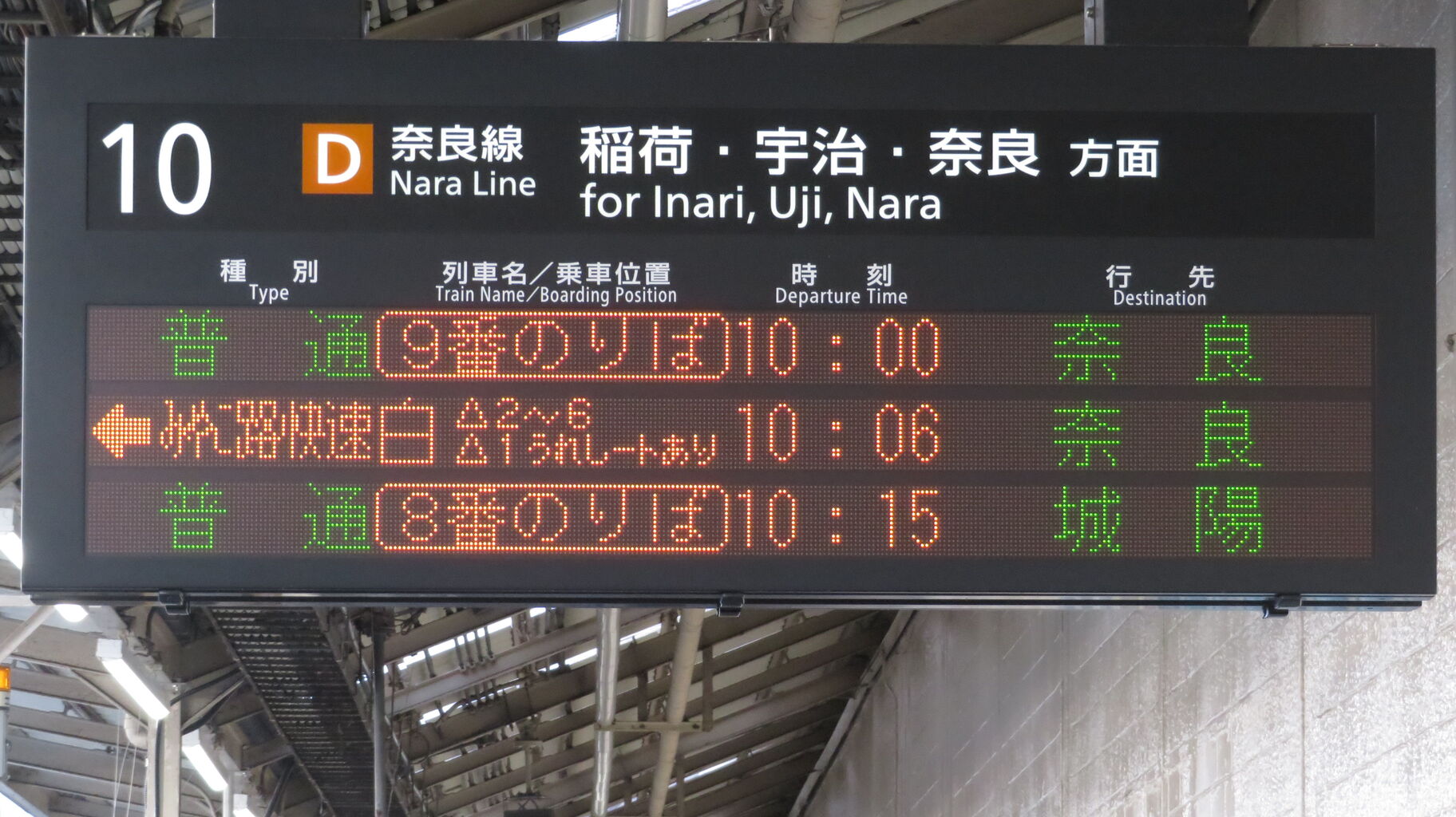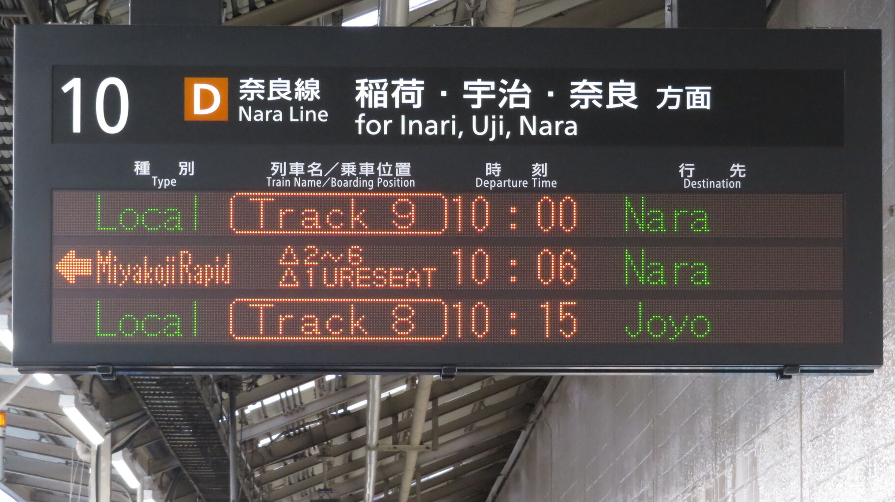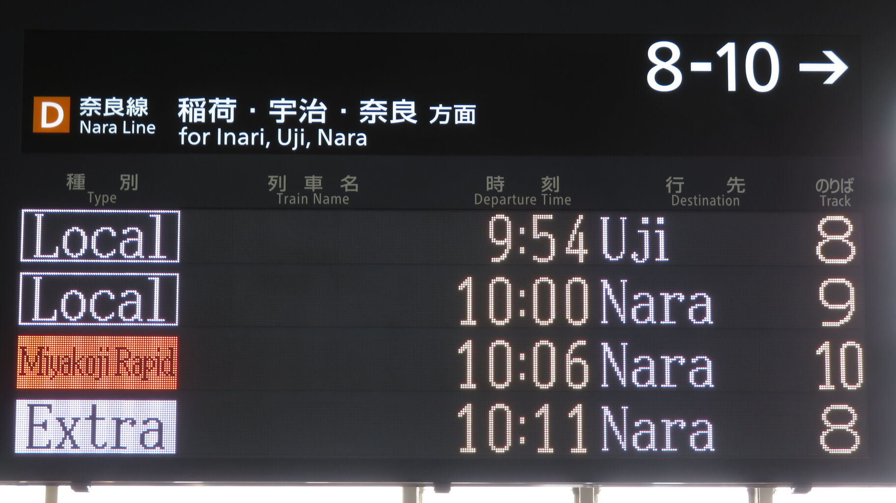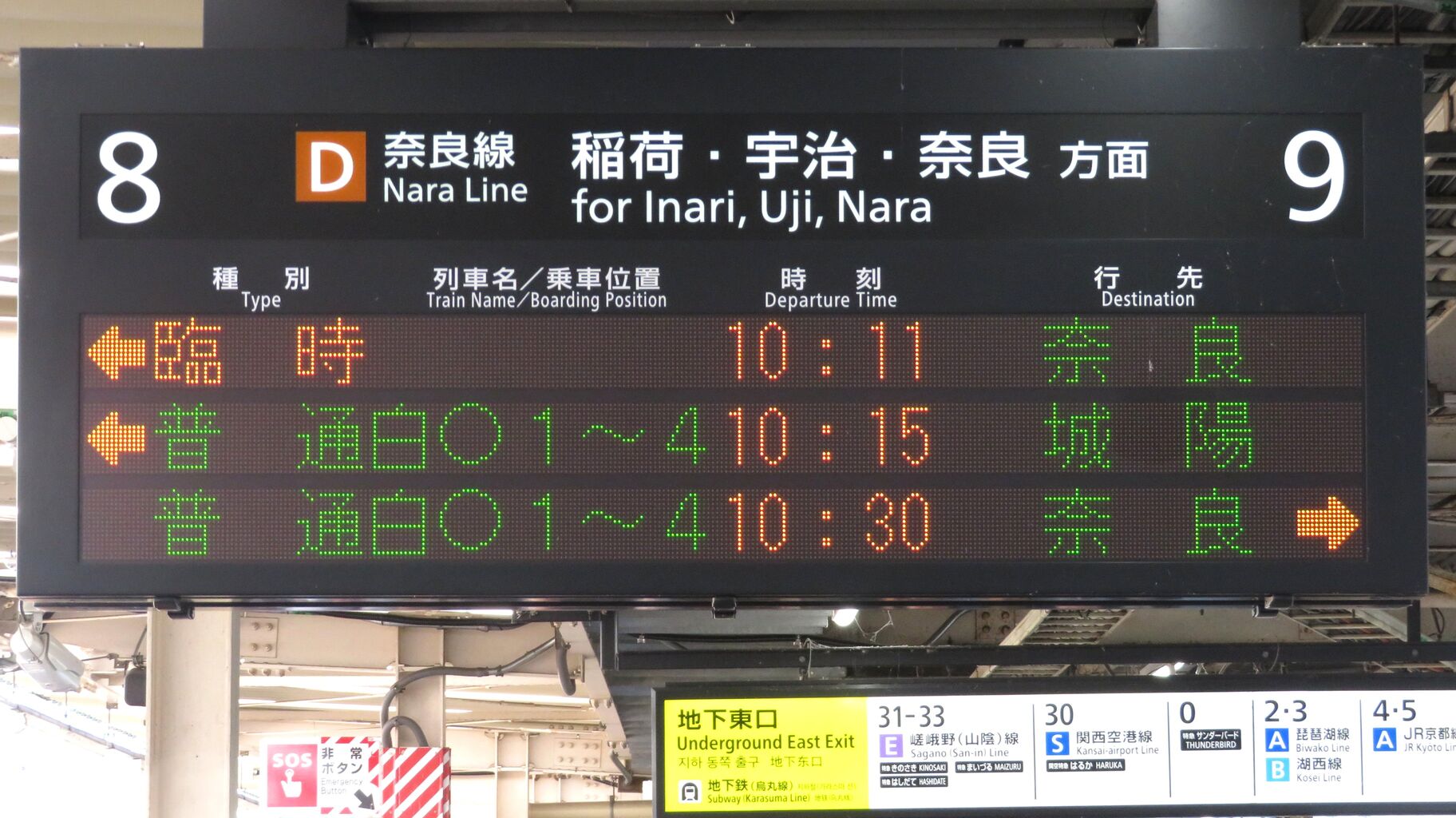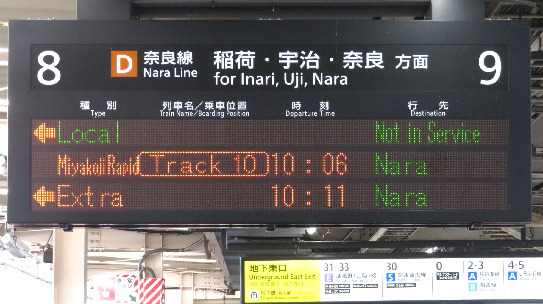 8・9番のりばに設置されている発車標に、「臨時 奈良行き」 が表示されました。