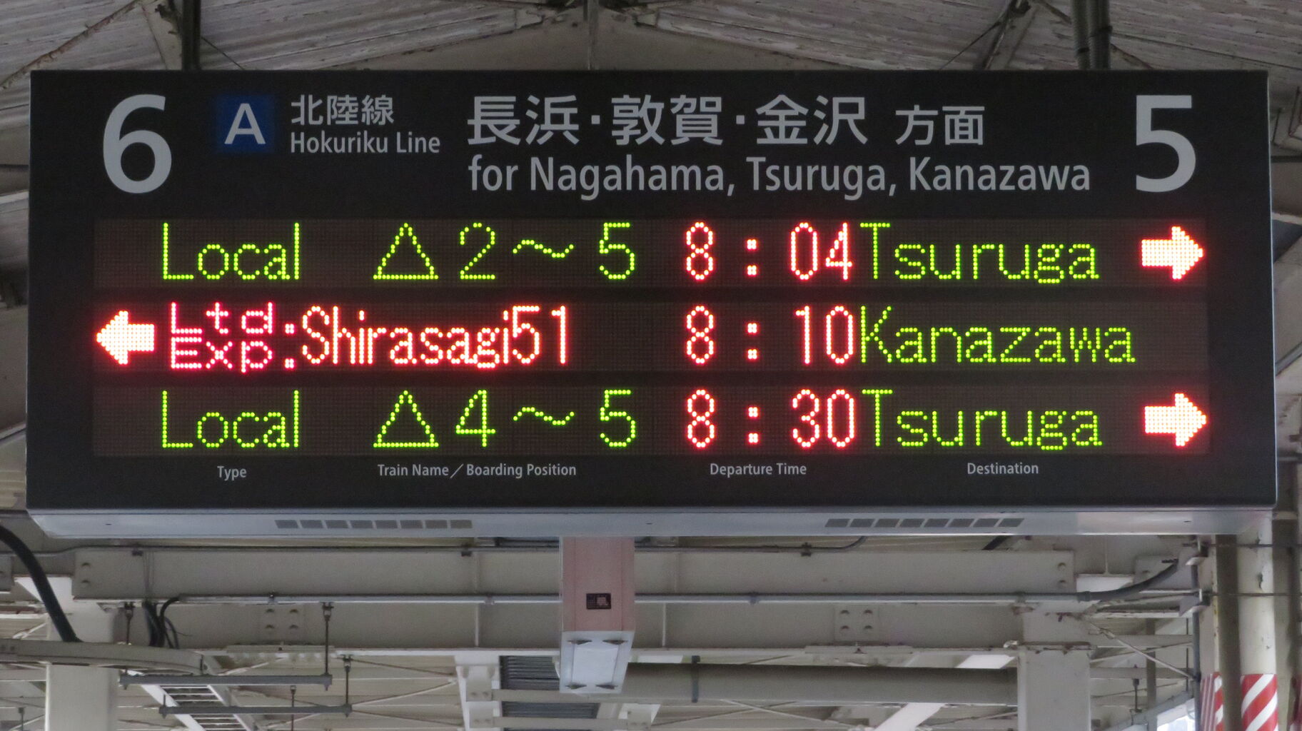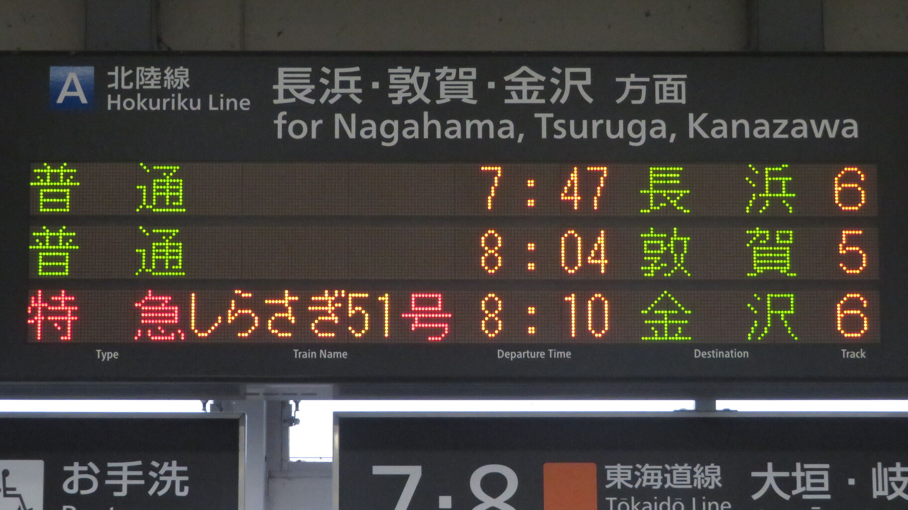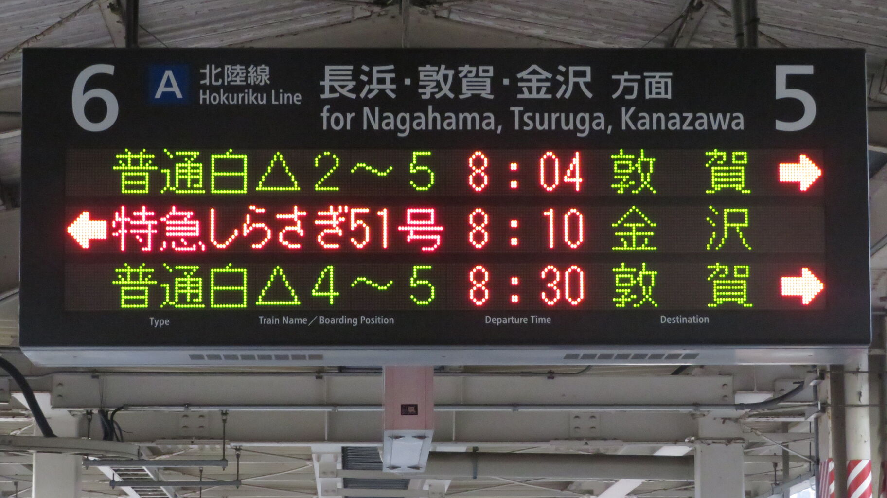 こちらも、特急しらさぎ51号の矢印が6番のりば側に出ています。