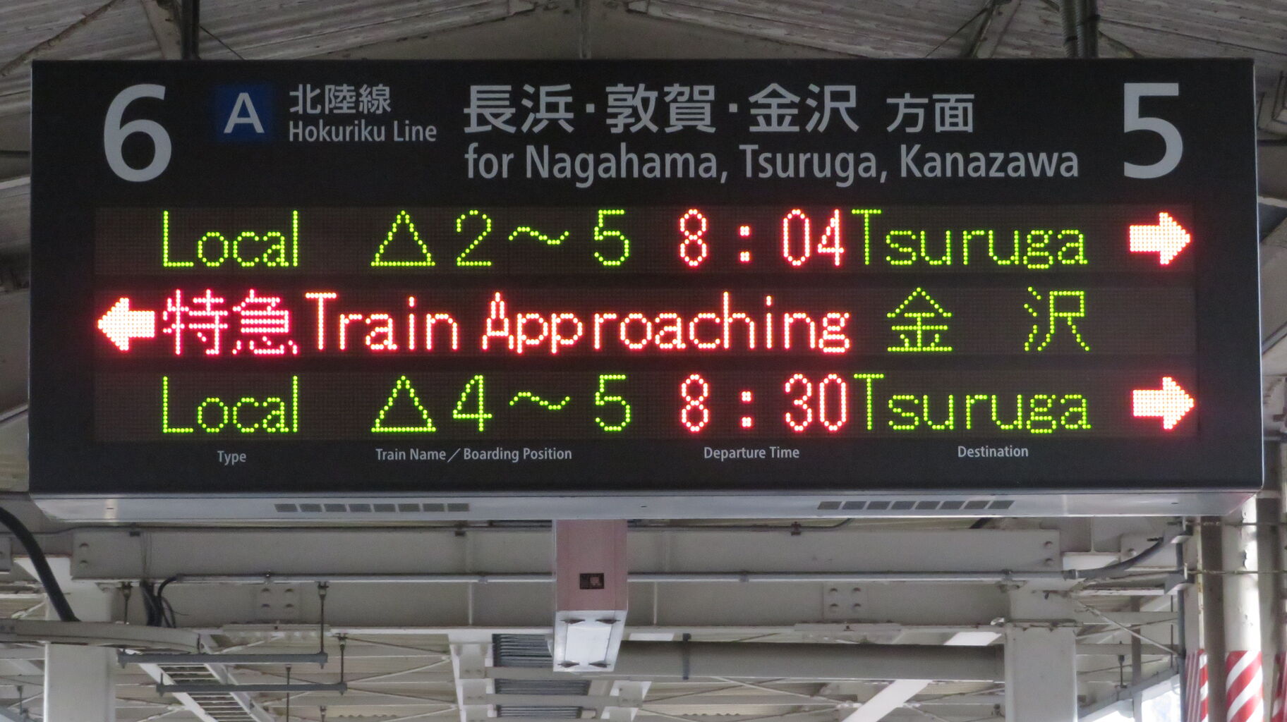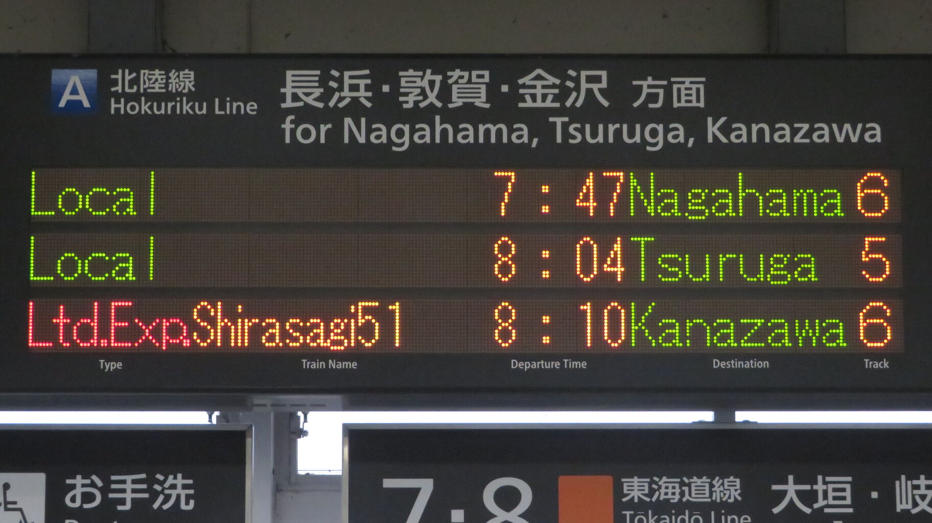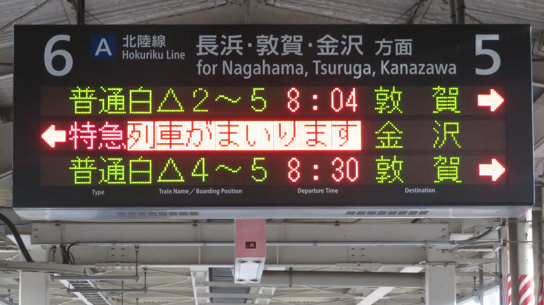 こちらも、特急しらさぎ51号の矢印が6番のりば側に出ています。
