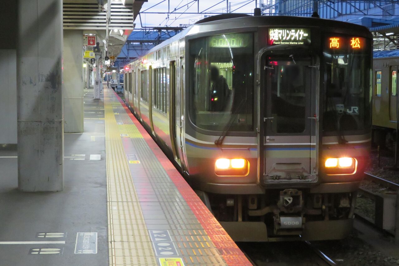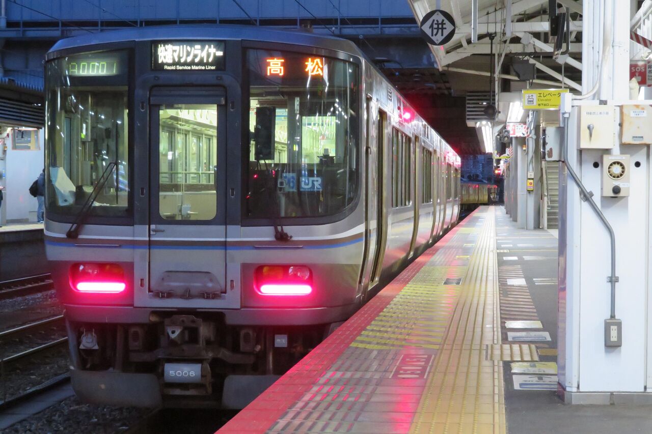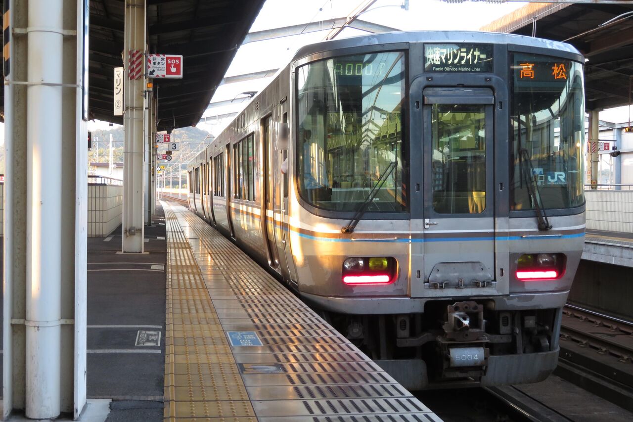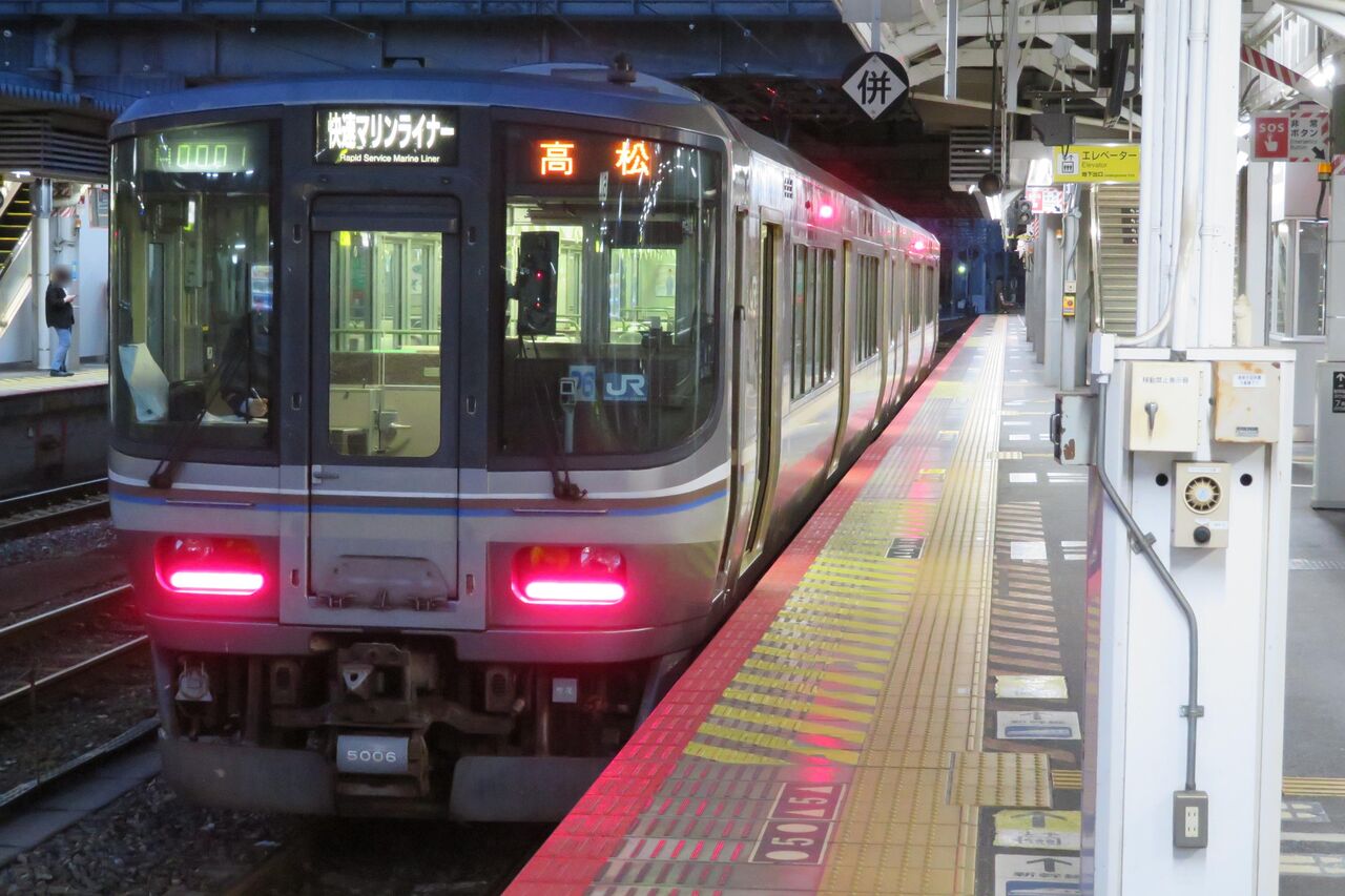 多くの列車は、JR四国の5000系(3両)にJR西日本の223系(2両)を連結した5両編成で運転されますが、早朝や深夜には 2両編成で運転される列車もあります。