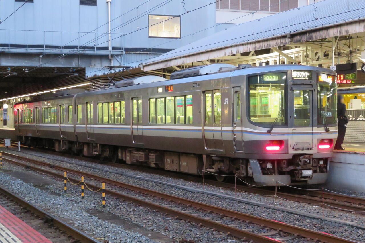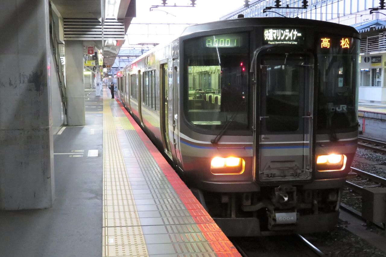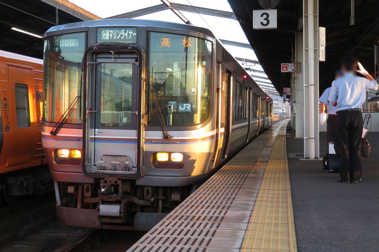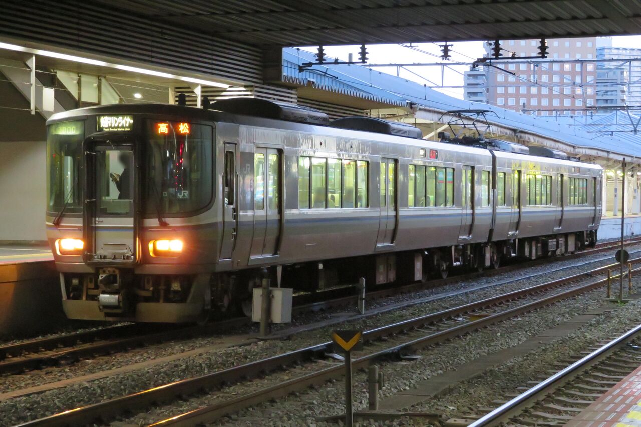 多くの列車は、JR四国の5000系(3両)にJR西日本の223系(2両)を連結した5両編成で運転されますが、早朝や深夜には 2両編成で運転される列車もあります。
