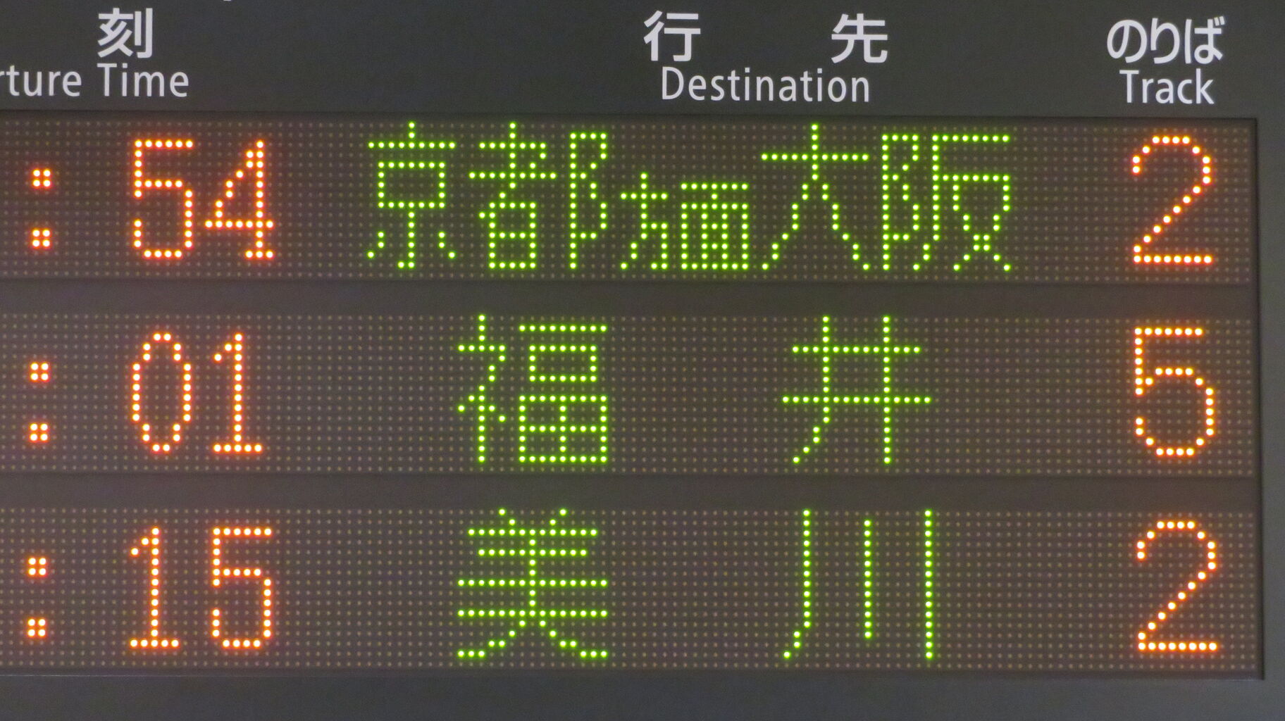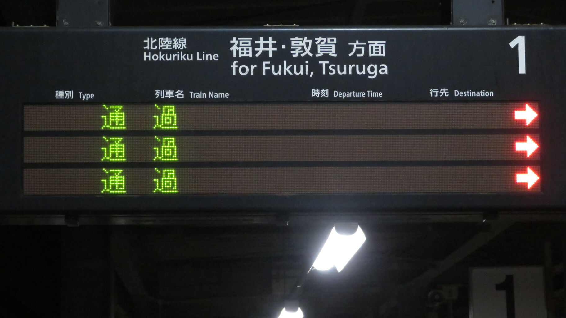 通過列車が2本以上連続する場合、京阪神地区や岡山・福山地区の駅の発車標だと 通過表示は1段にまとめて表示されますが、北陸地区の発車標は この通り 1本1本分けて表示されます。