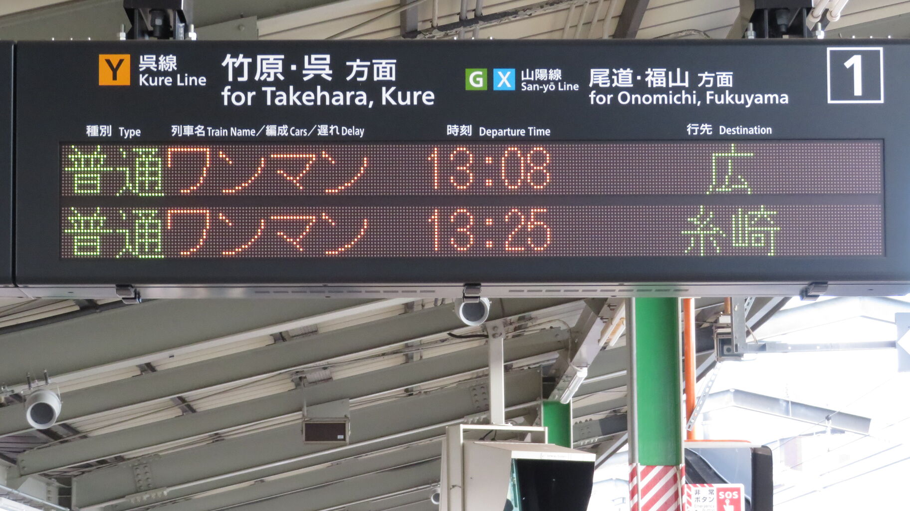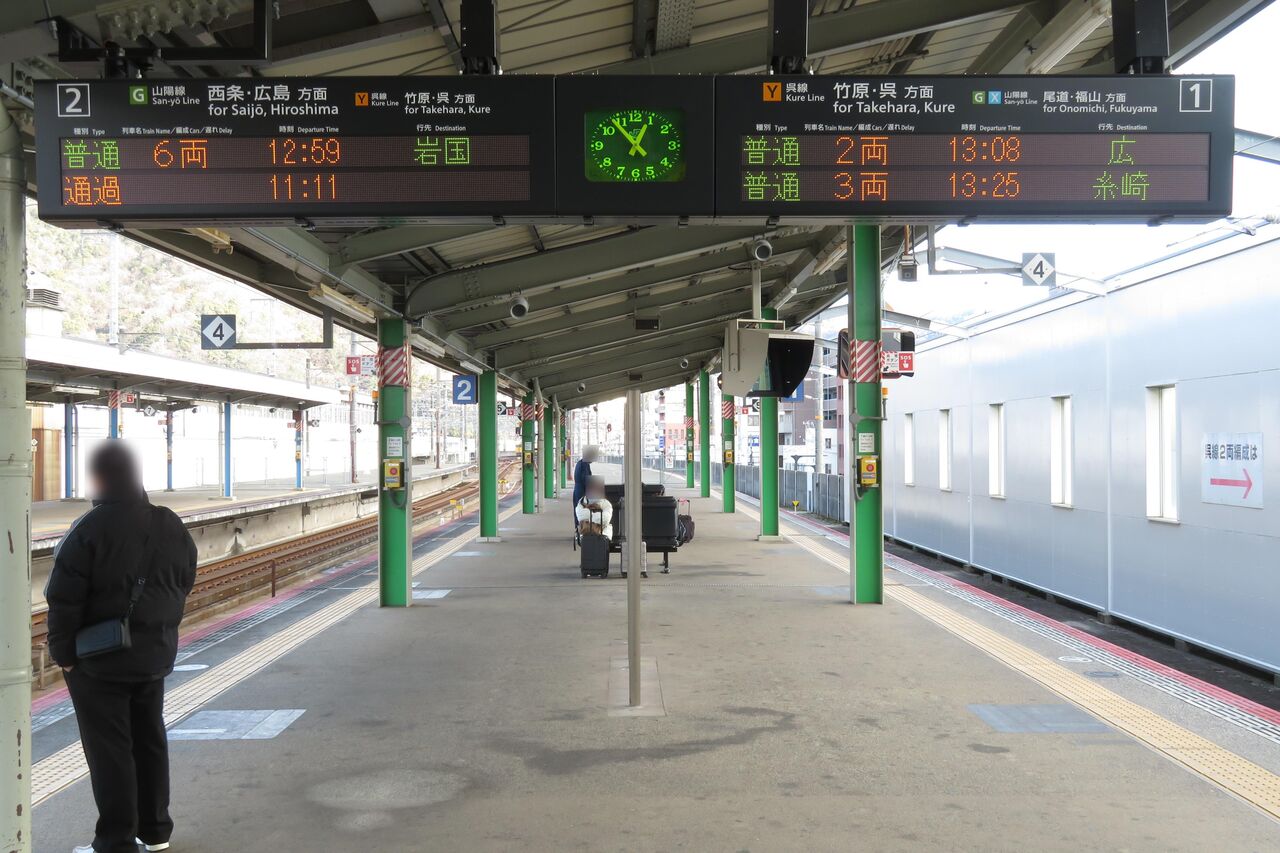 1番のりばは 呉線のりばとなっており、呉線から山陽線 糸崎方面へ直通する列車も発着します。
