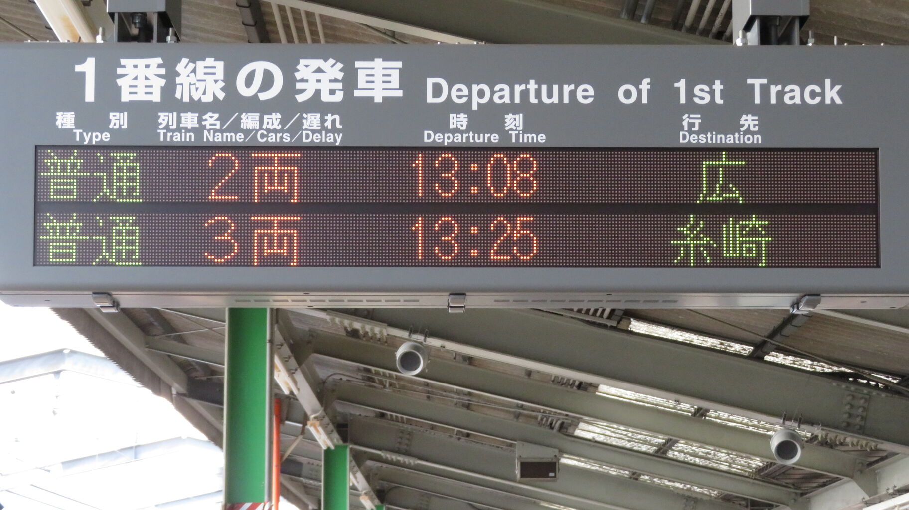 三原駅の在来線ホームに設置されている発車標は、上の写真のように 「○番線の発車 Departure of ○ Track」 と書かれているのが特徴的です。