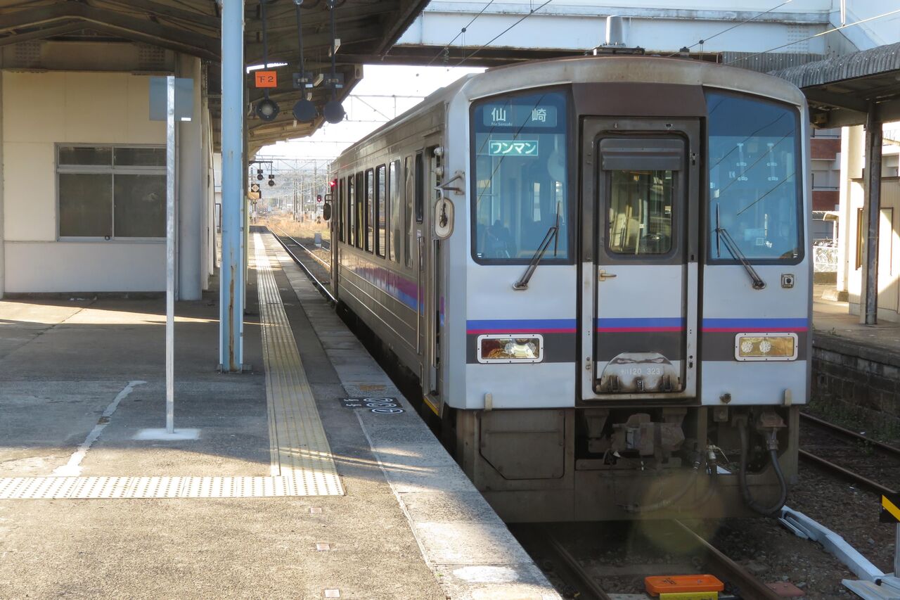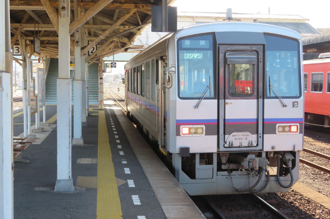 ※長門市駅 2番のりばに停車中の普通 厚狭行き。キハ120形気動車です。(2023年3月撮影)