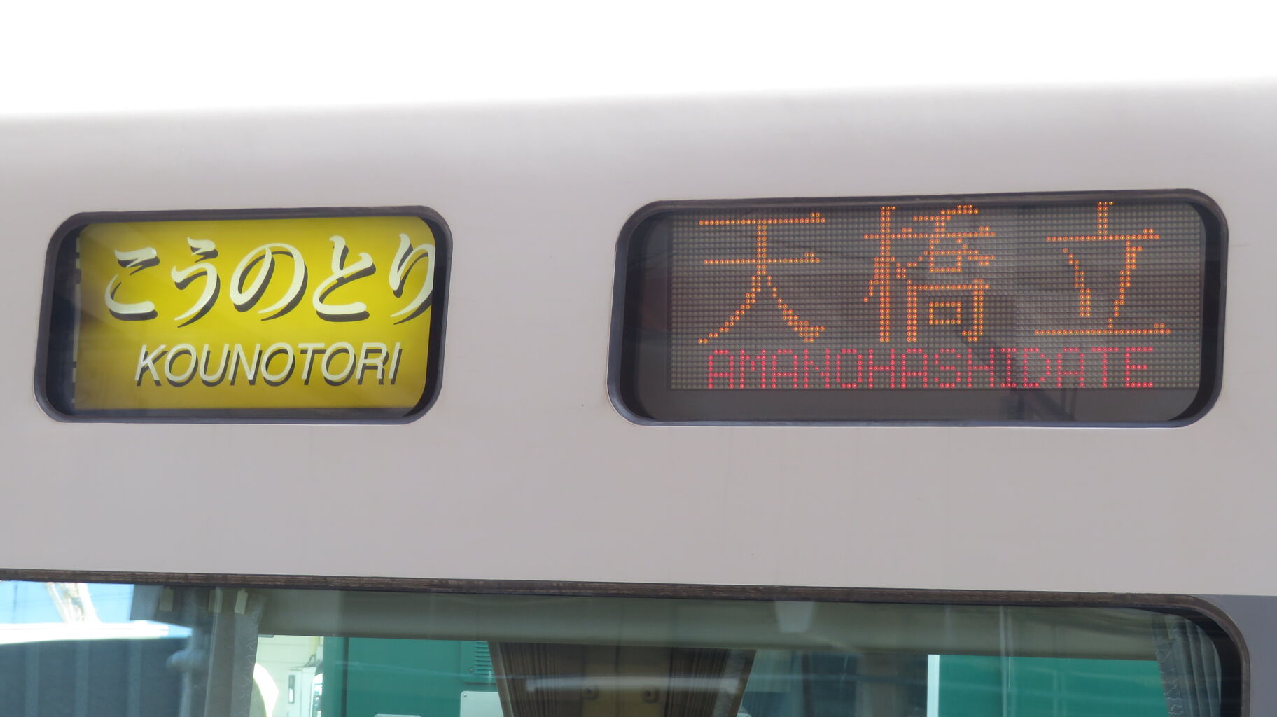 こうのとりの英語表示は、新大阪駅や大阪駅では 「Kōnotori」 でしたが、宮津駅では 「Kounotori」 となっていました。