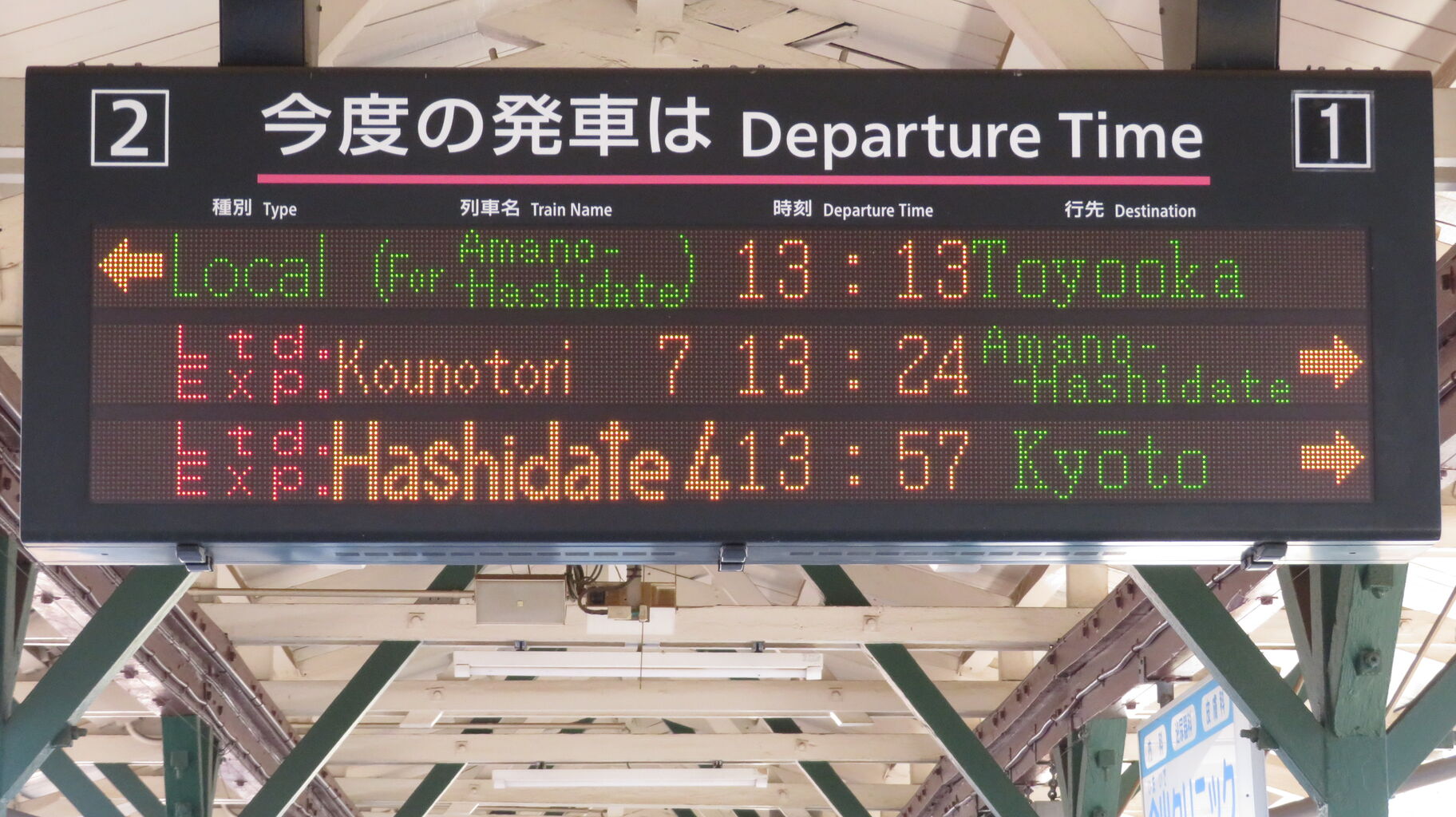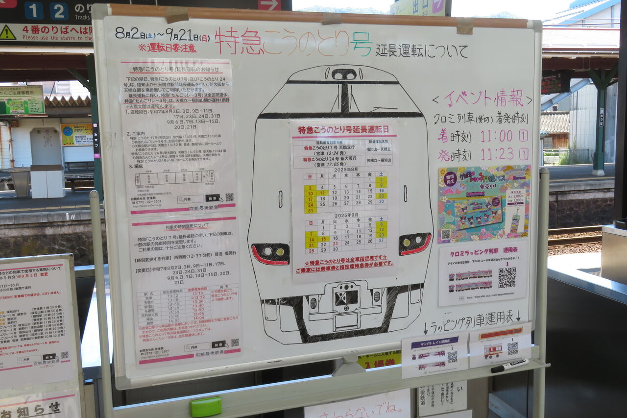 一番下の段には、「特急こうのとり号 天橋立行 の停車駅は 終点天橋立 です。」 とスクロール表示が流れていました。