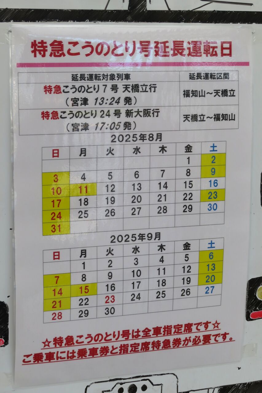 京都駅発着の特急 「はしだて」 と違って、通常は京都丹後鉄道に乗り入れませんが、2025年8月から9月にかけて、福知山駅発着の1往復が天橋立駅まで延長運転されました。