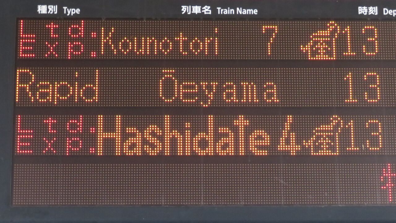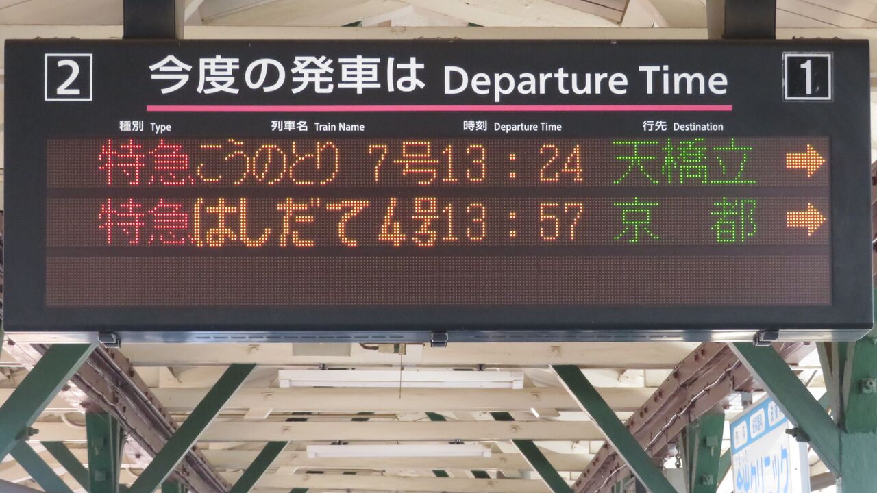 特急 「はしだて」 が太い文字で表示されるのに対し、「こうのとり」 は細い文字で表示されています。
