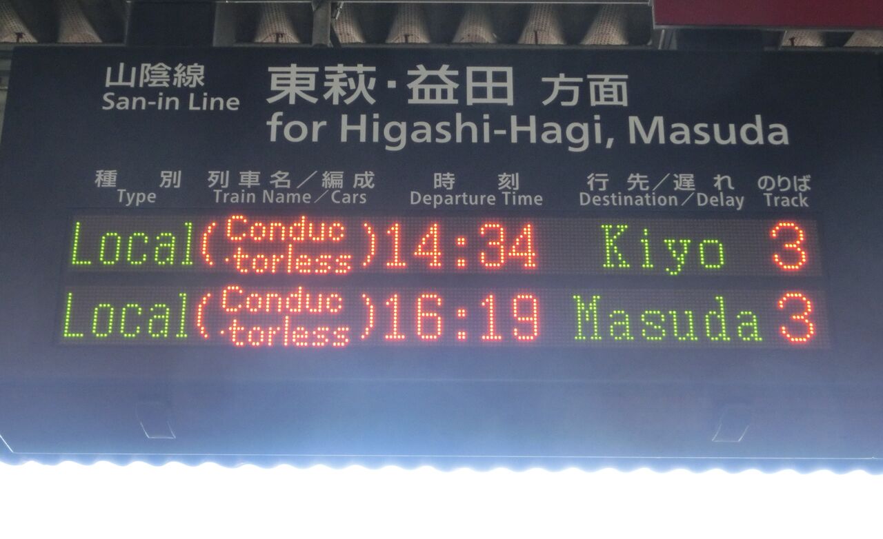 長門市駅から益田方面へ向かう普通列車は、8本中5本が益田行き、2本が東萩行きです。