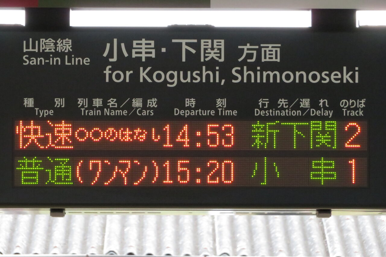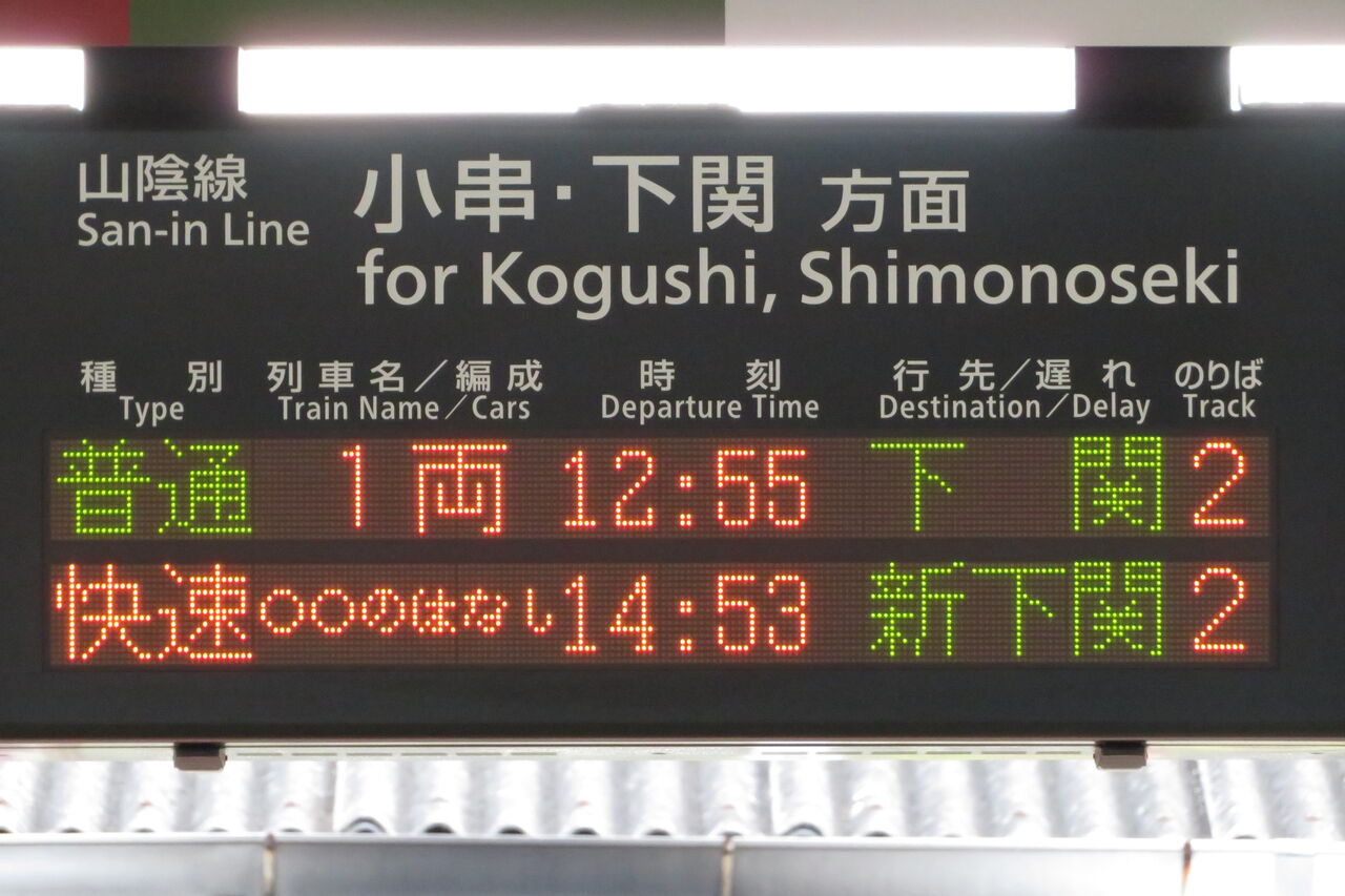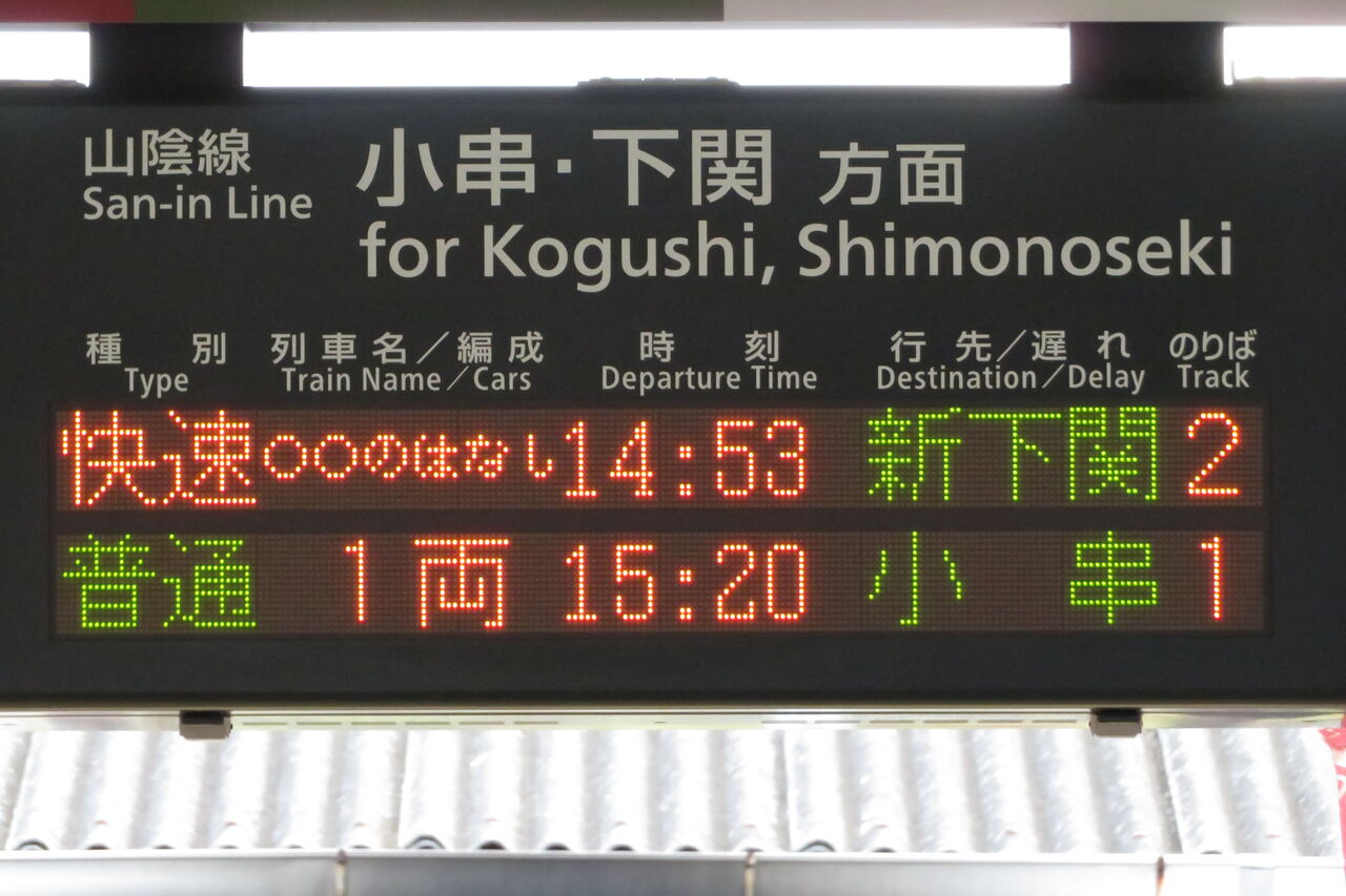 隣にある山陰線 下関方面の発車標には、○○のはなし 「新下関行き」 の表示が出ていました!