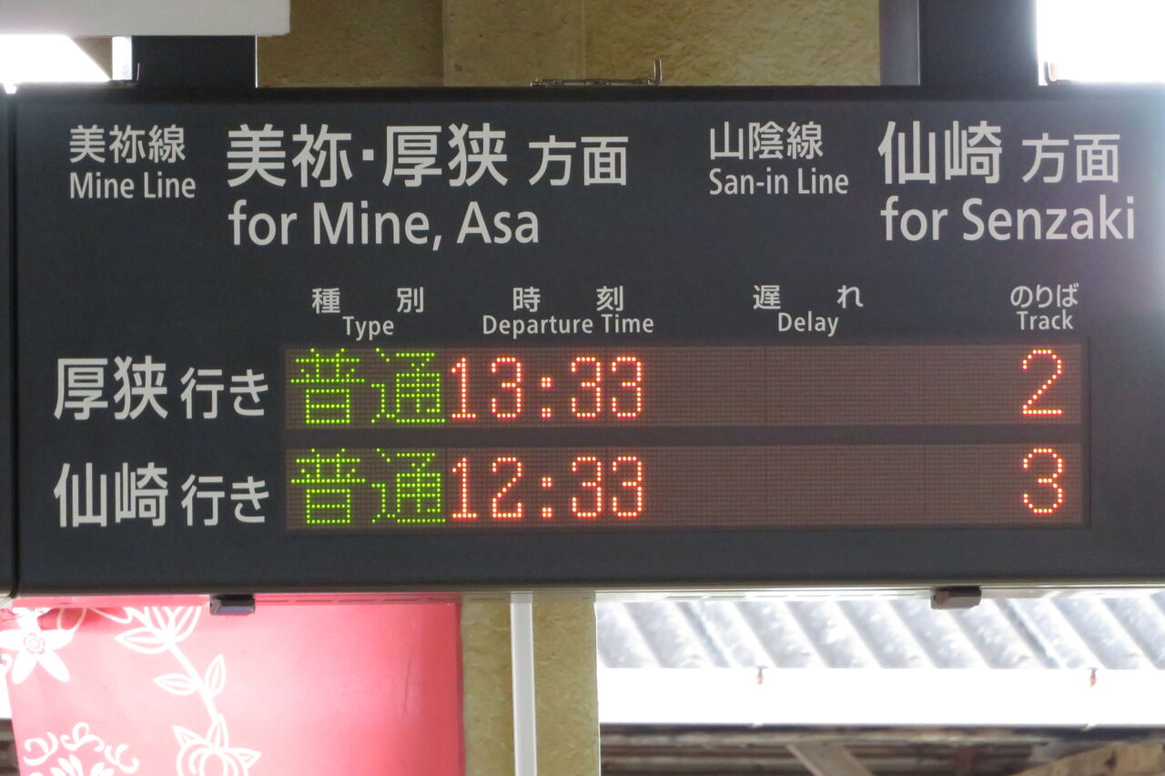 美祢線は厚狭行き、仙崎支線は仙崎行きと 行き先が固定されているため、時刻と のりばの間が 遅れ表示専用となっています。