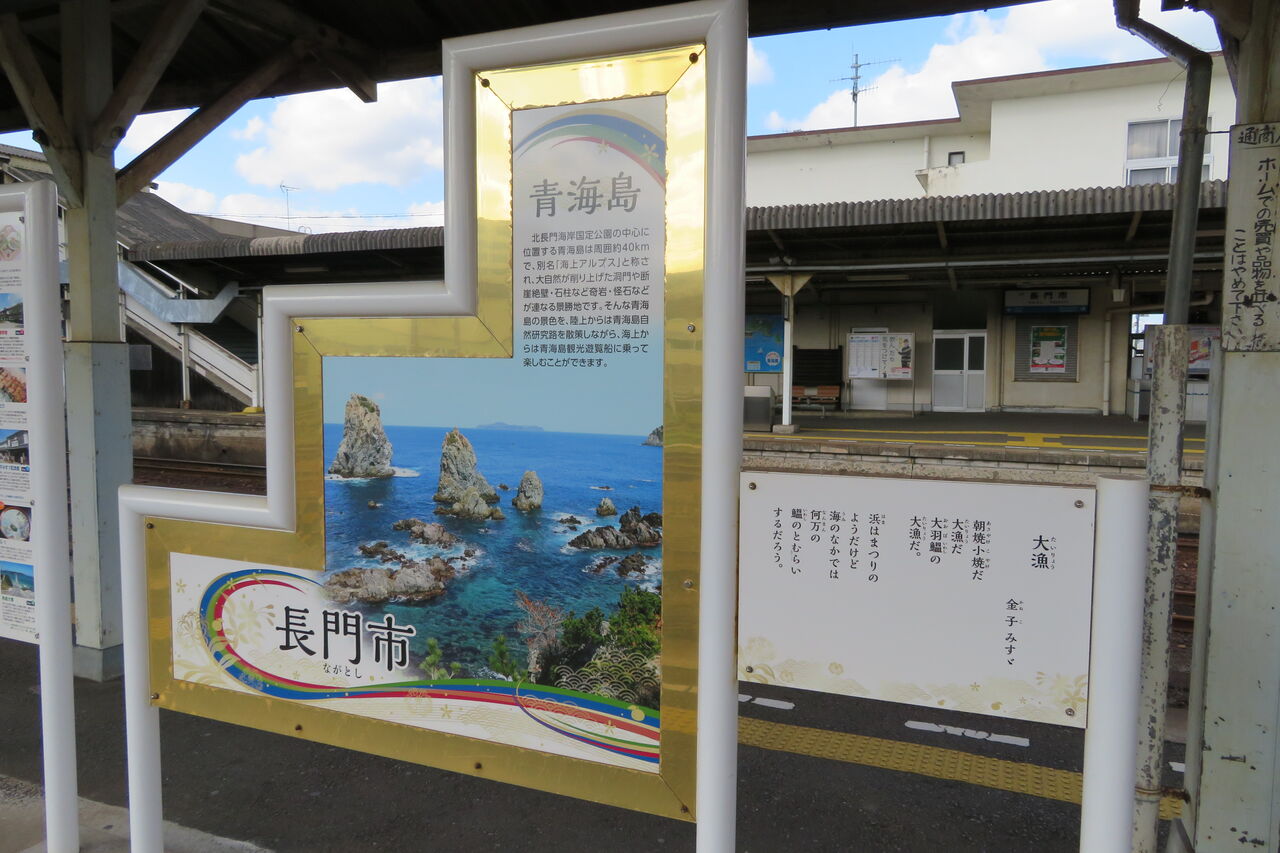 長門市駅にある表示プレートは階段形(?)で、青海島の写真が掲示されています。