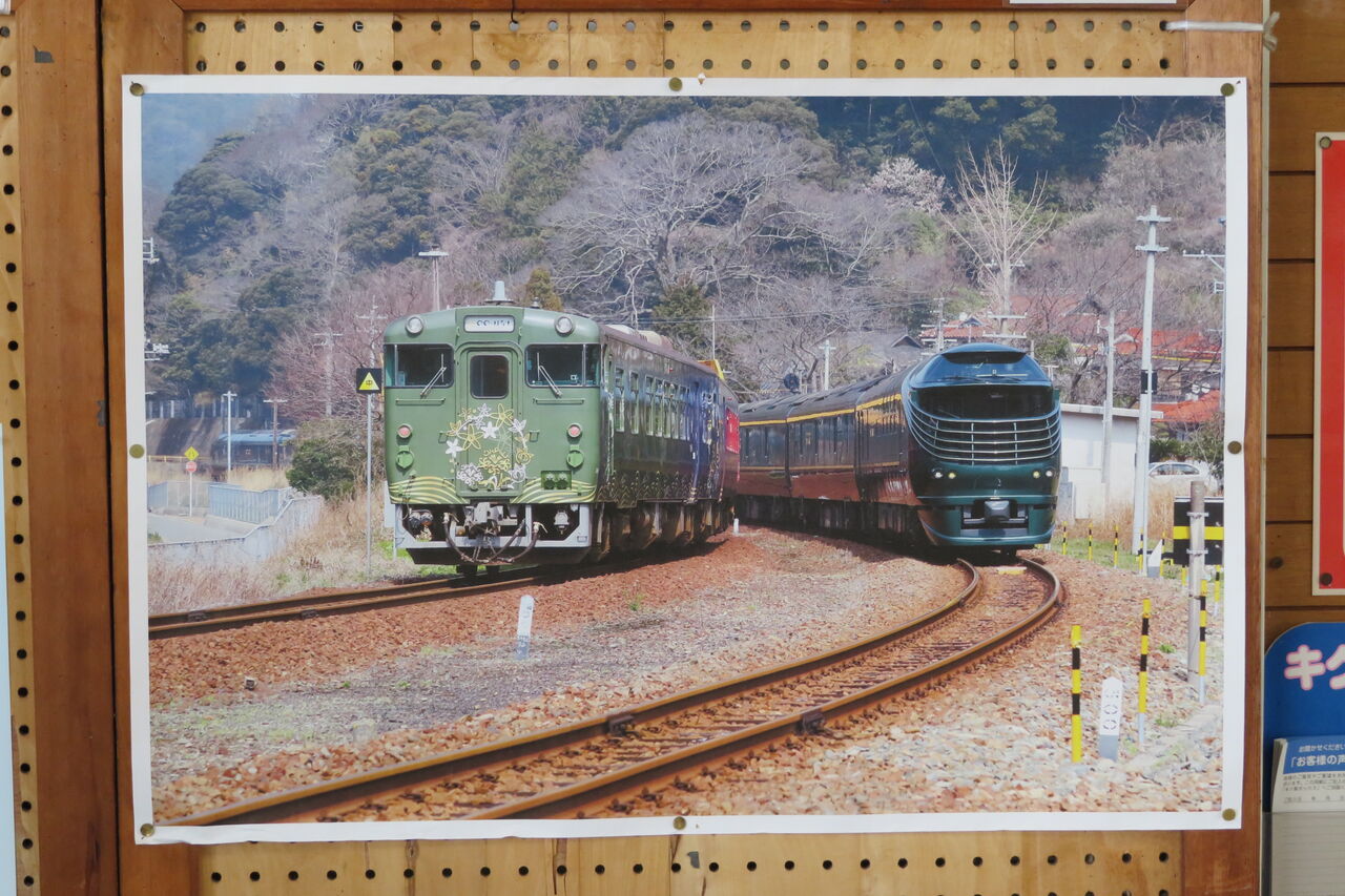 ○○のはなしが JR西日本の豪華寝台列車 「TWILIGHT EXPRESS 瑞風」 とすれ違うところを収めた写真が掲示されていました。