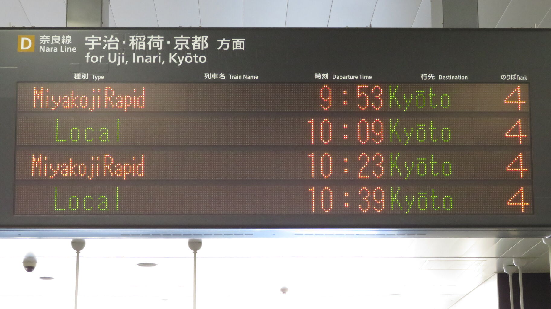 日中の時間帯、奈良から京都方面へ向かう電車は、みやこ路快速と普通電車が毎時2本ずつ(どちらも30分間隔)となっています。